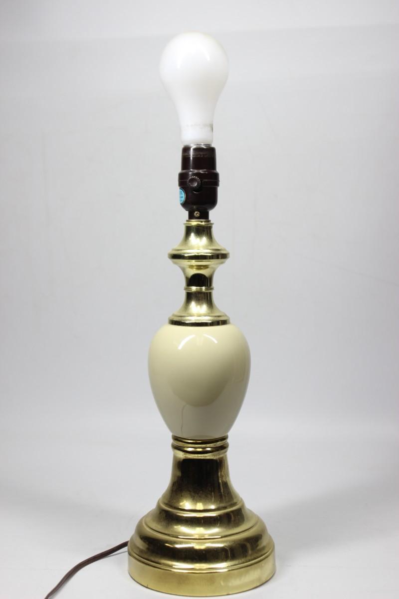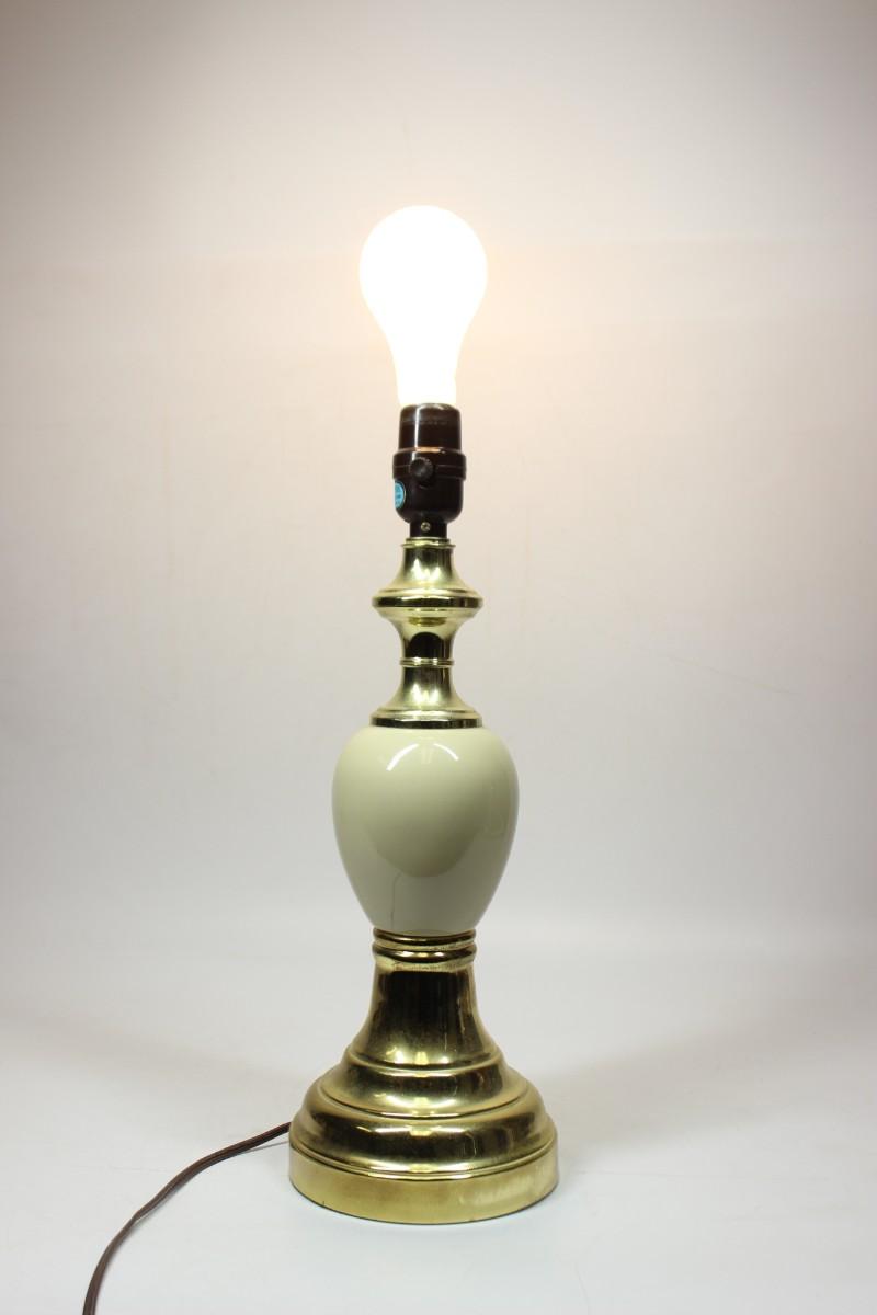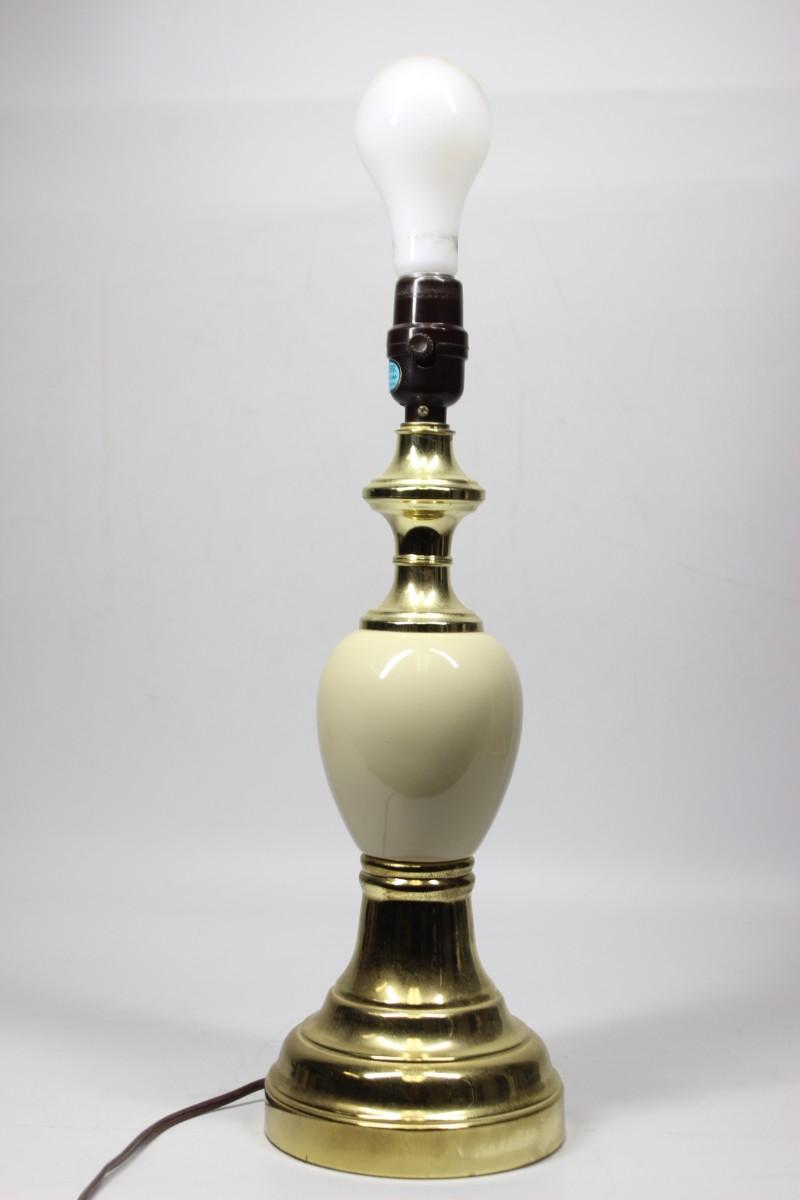 Small Midcentury Brass and Off-White Ceramic Table Reading Desk Lamp Light. Light works. About 16" size at bulb socket. In good vintage condition, no shade.