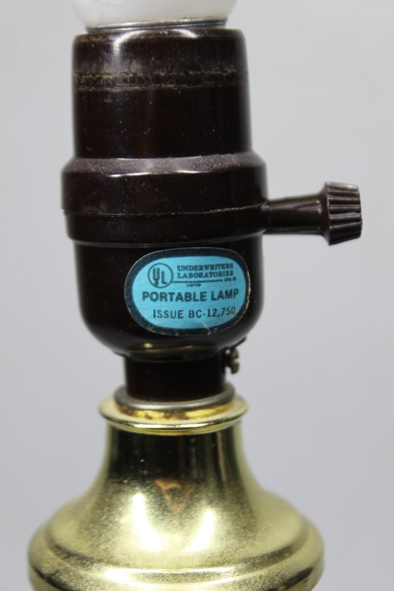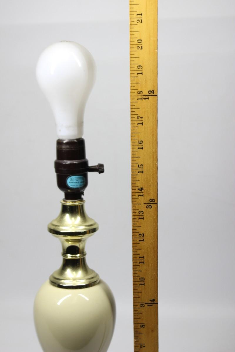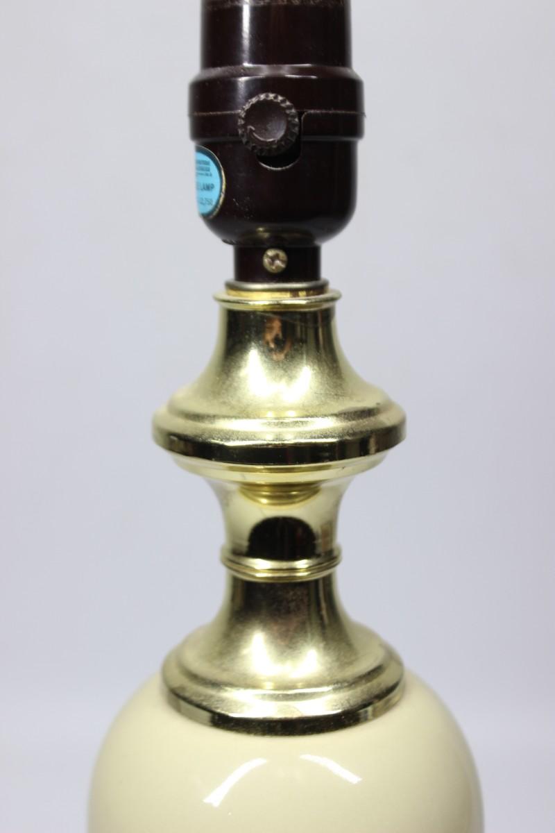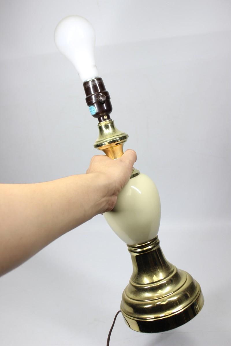 Small Midcentury Brass and Off-White Ceramic Table Reading Desk Lamp Light. Light works. About 16" size at bulb socket. In good vintage condition, no shade.