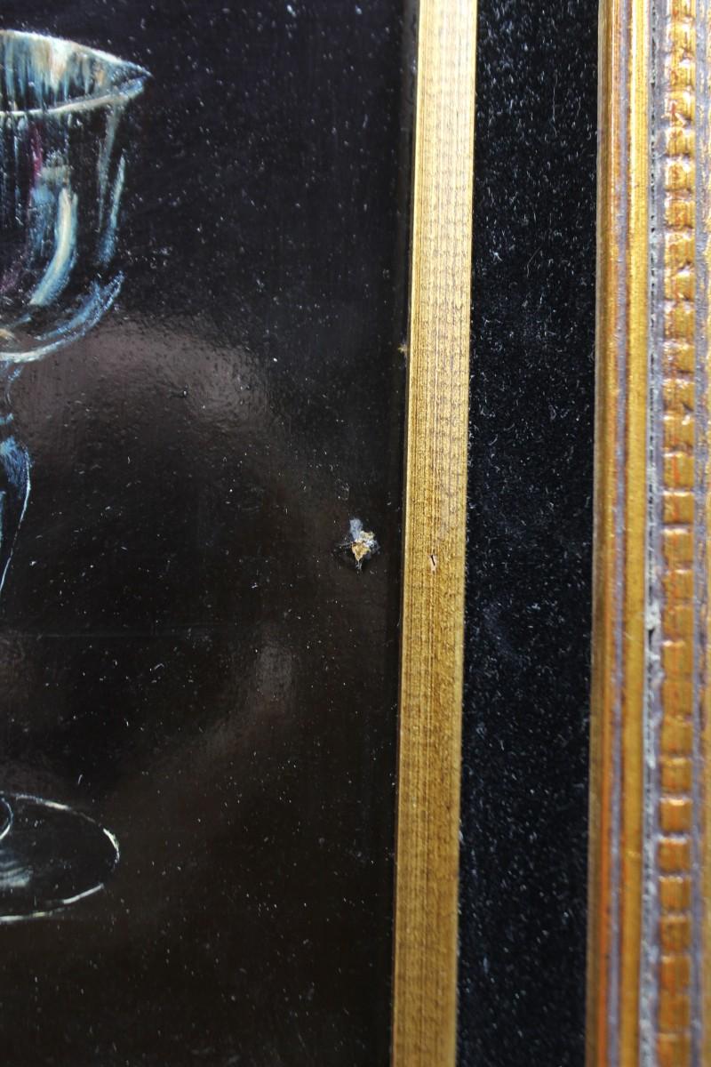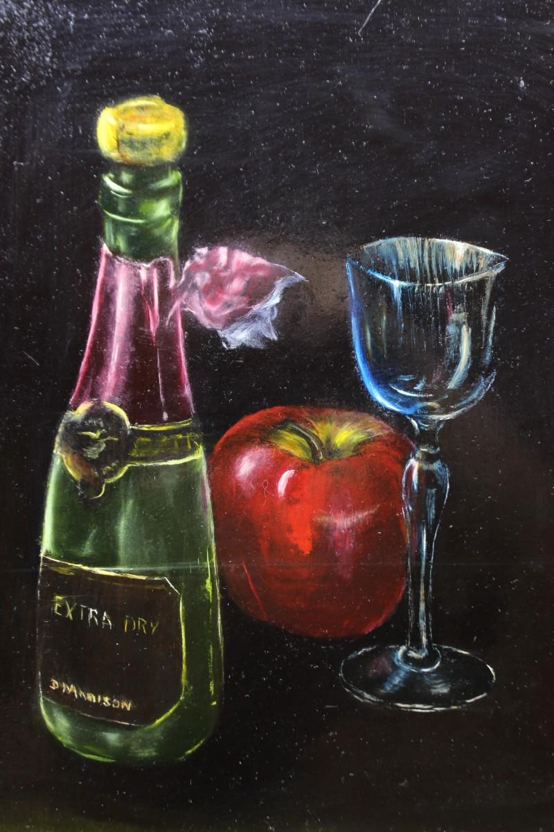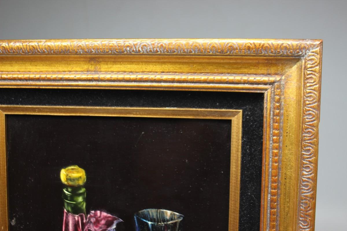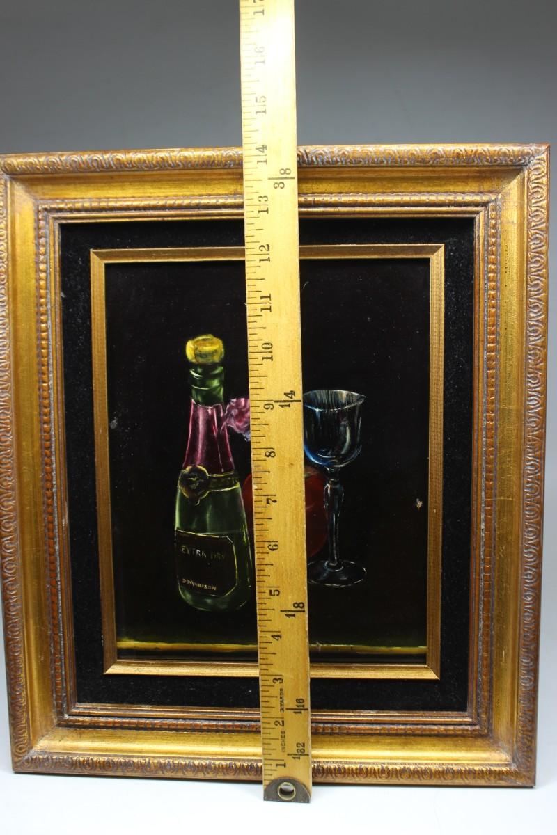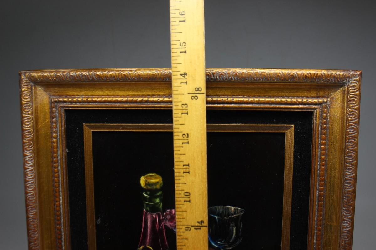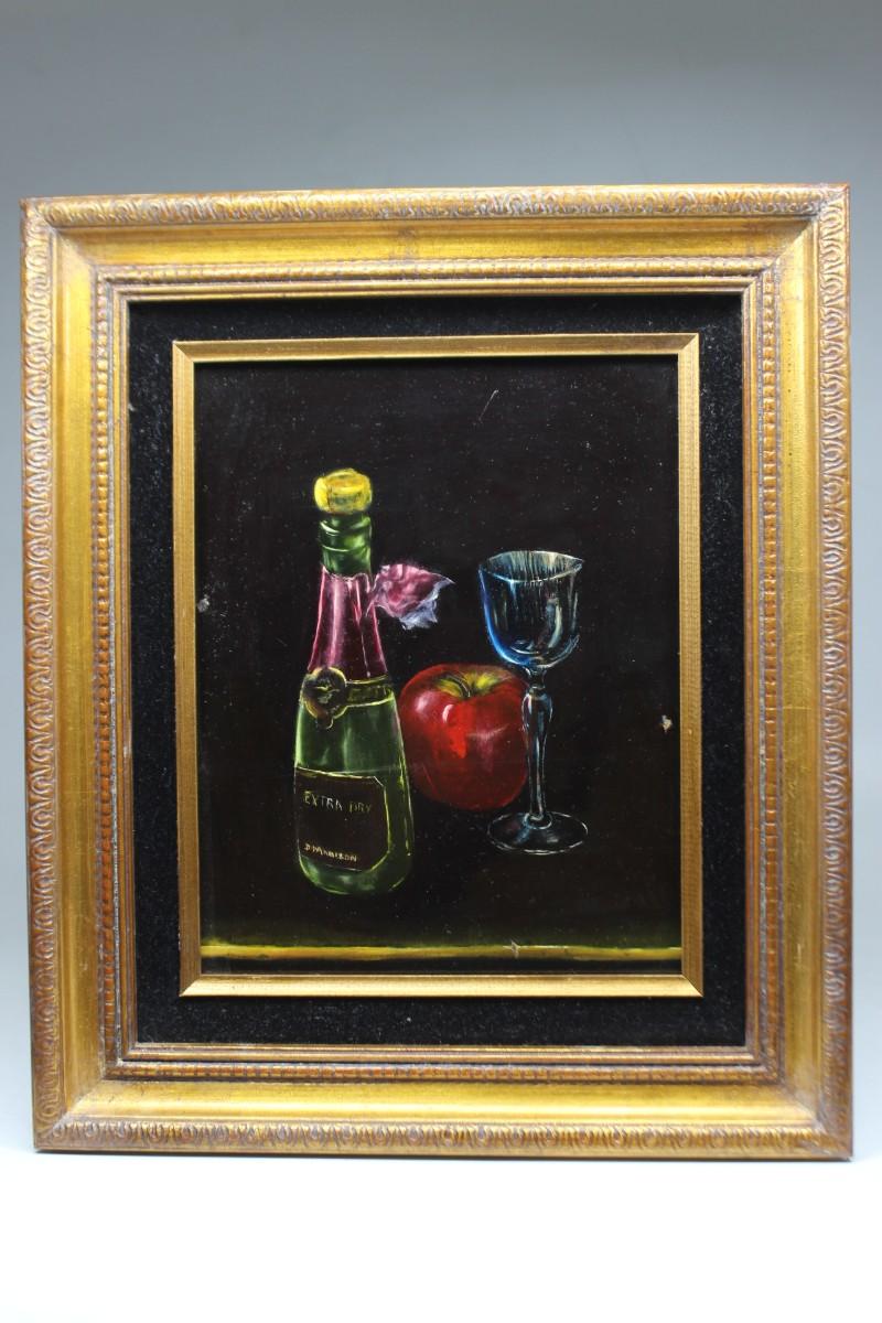 Retro Original Art Still Life Black Canvas WIne Bottle Apple & Drinking Glass