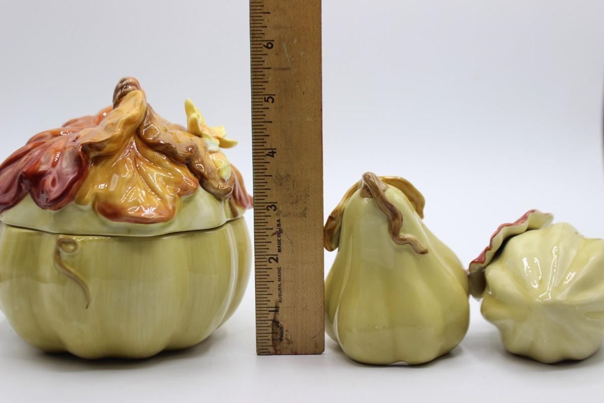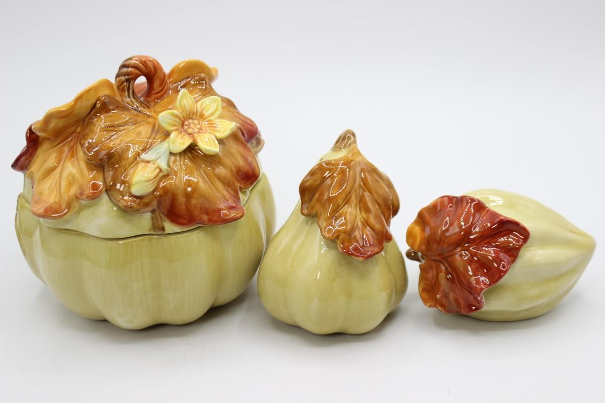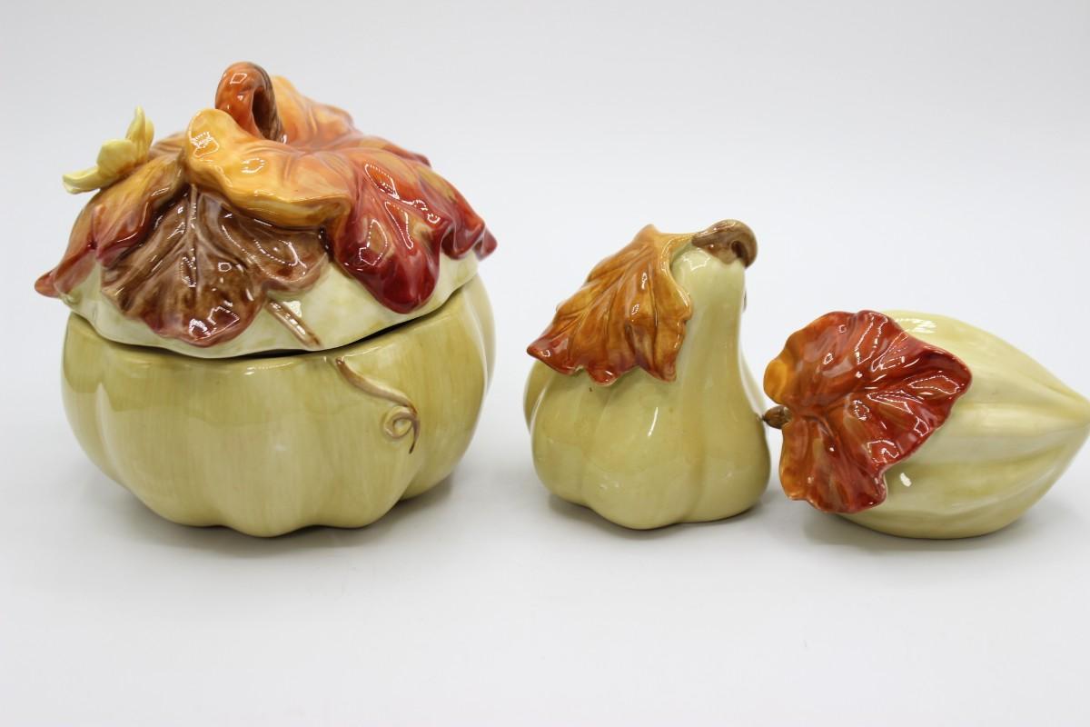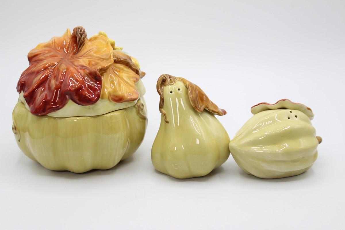 Fitz and Floyd Handcrafted Ceramic Pumpkin Squash Set Sugar Spice Bowl with Salt & Pepper Shakers