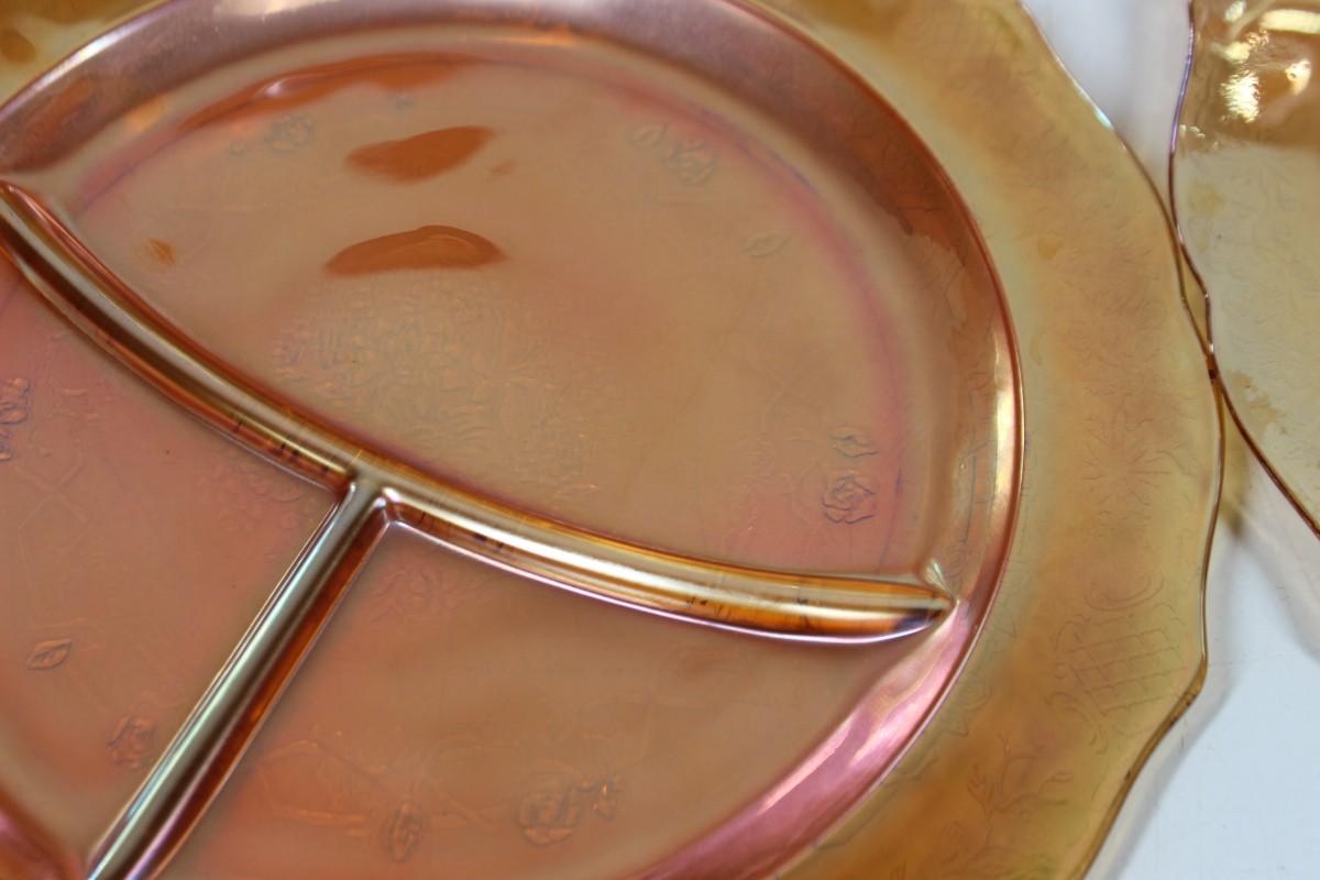 Vintage Federal Normandie Pattern Orange Iridescent Glass Divided Dish Set of 8 Dinnerware Plates