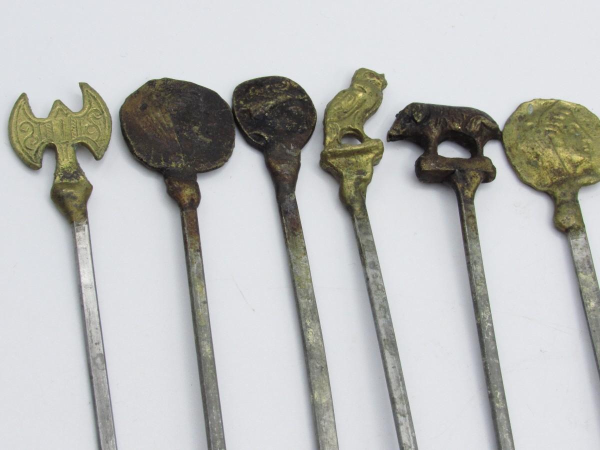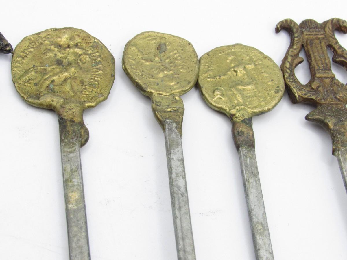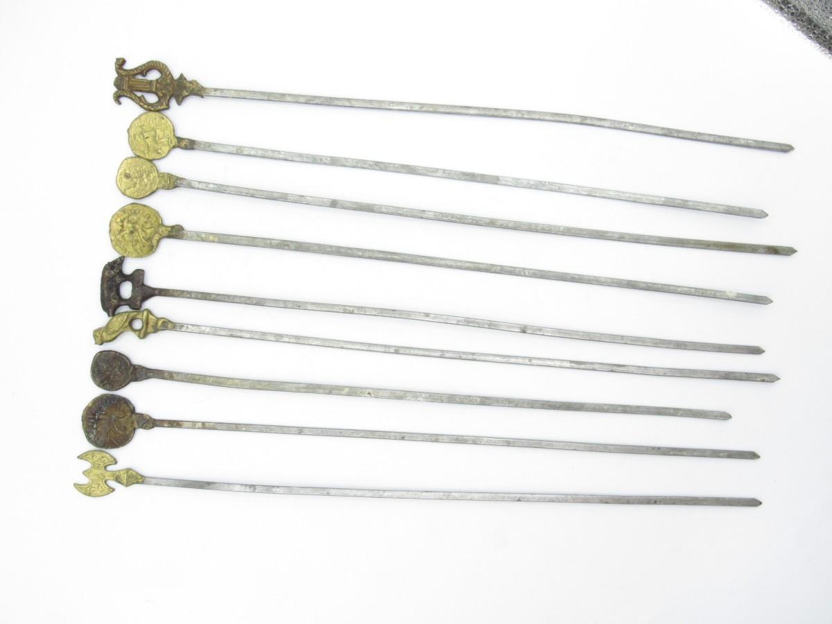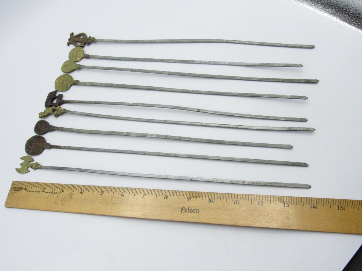 Vintage Brass Mid Century Metal Shish Kabob Presentation Skewers Axe Head, Trident, Coins, & More