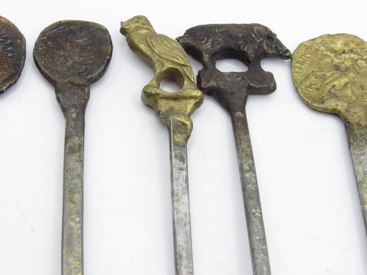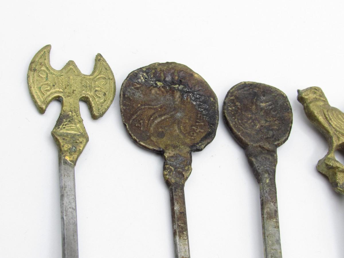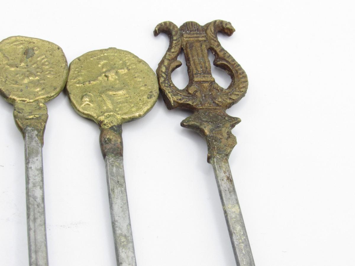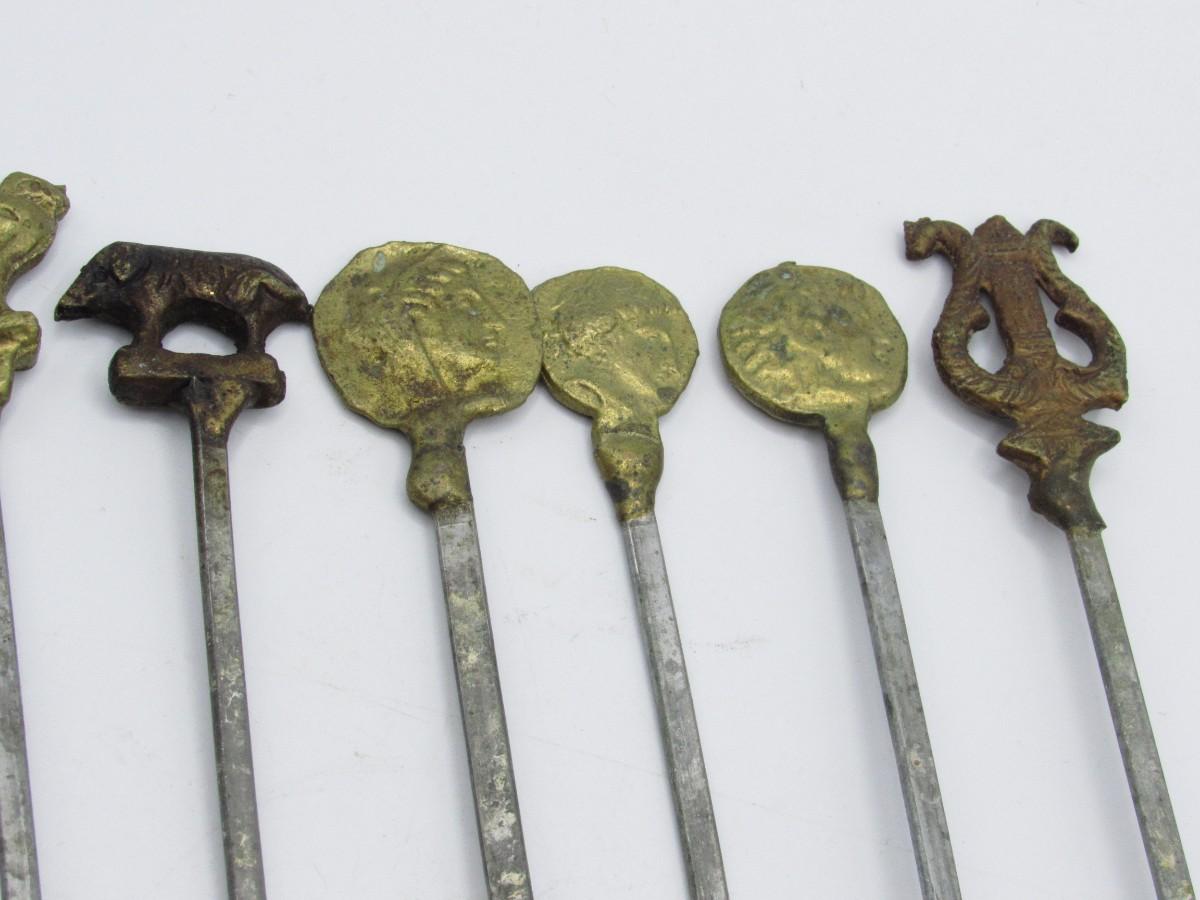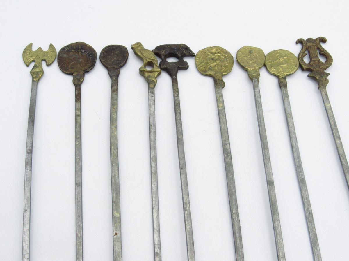 Vintage Brass Mid Century Metal Shish Kabob Presentation Skewers Axe Head, Trident, Coins, & More