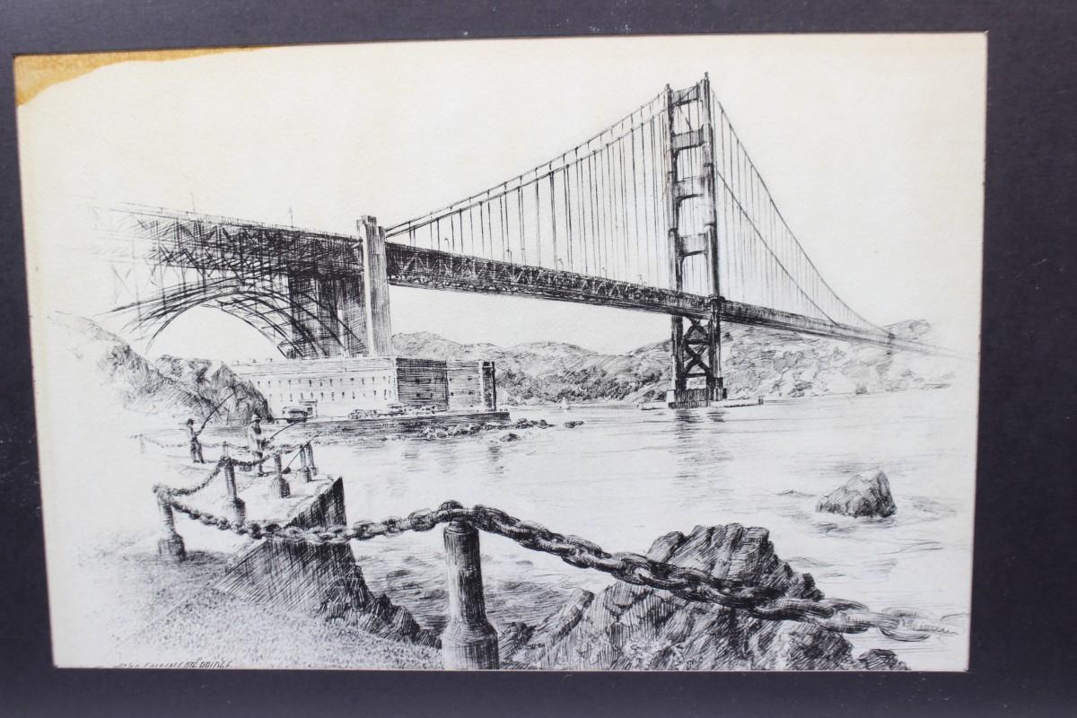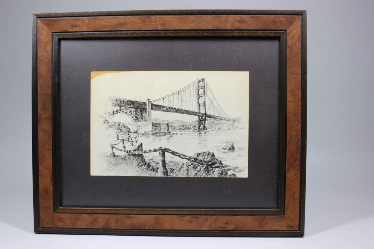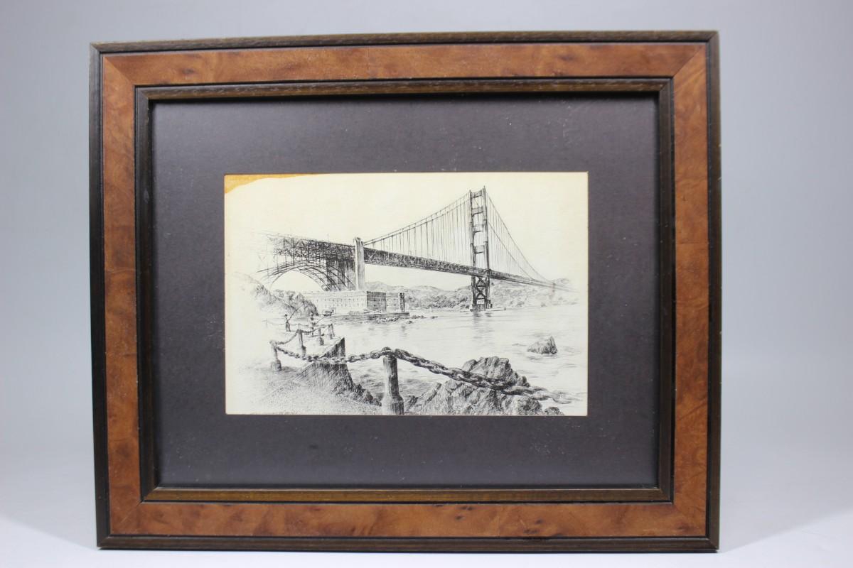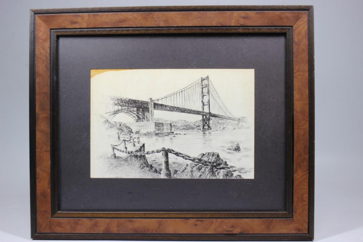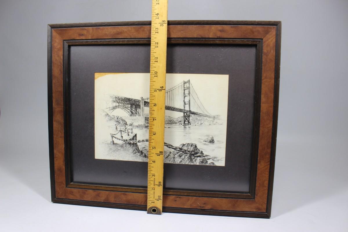 Vintage Framed Art Sketch The Golden Gate Bridge San Francisco