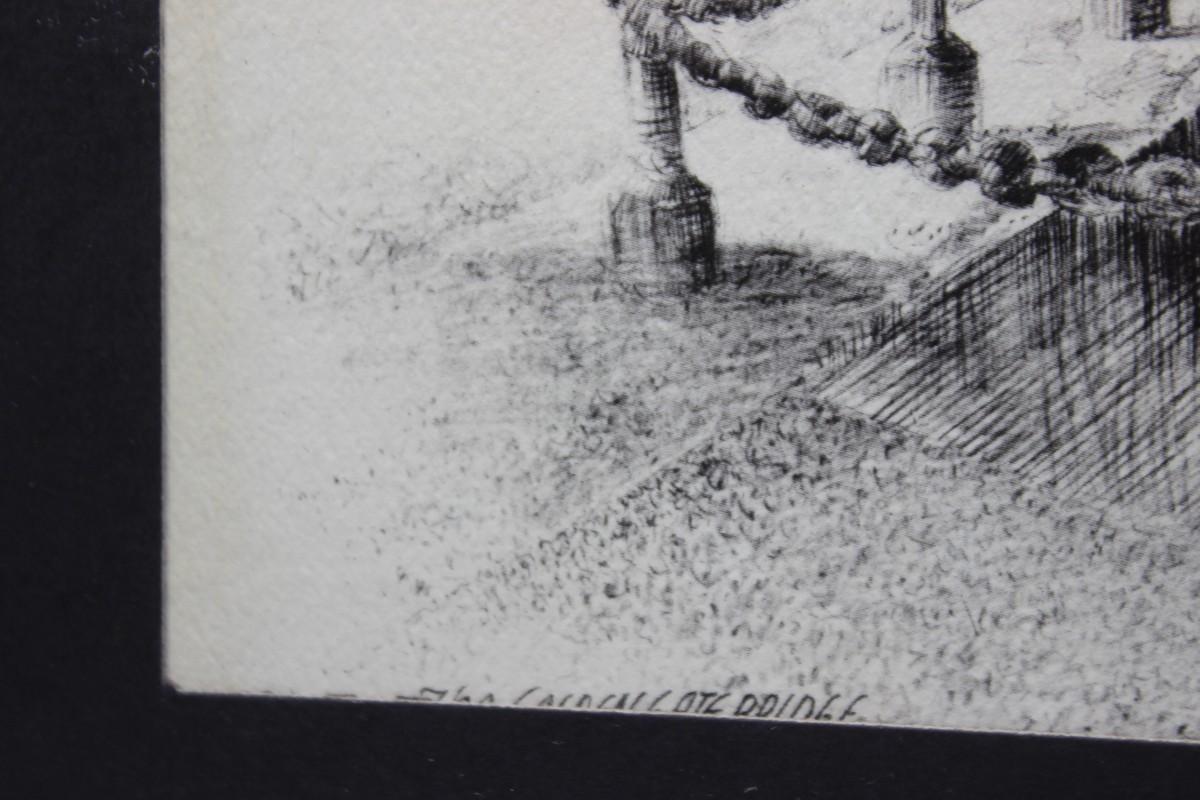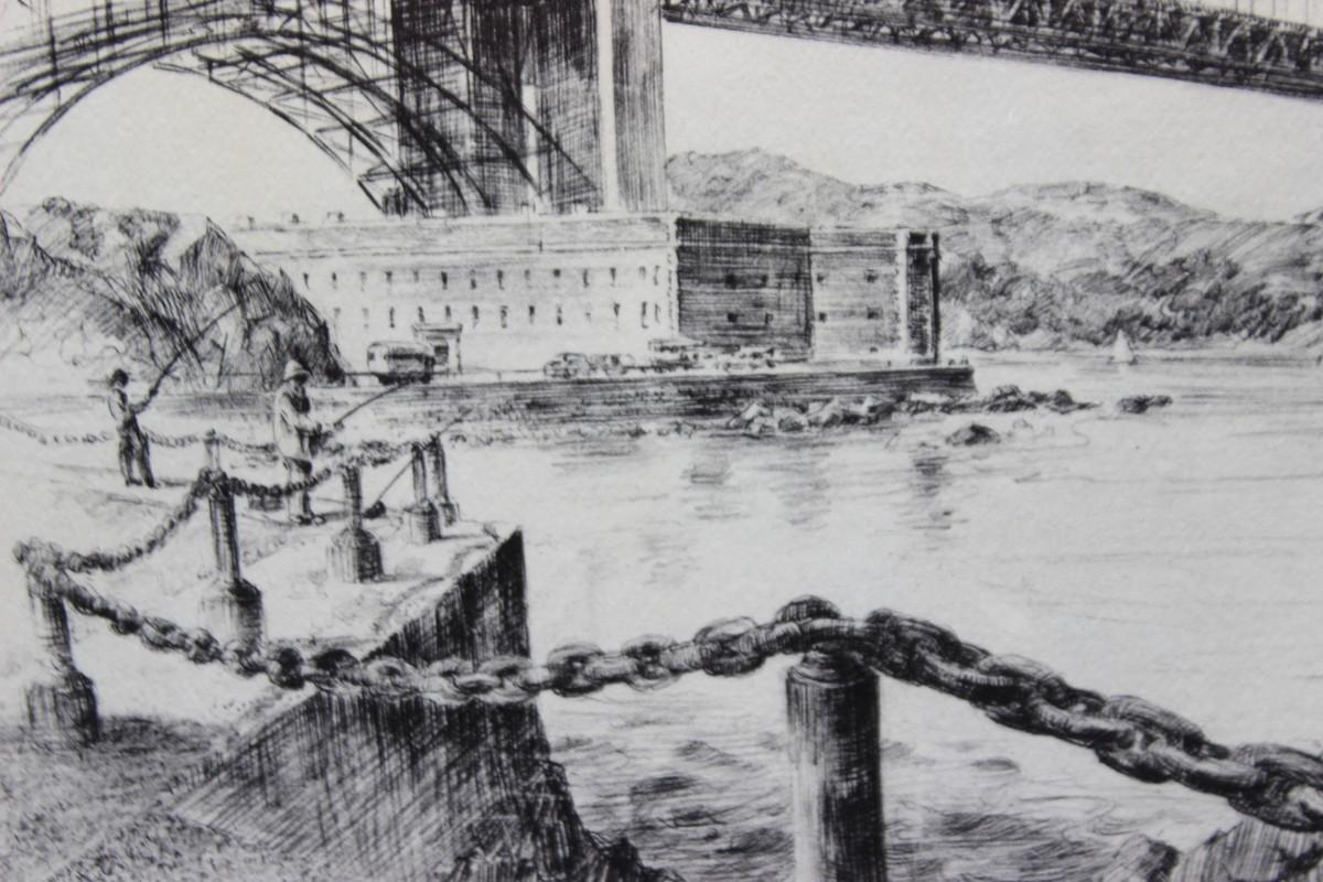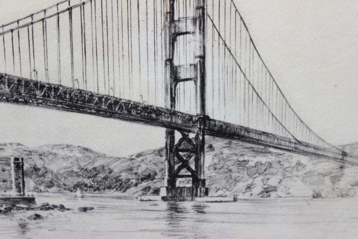 Vintage Framed Art Sketch The Golden Gate Bridge San Francisco. In vintage condition, there is some discoloration at the top left corner.