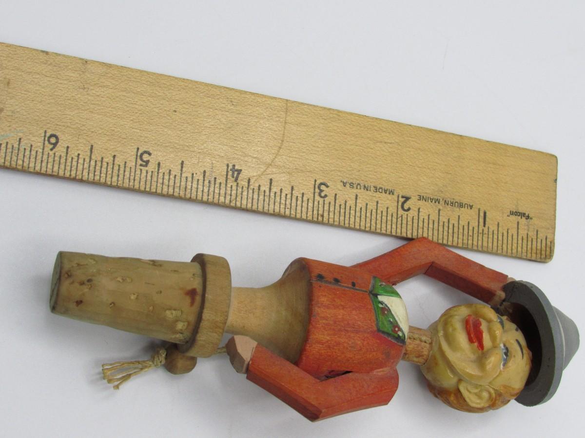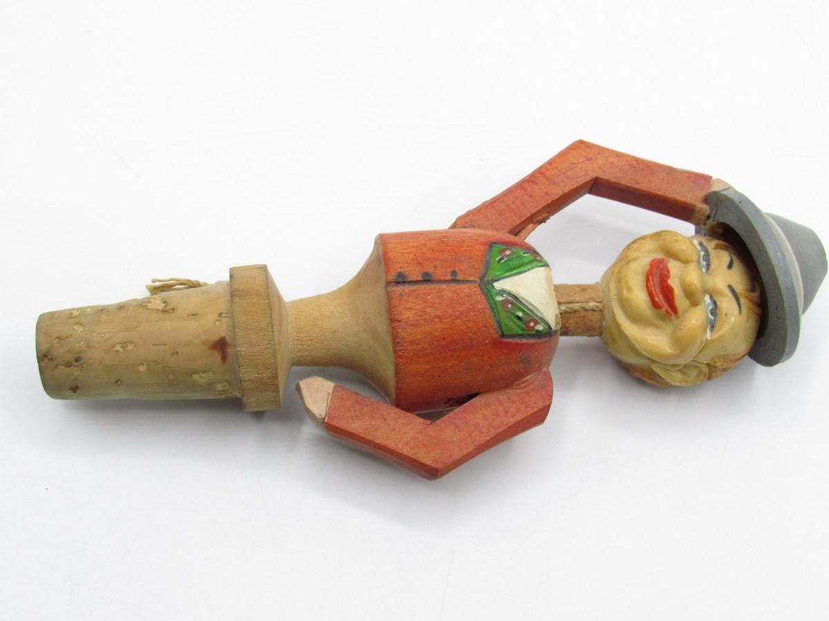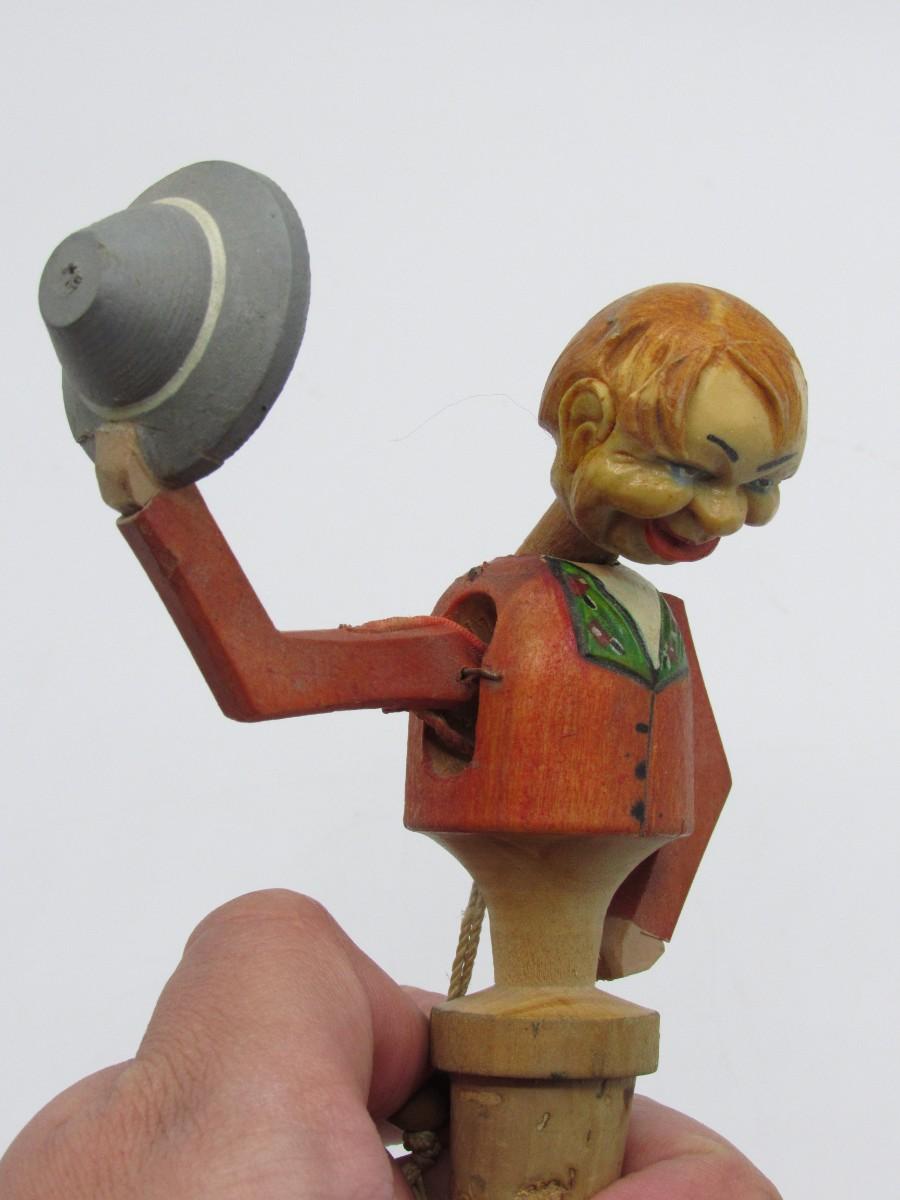 Vintage Carved Wood Novelty Wine Bottle Stopper Hat Tipping Gentleman Barware Figurine