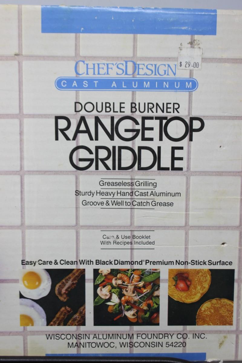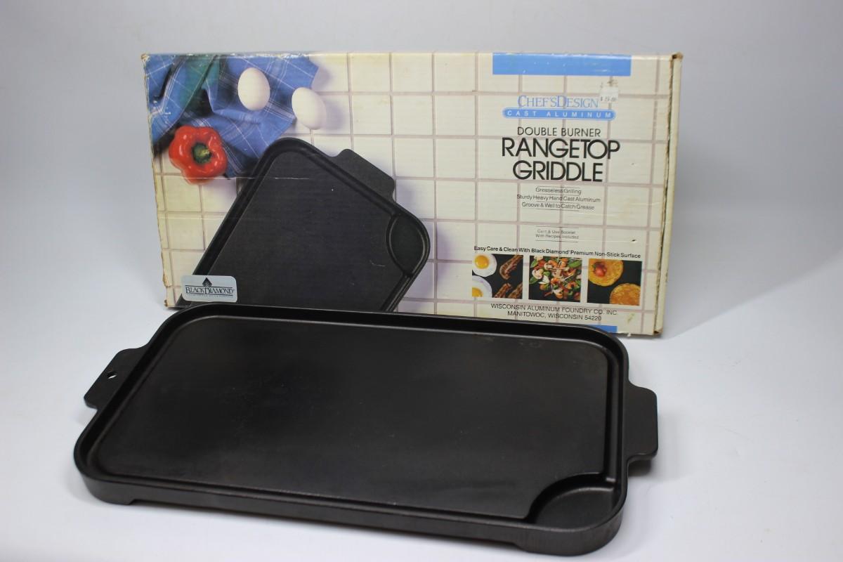 Previously Used Double Burner Rangetop Griddle Cook Surface Pan. Comes with original box. In good used condition.