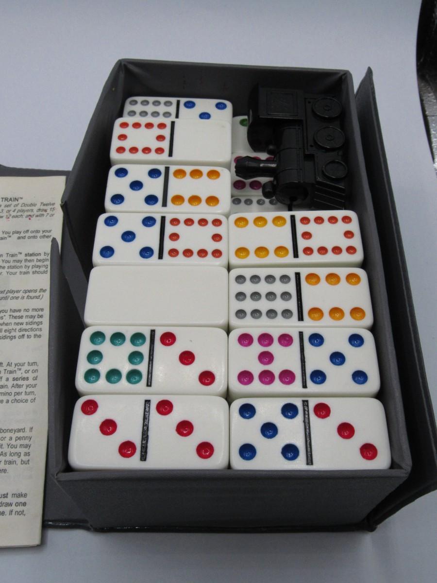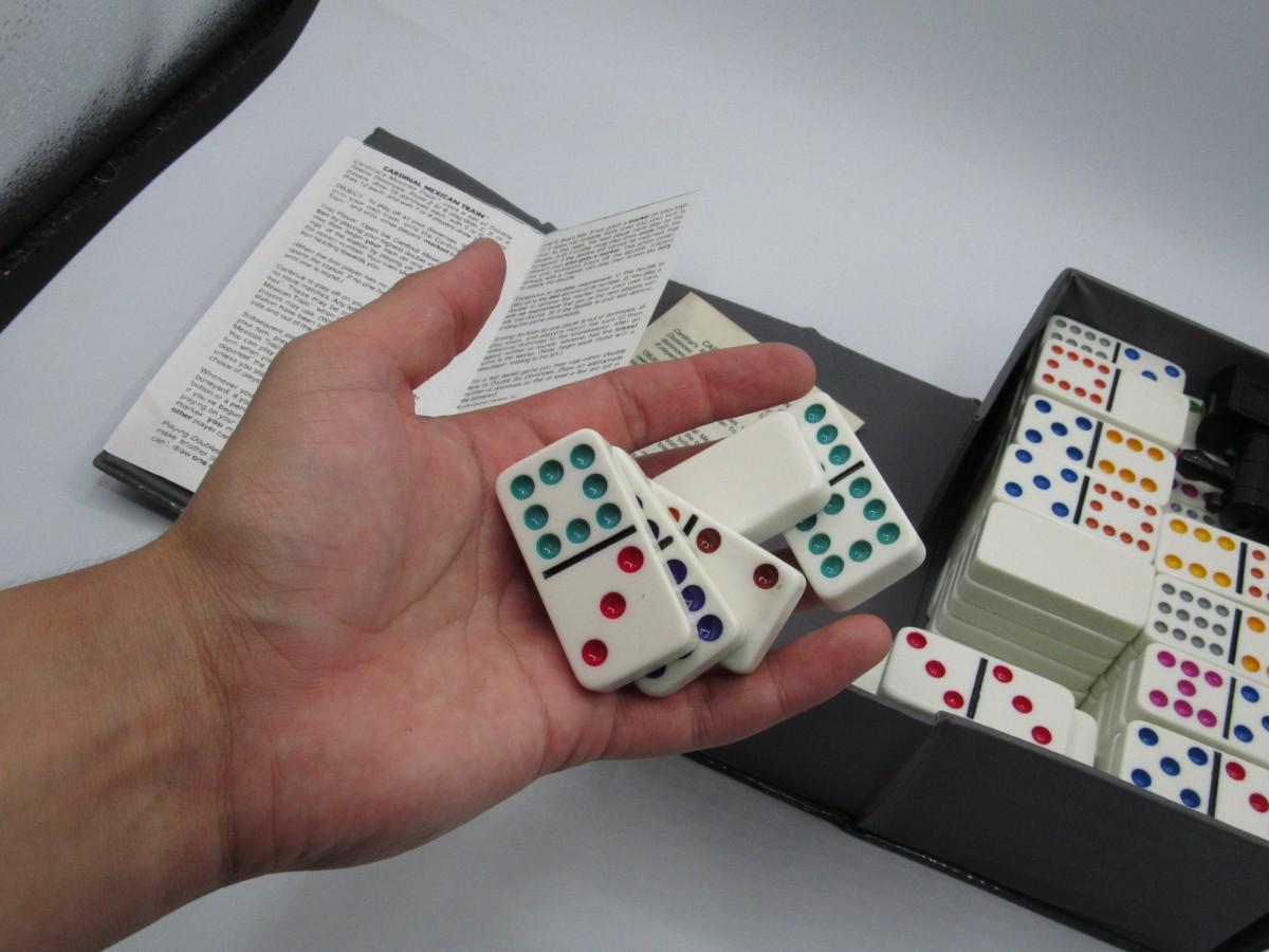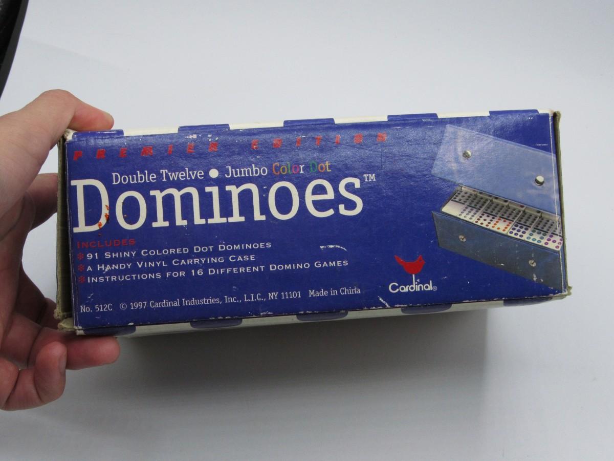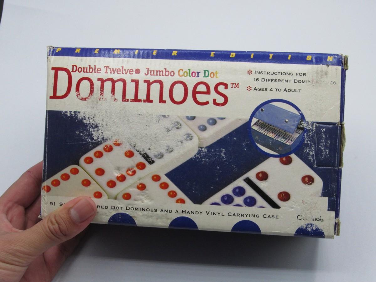Double Twelve Jumbo Color Dot Domino Set. In previously played with condition. Not sure if tiles are complete.