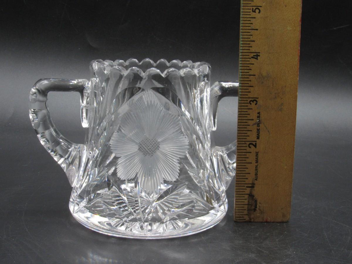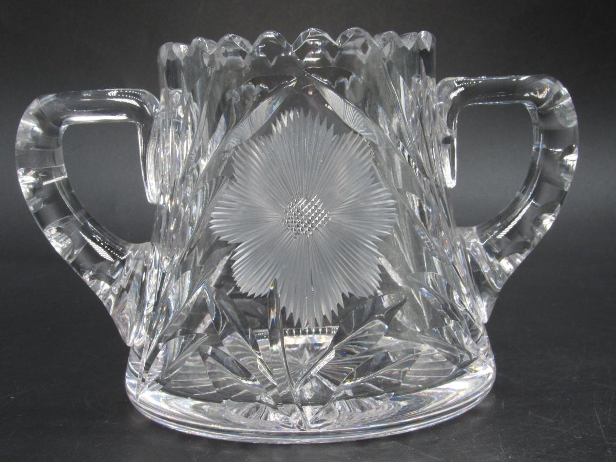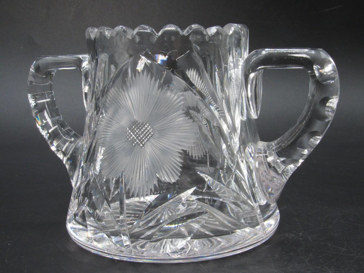 Vintage Sawtooth Edge Cut Glass Double Handle Mid Century Flower Motif Sugar Bowl Teaware
