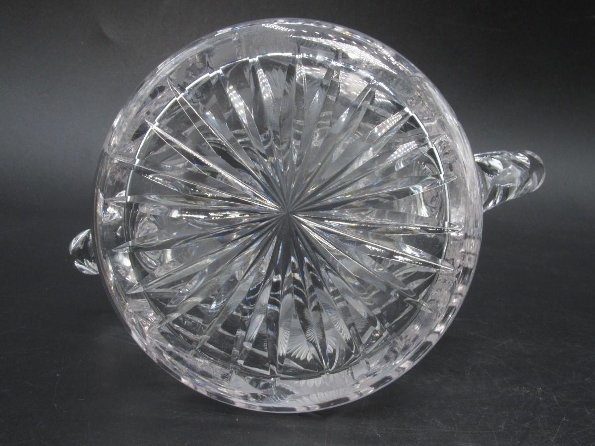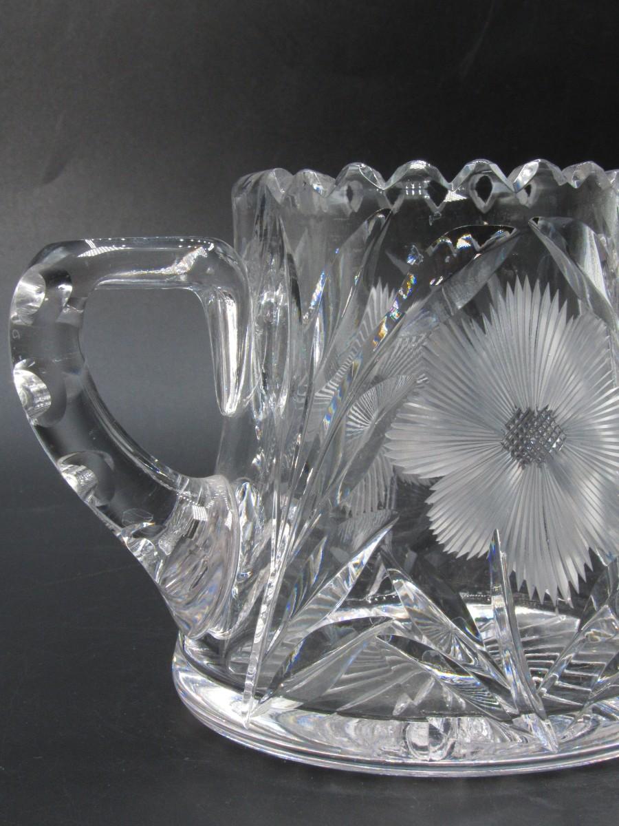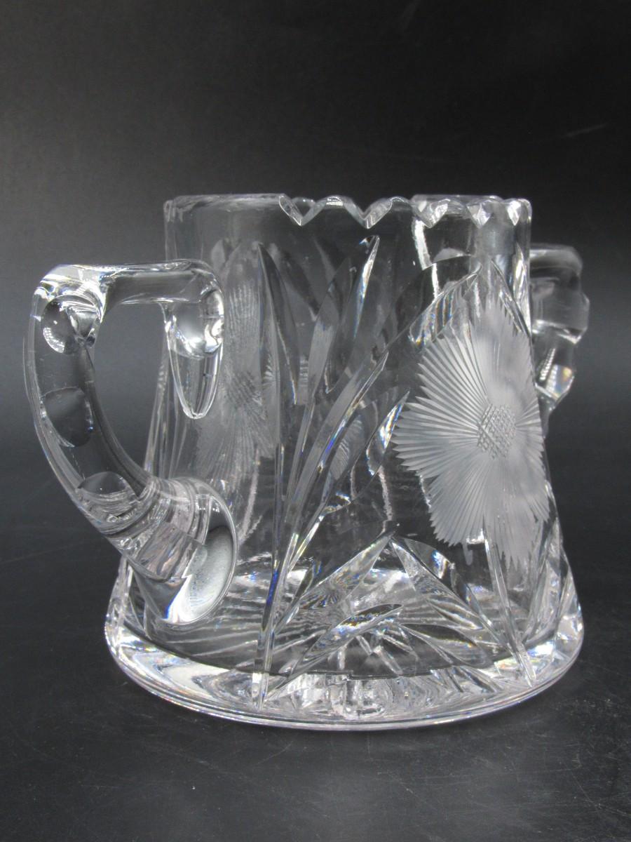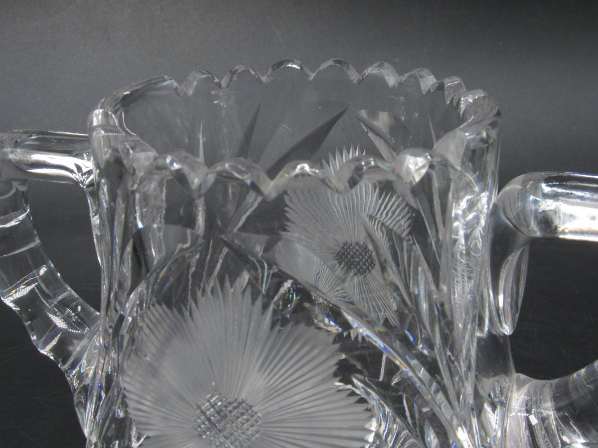 Vintage Sawtooth Edge Cut Glass Double Handle Mid Century Flower Motif Sugar Bowl Teaware