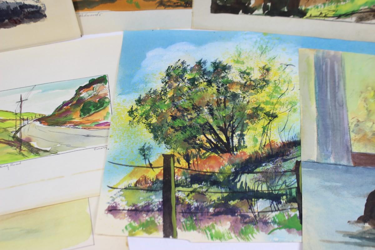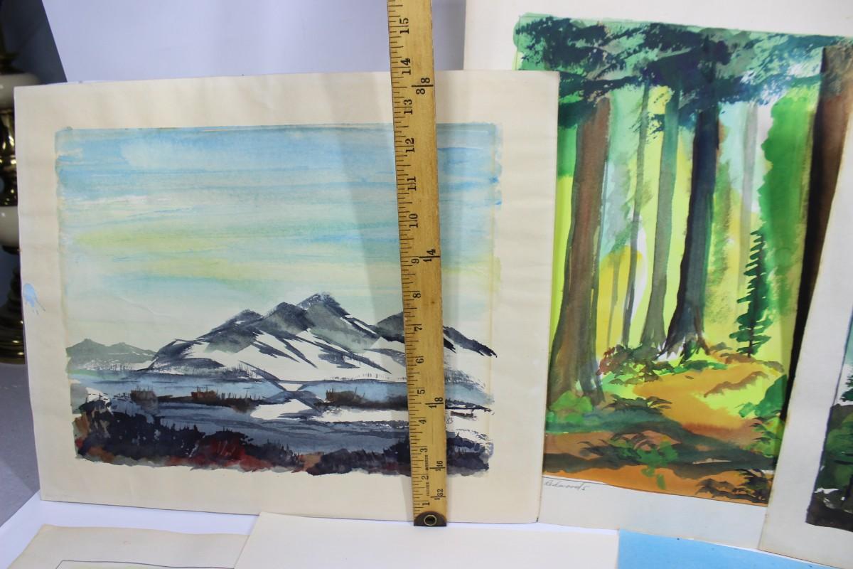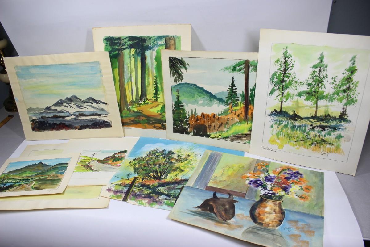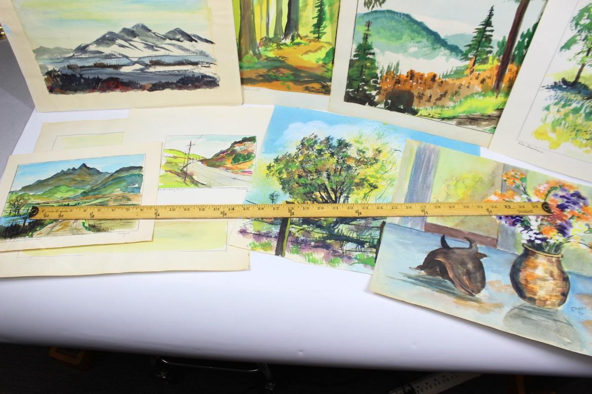 Vintage 1980's Original Artwork Green Scenery Landscape & Still Life Watercolor Mix Media Sketches Collection