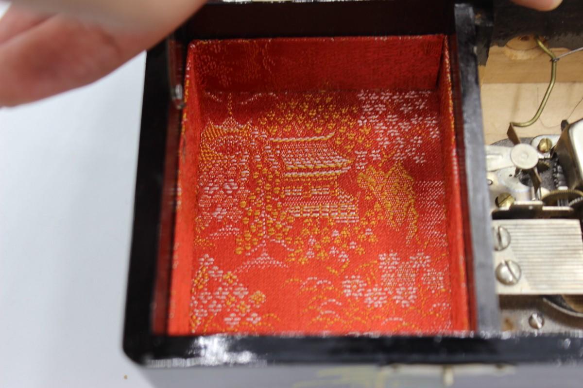 There is vintage wear to the box, but there is no significant damage. The musical box works when it's wound up! Check pictures for more details and sizing.