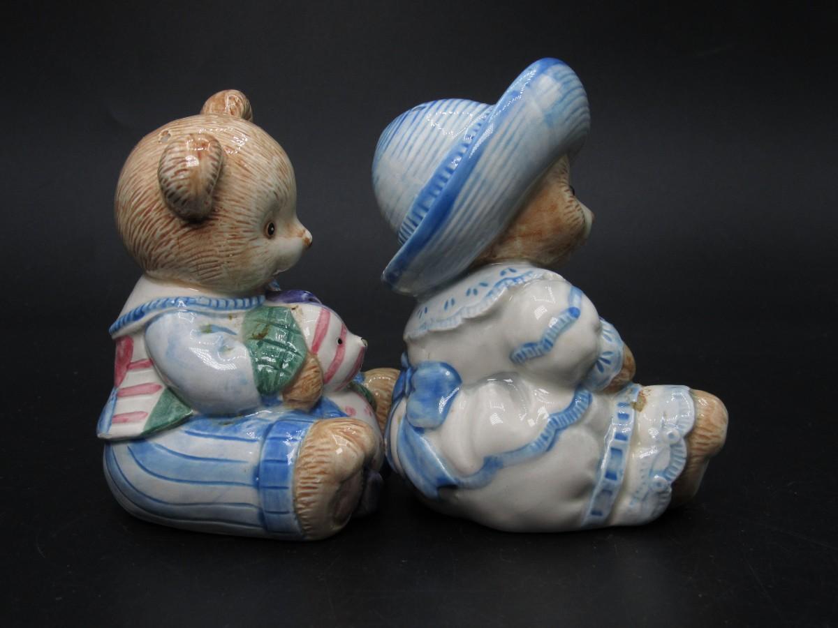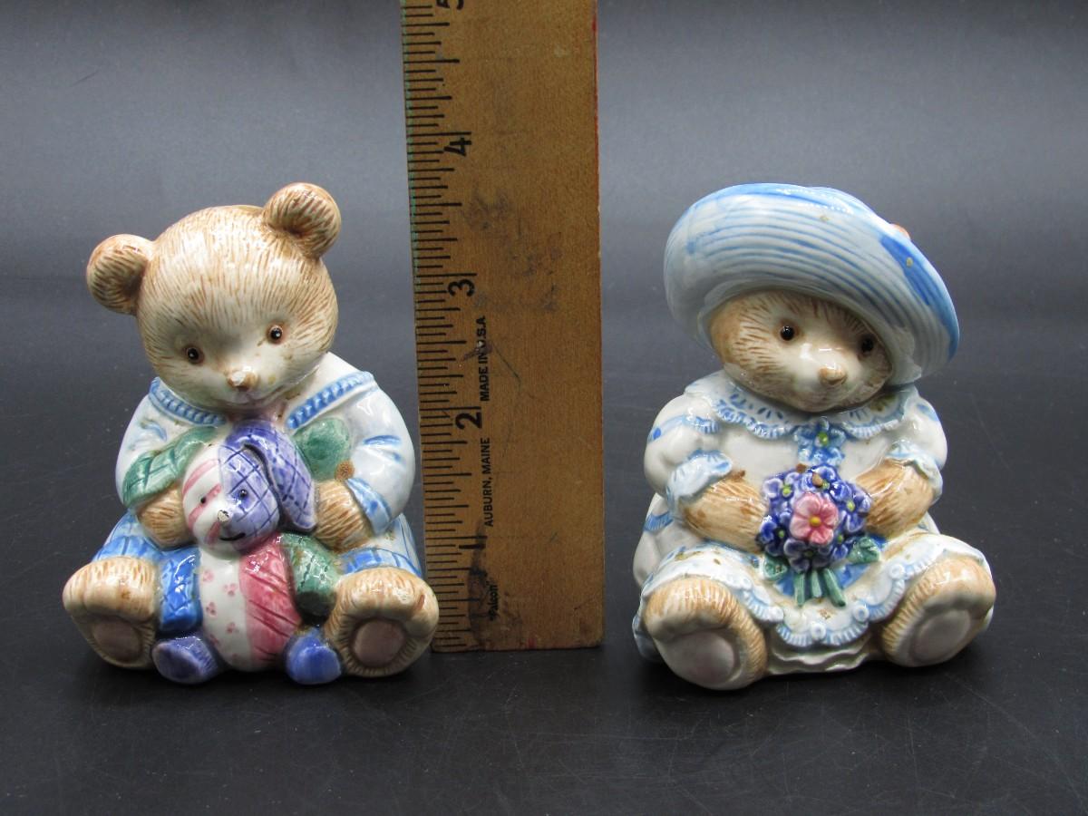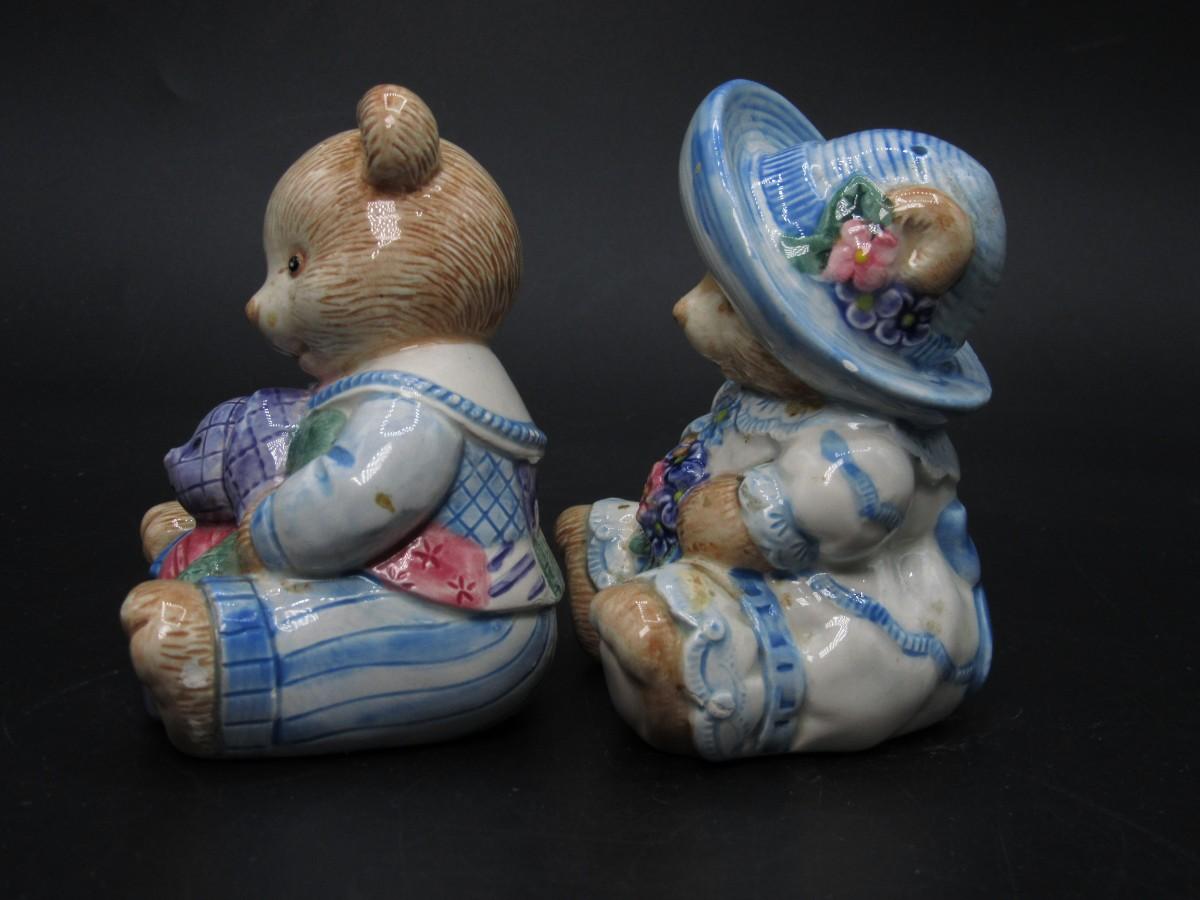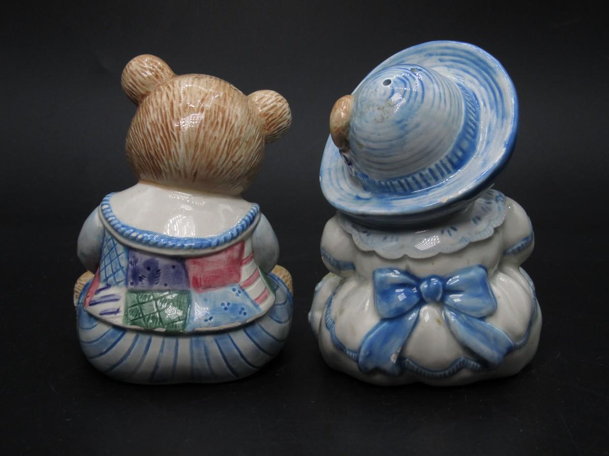 Retro Fitz & Floyd Cottagecore Style Plush Hand Painted Bear Salt & Pepper Shakers