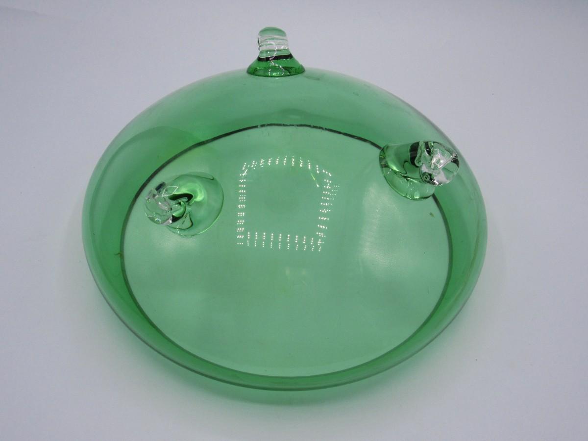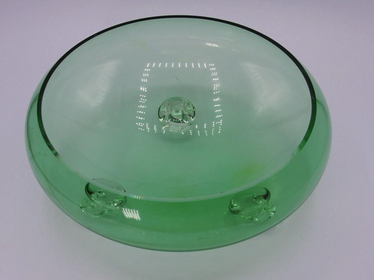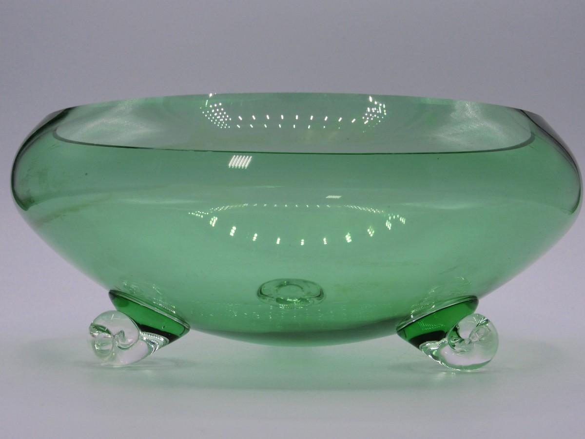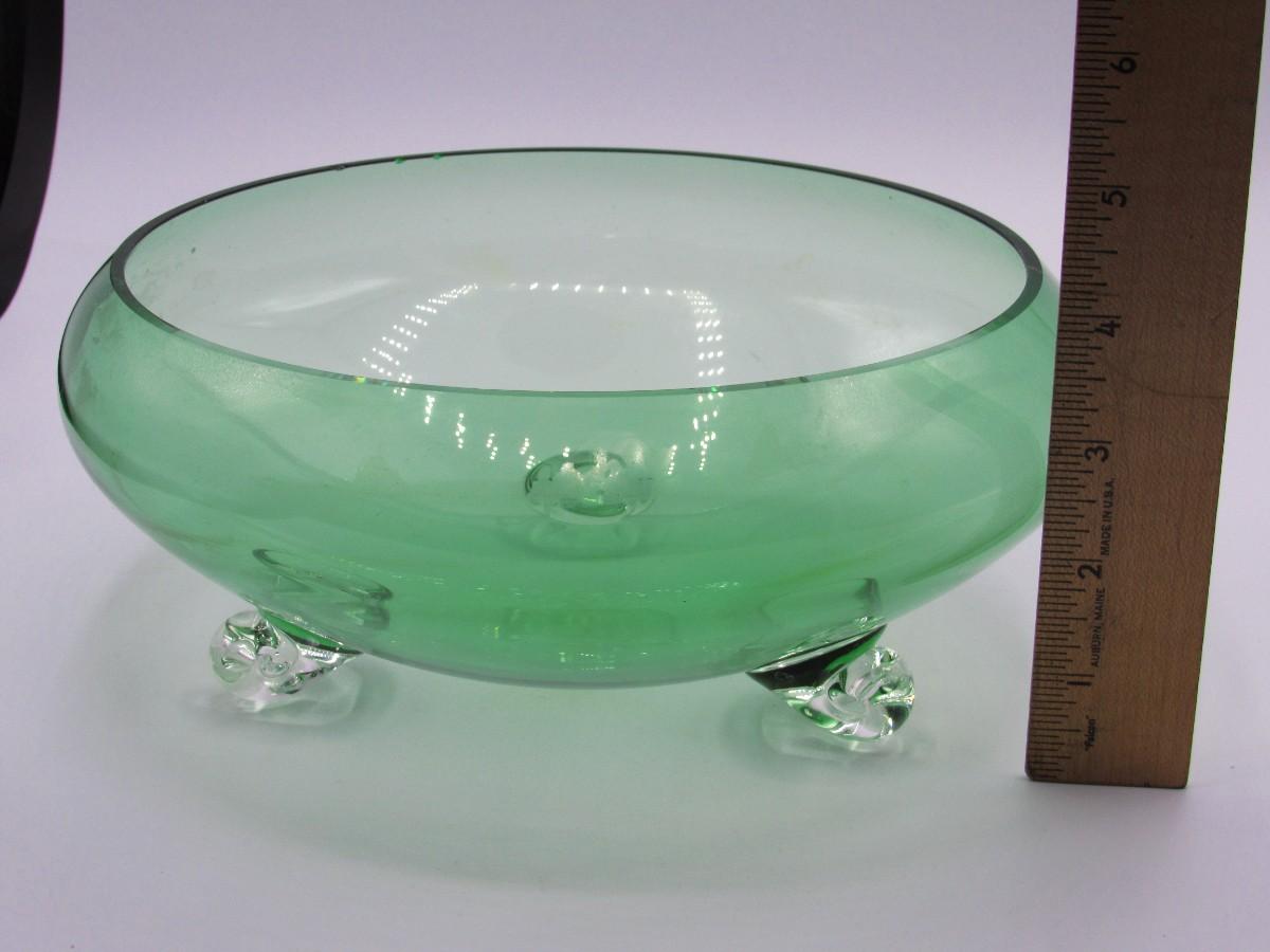 Vintage Mid Century Modern Three Footed Clear Green Glass Bowl