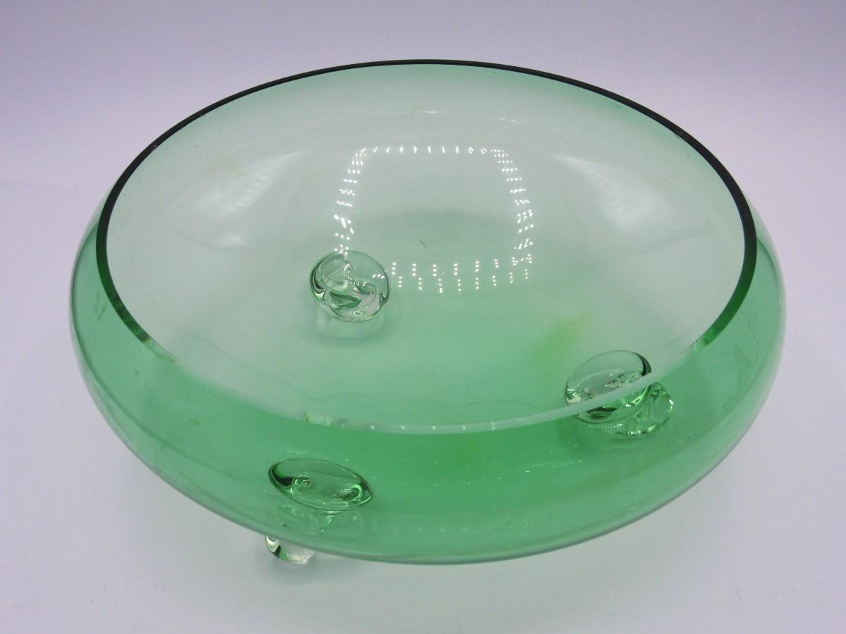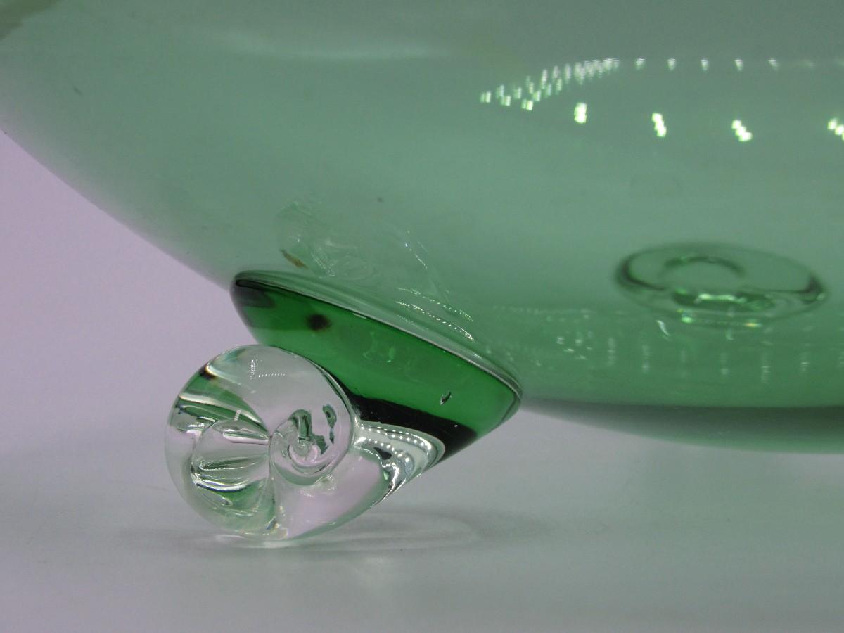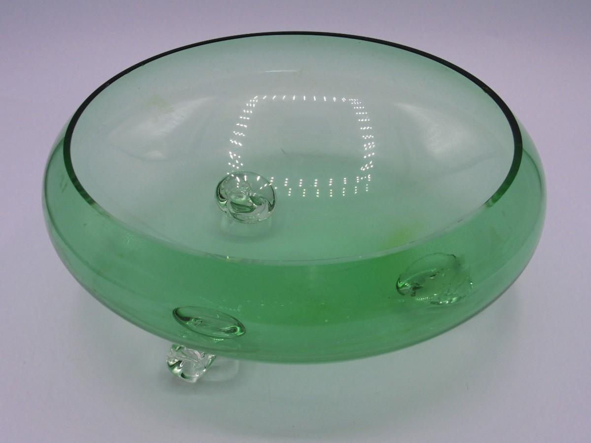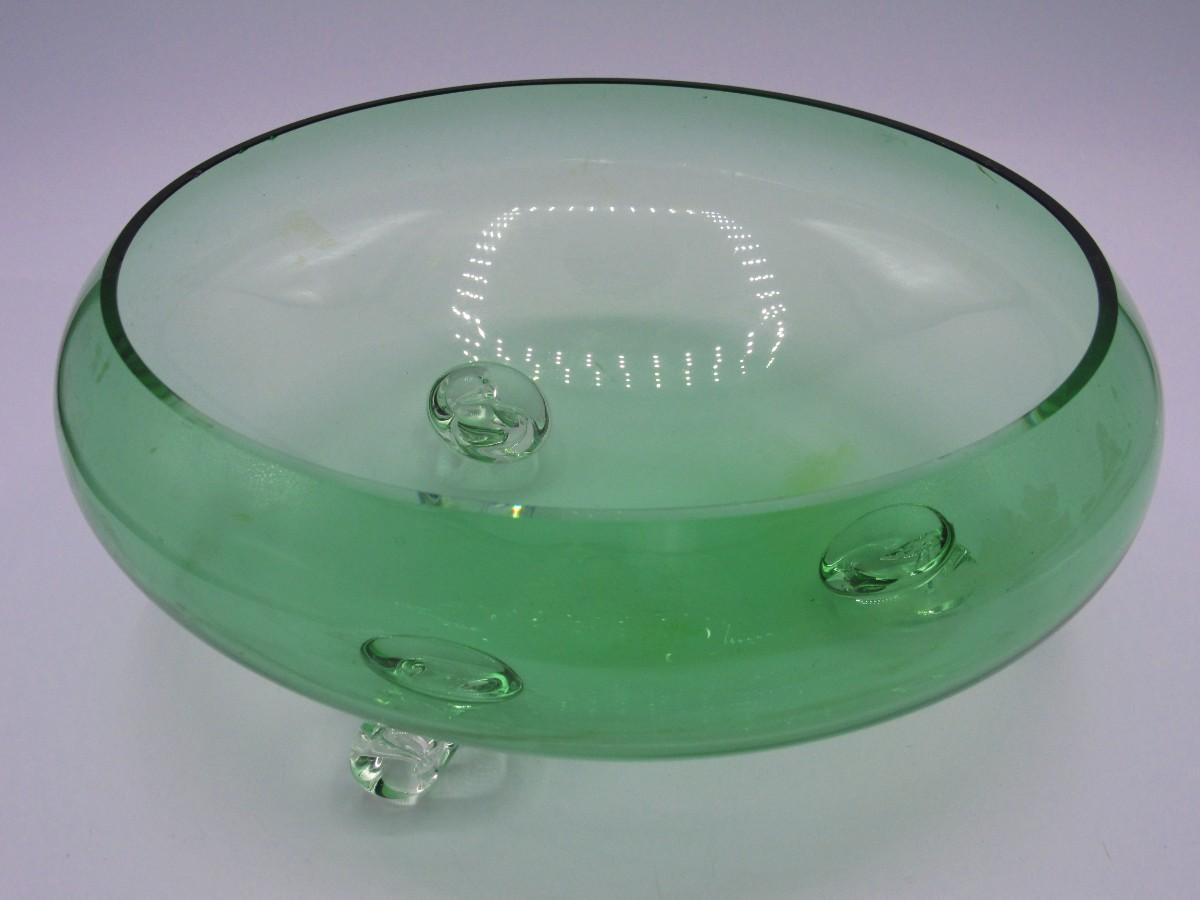 Vintage Mid Century Modern Three Footed Clear Green Glass Bowl