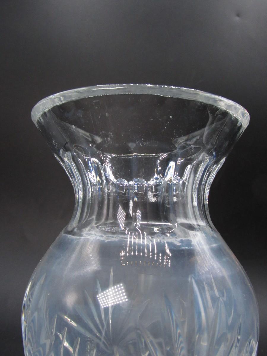 There is some water staining to the vase, but there is no significant damage to the glass and is in good condition. Check pictures for more details and sizing.