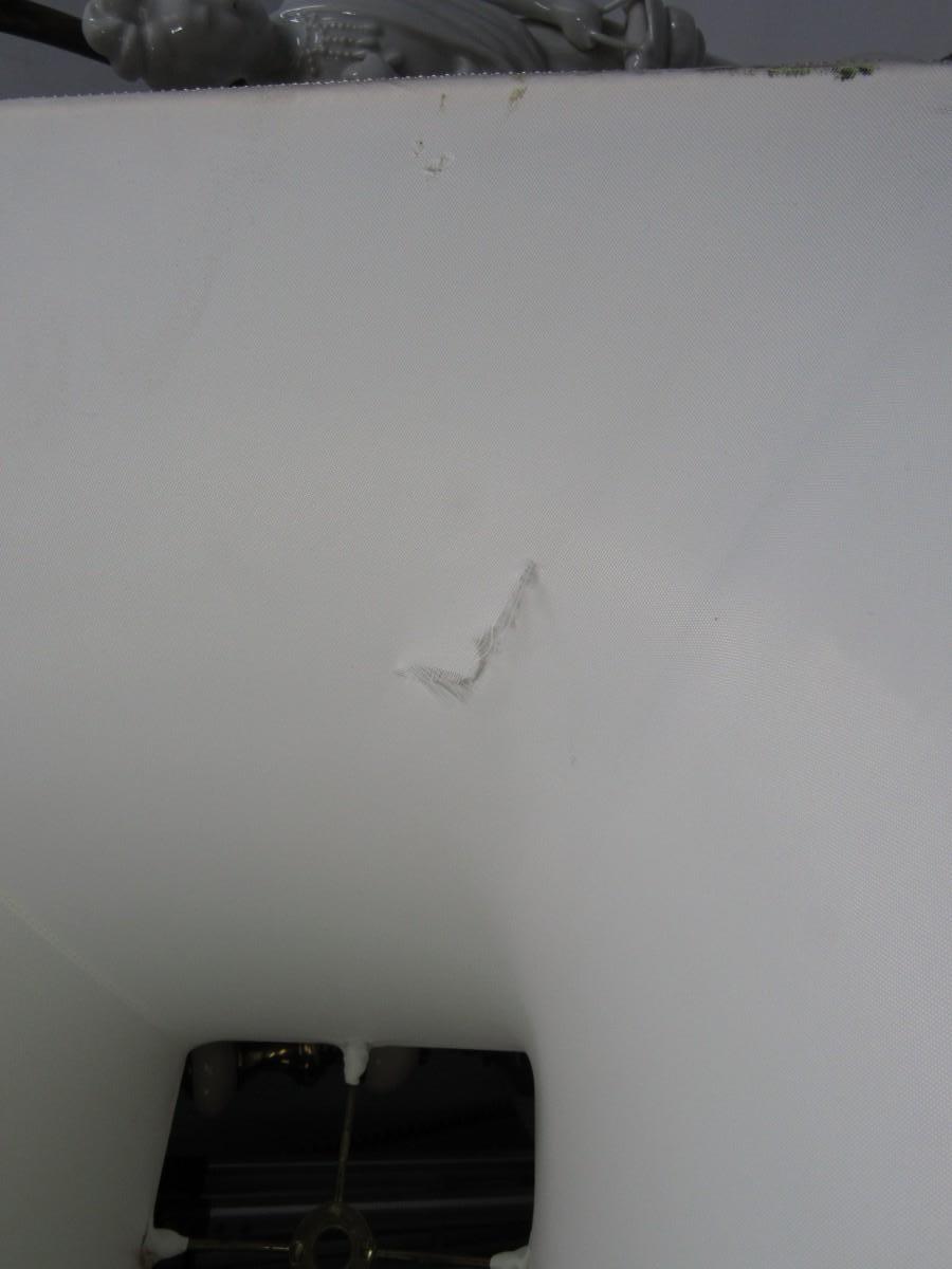 There is a small rip in the lampshade on inside, but there is no other significant damage to the lamp and is in overall good displayable condition! Works perfectly, check pictures for more details and sizing.