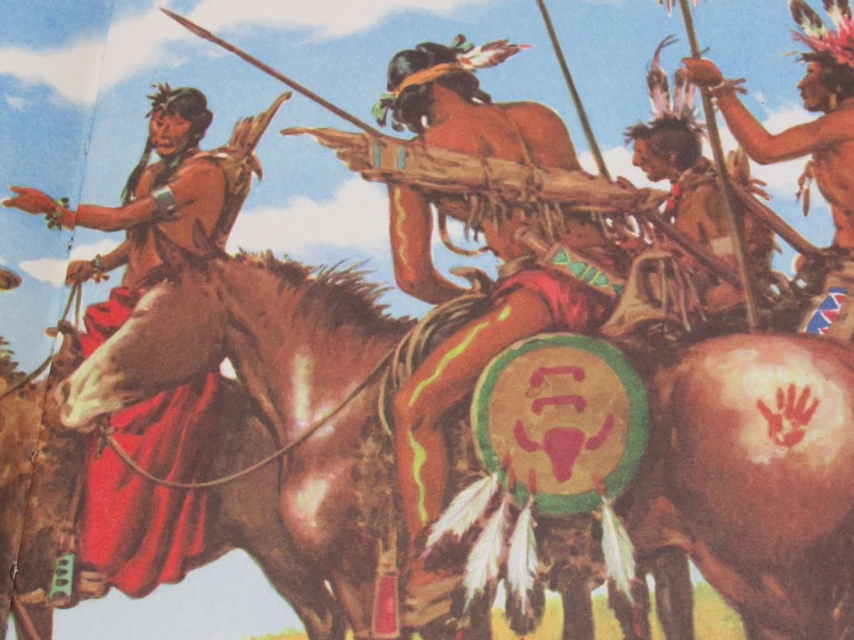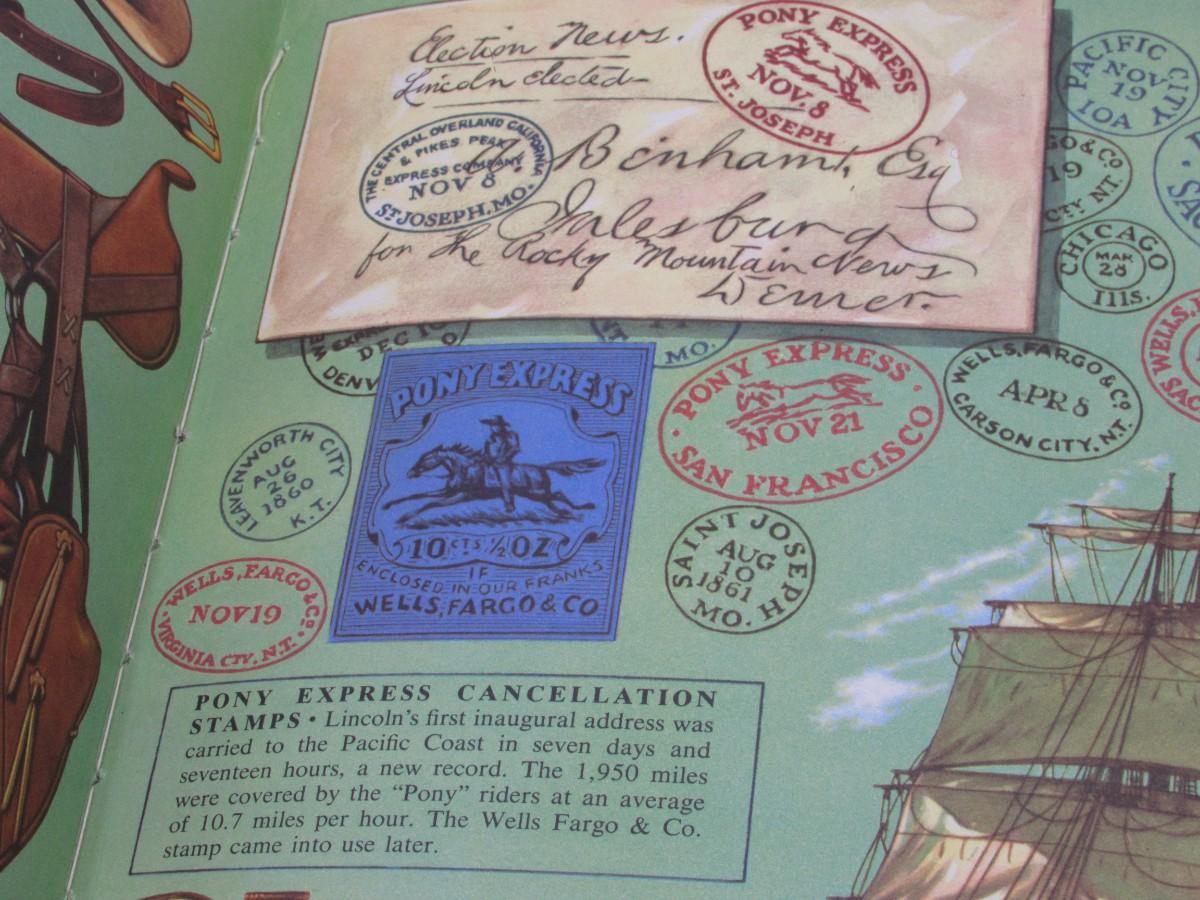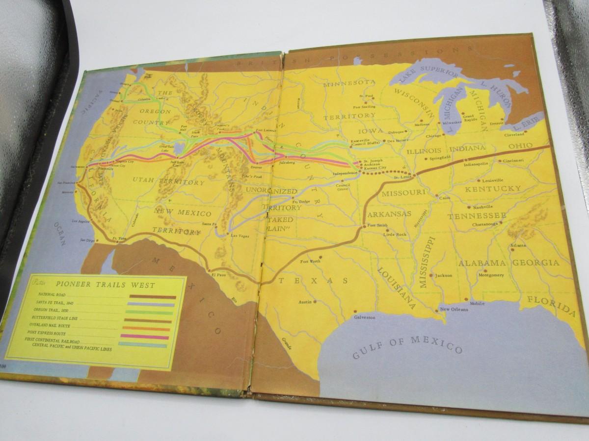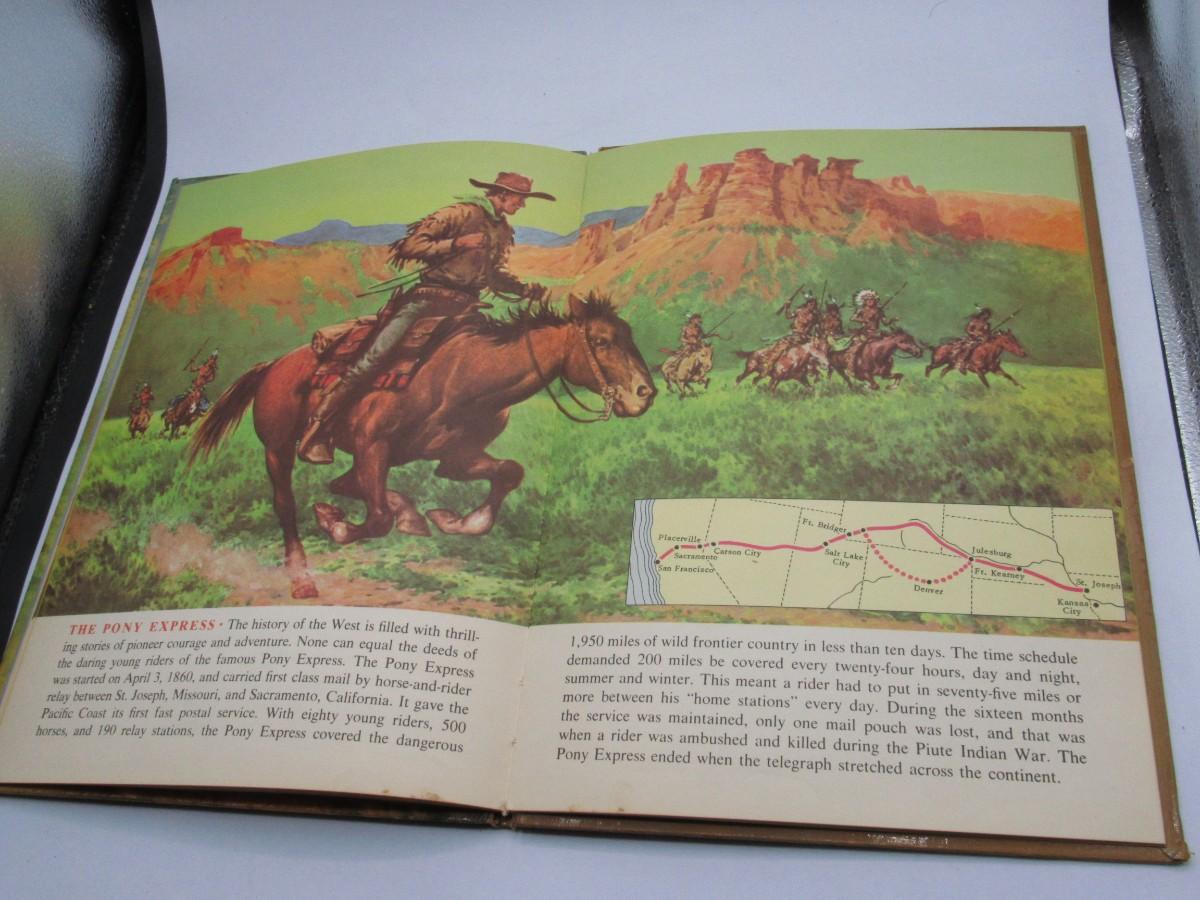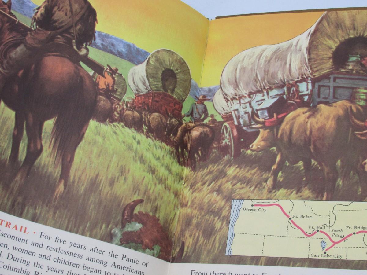Full-color illustrated vintage children's book of Wild West topics: Mountain Men, Custer's Last Stand, Pony Express, Oregon Trail, and maps of the West. Published in 1952. Fair to good condition, the back cover has a split at the fold.