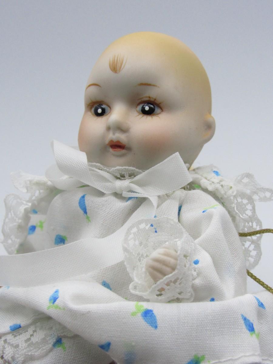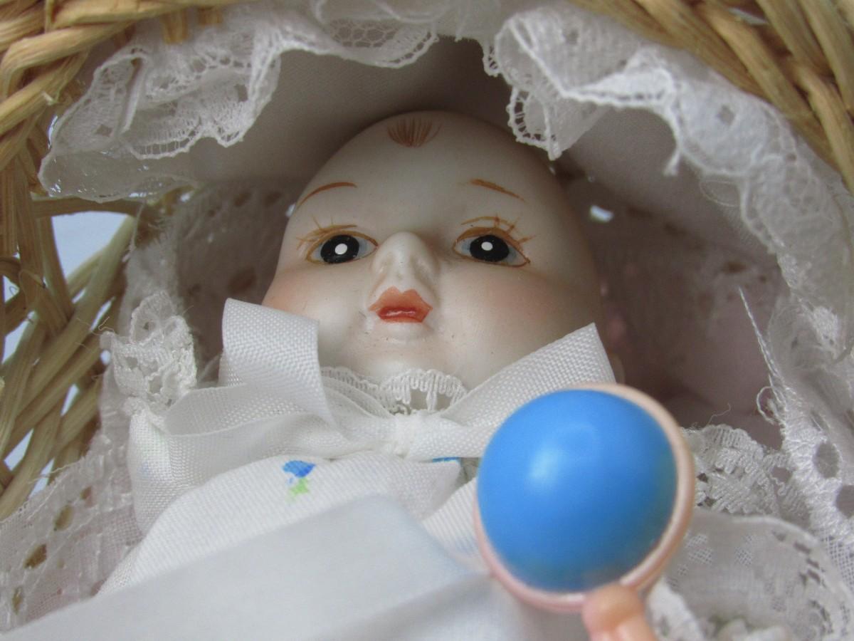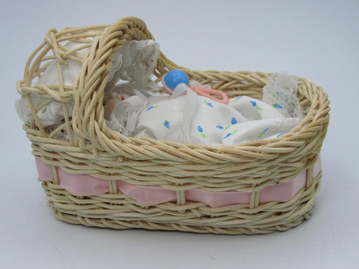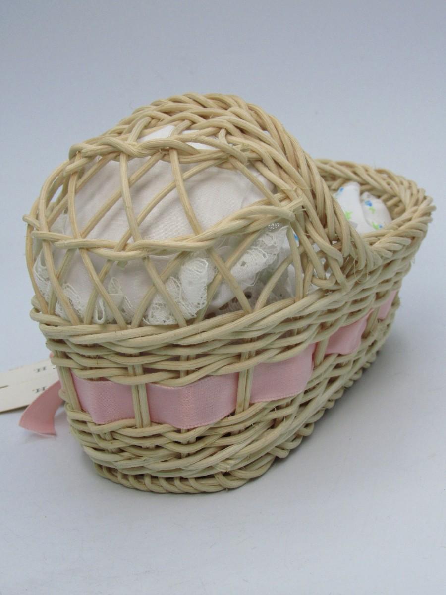 Small Vintage Porcelain Bisque Baby Doll in Weaved Manger Basket