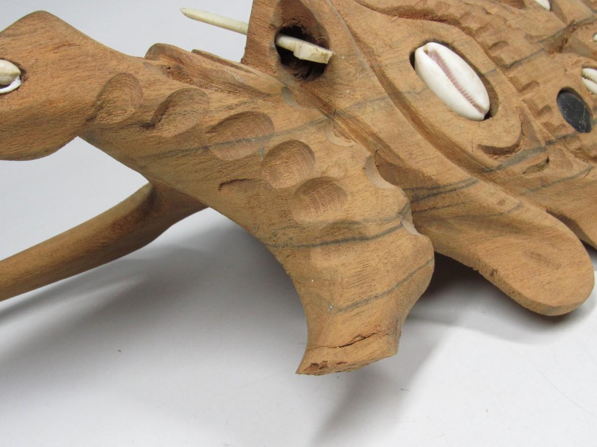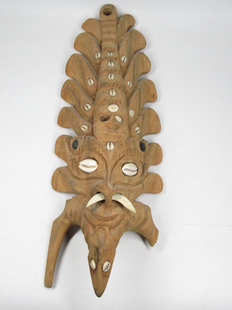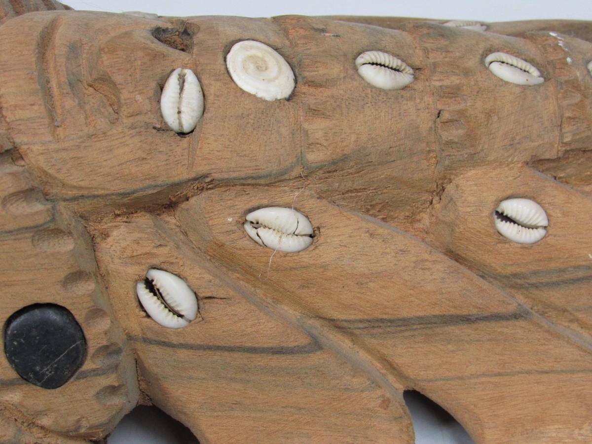 There is a piece of wood that has been chipped off and there is a missing inlaid shell, but overall the mask is in good displayable condition as is. Check pictures for more details and sizing.