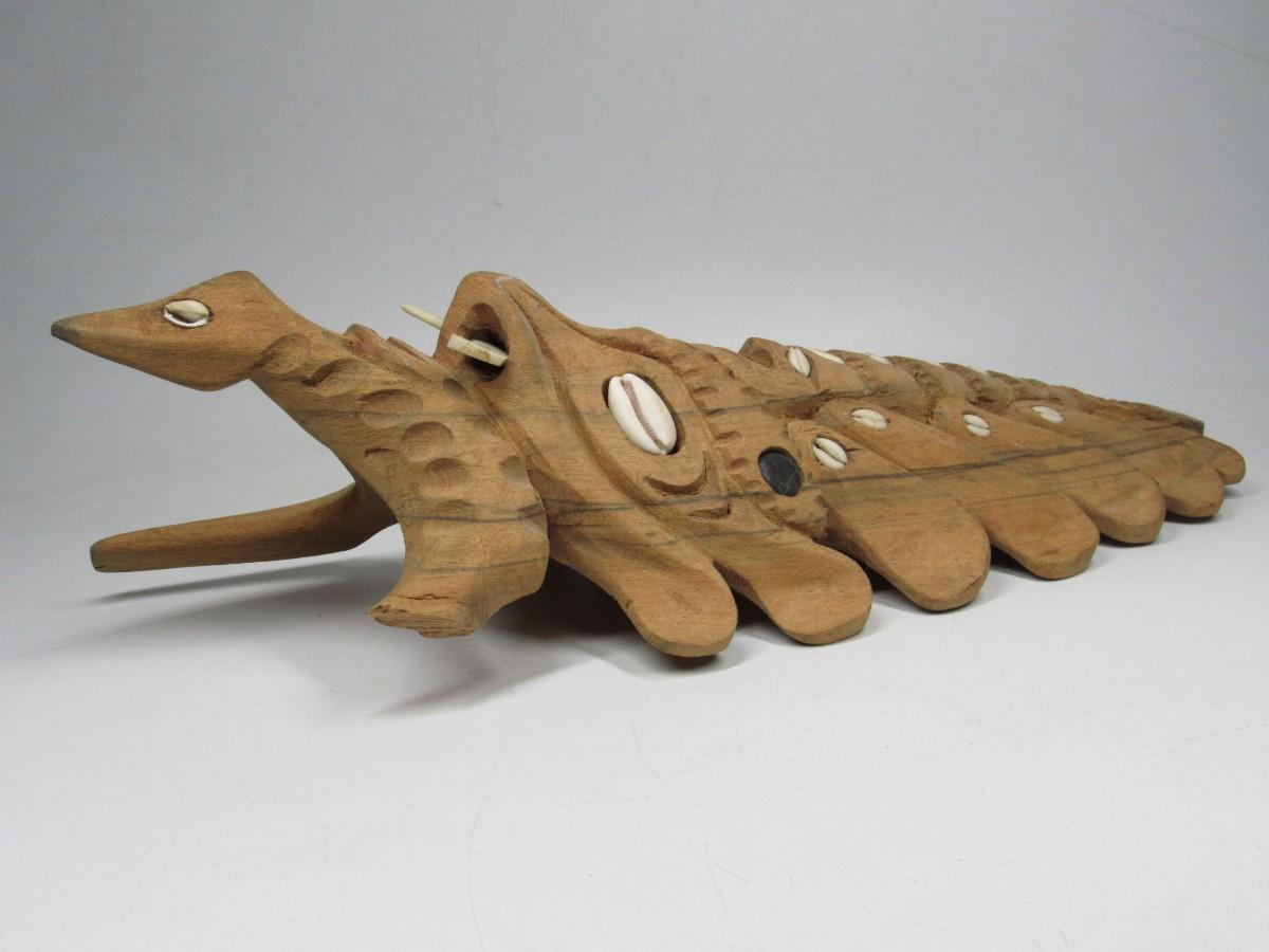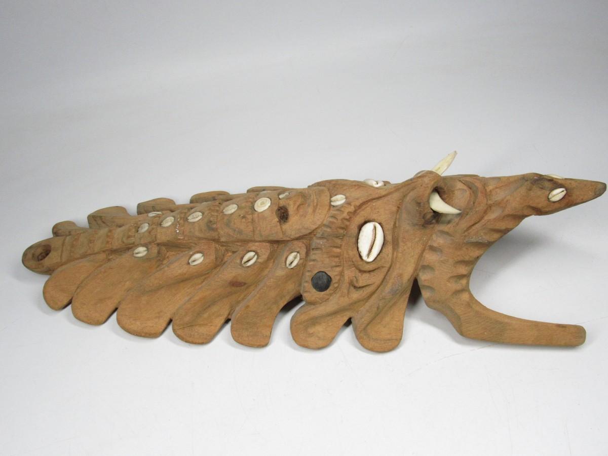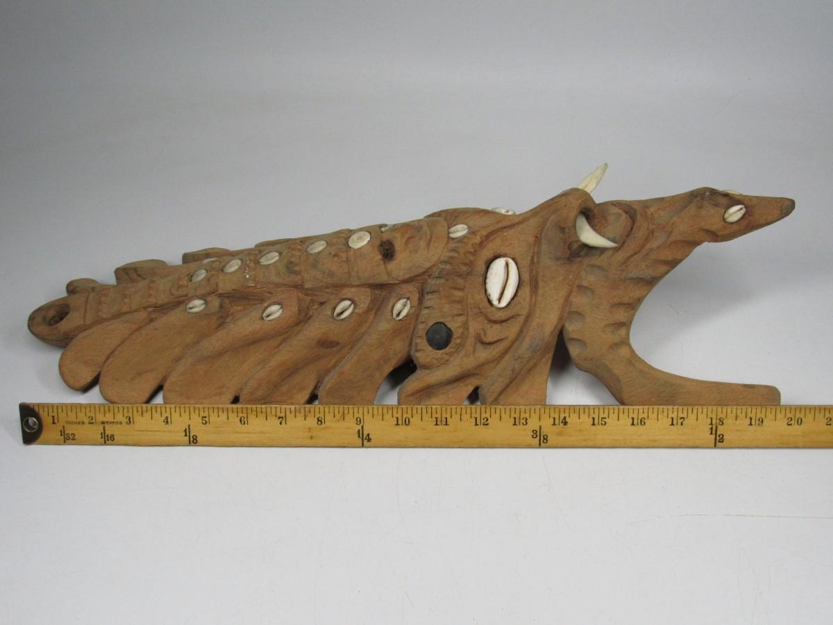 There is a piece of wood that has been chipped off and there is a missing inlaid shell, but overall the mask is in good displayable condition as is. Check pictures for more details and sizing.