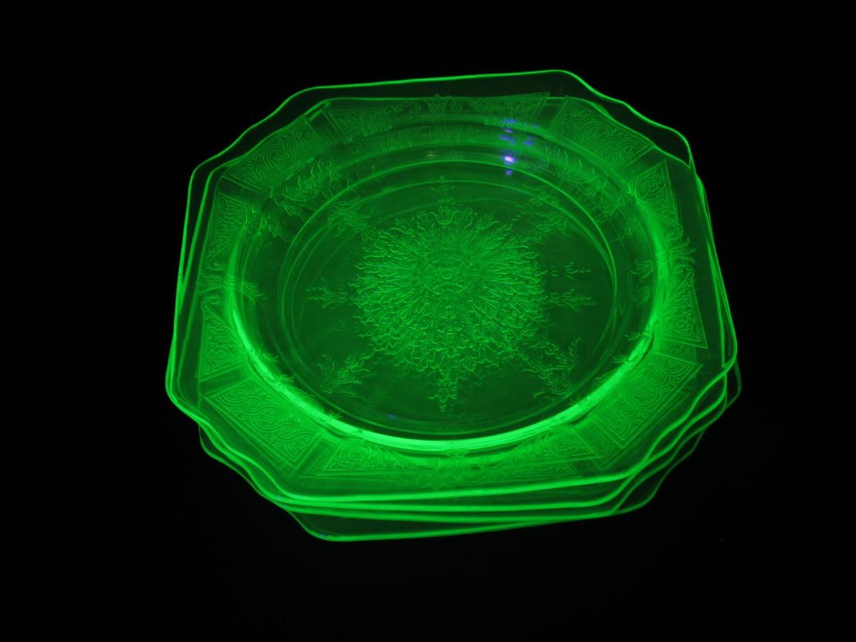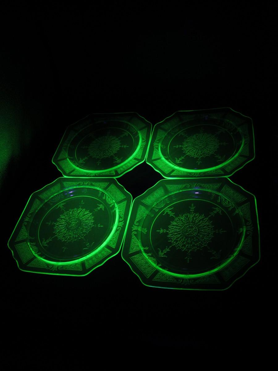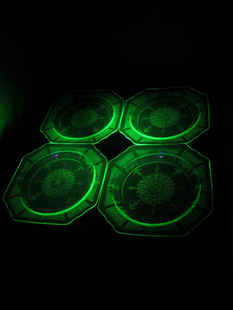 There is no damage to the glass plates and is in good collectible or displayable condition. The dinner plates glow vibrantly when exposed to a black light. Check pictures for more details and sizing. The lot comes with 4 plates.
