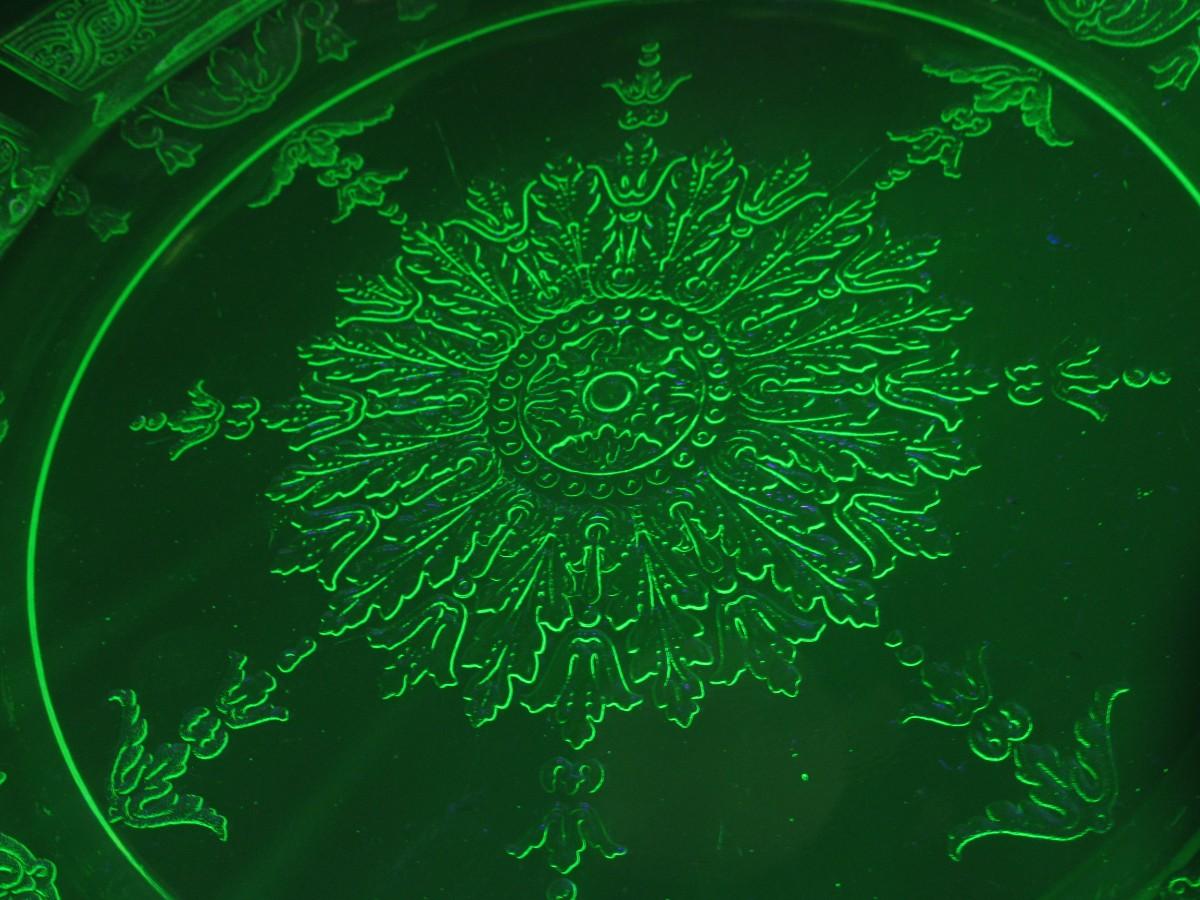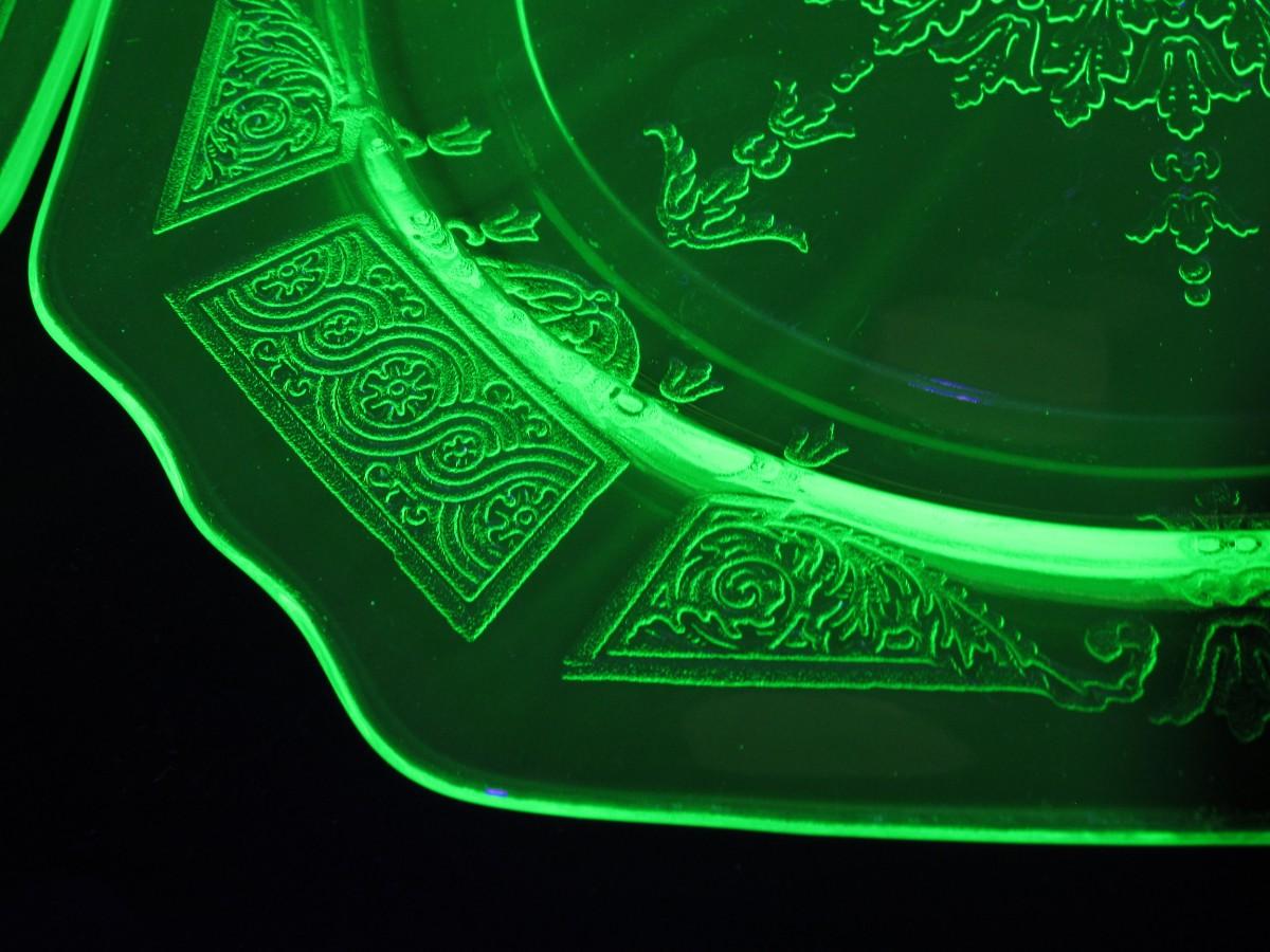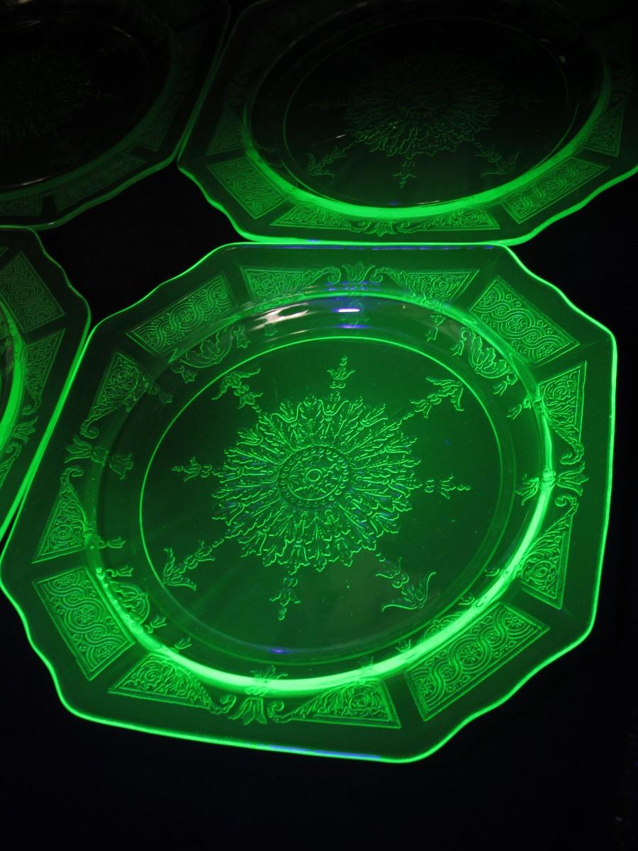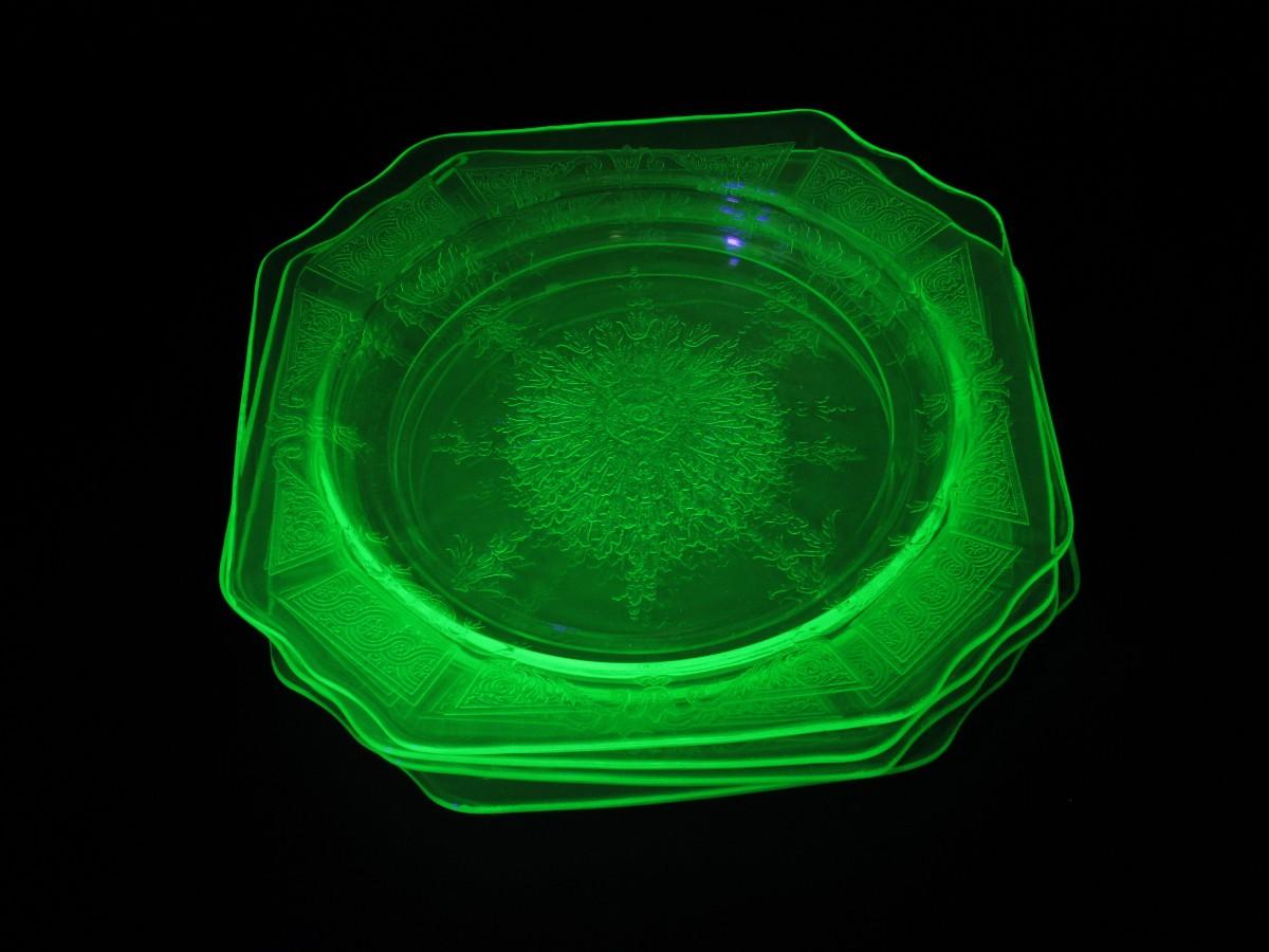 There is no damage to the glass plates and is in good collectible or displayable condition. The dinner plates glow vibrantly when exposed to a black light. Check pictures for more details and sizing. The lot comes with 4 plates.
