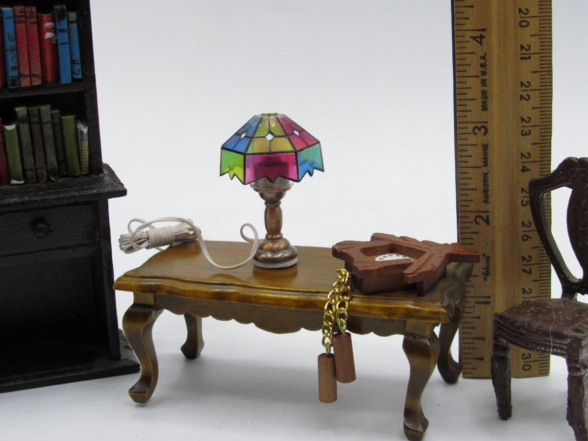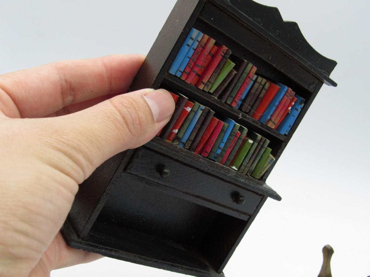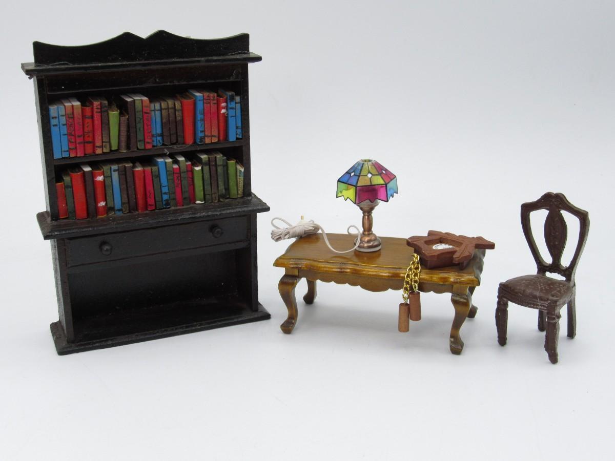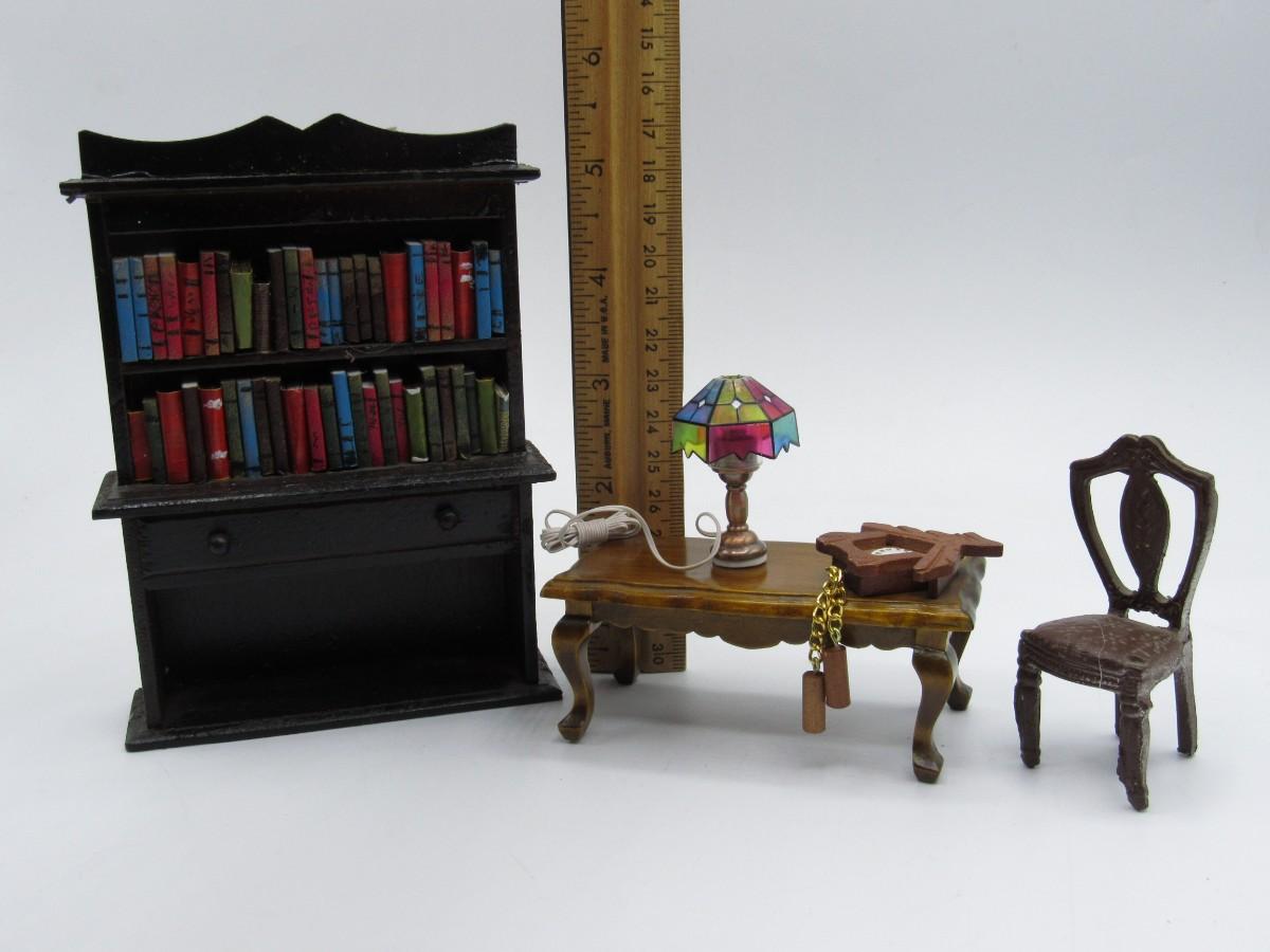 Vintage Miniature Dollhouse Furniture Model Pieces Library Book Shelf, Lamp, Table & More