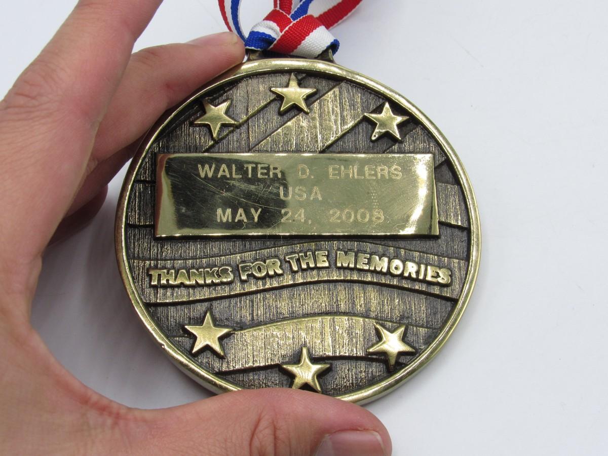 There is no damage to the medal and is in good collectible condition. The name of the recipient as well as the date is on the back of the medal. Check pictures for more details, the medal is heavy and has a good weight to it.