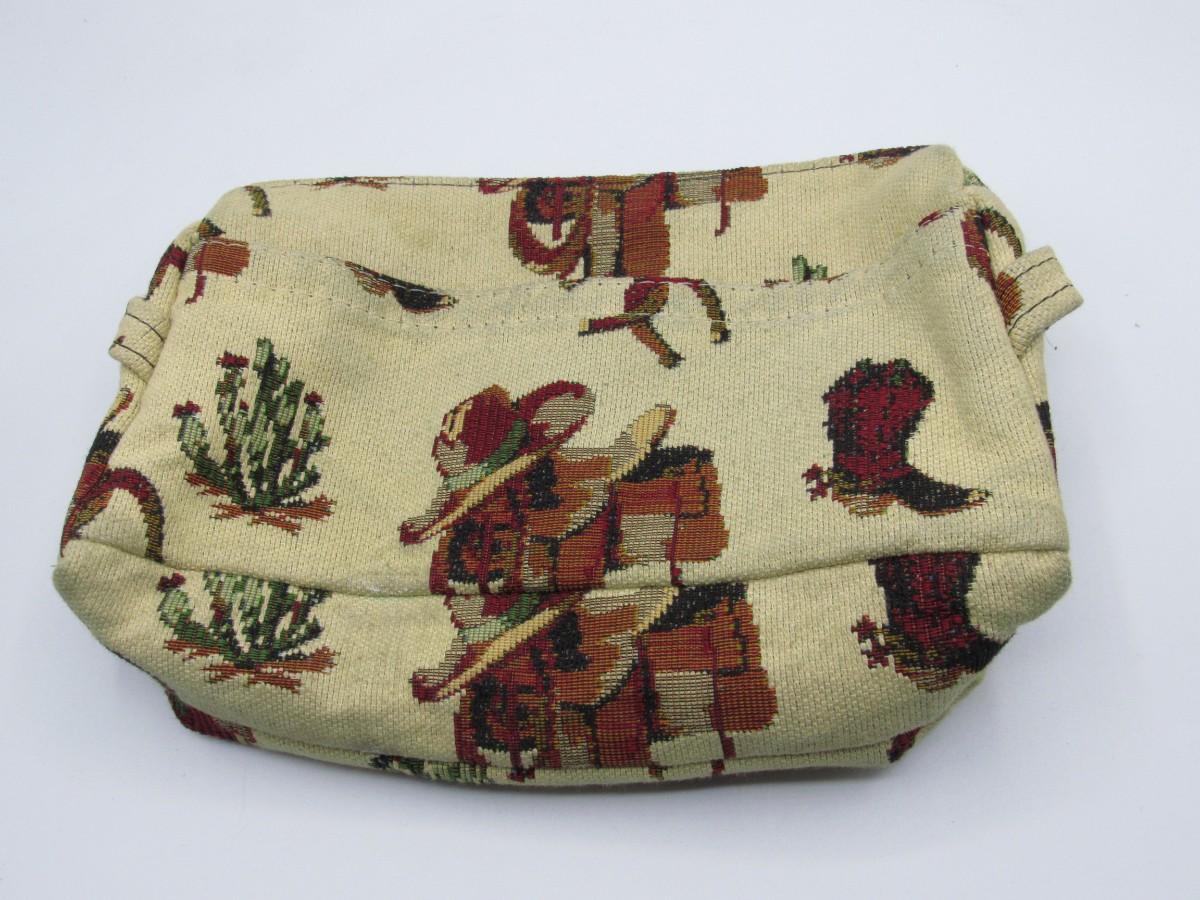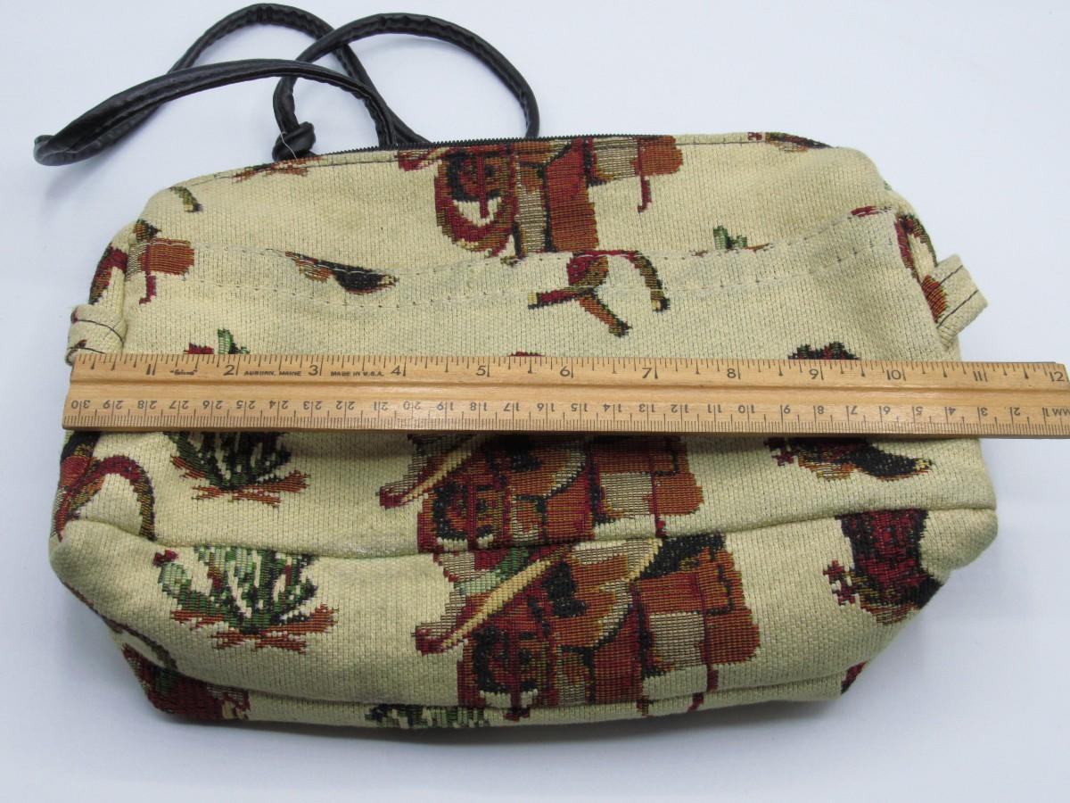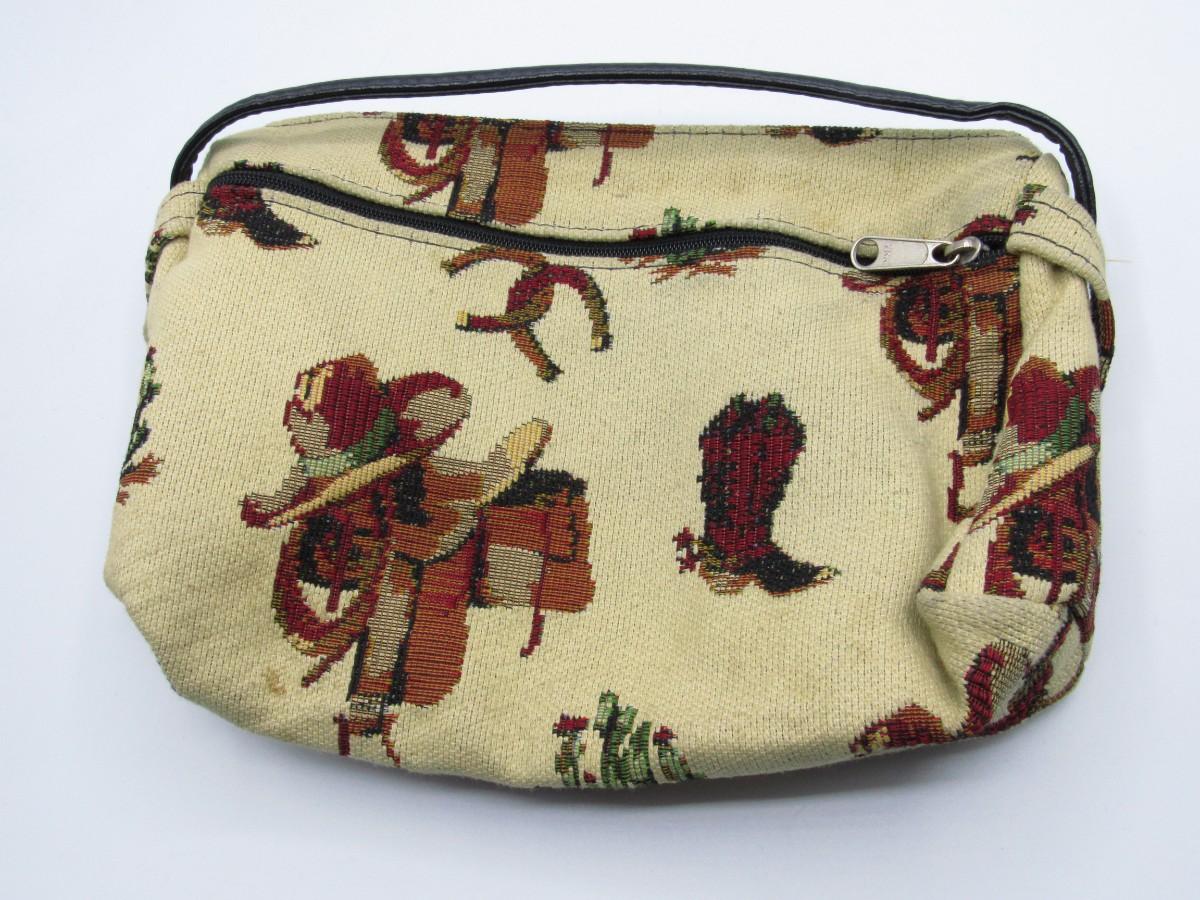 Bag has a fabric outer skin with western images (saddles, cowboy hats, boots, etc.). Attached black shoulder strap, zippered main area and outer compartment. Size approx. 11" long x 6" tall.