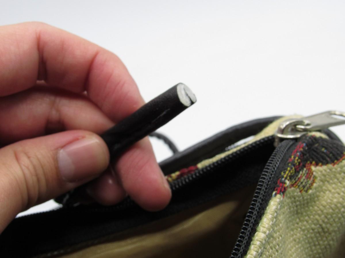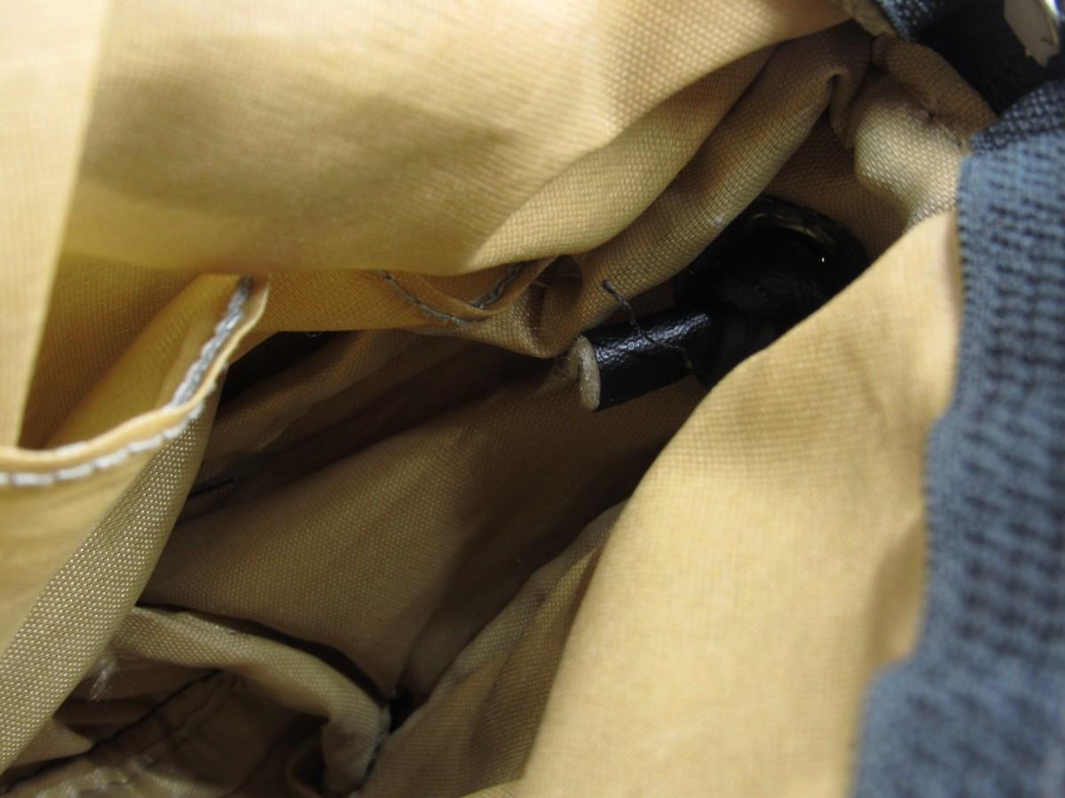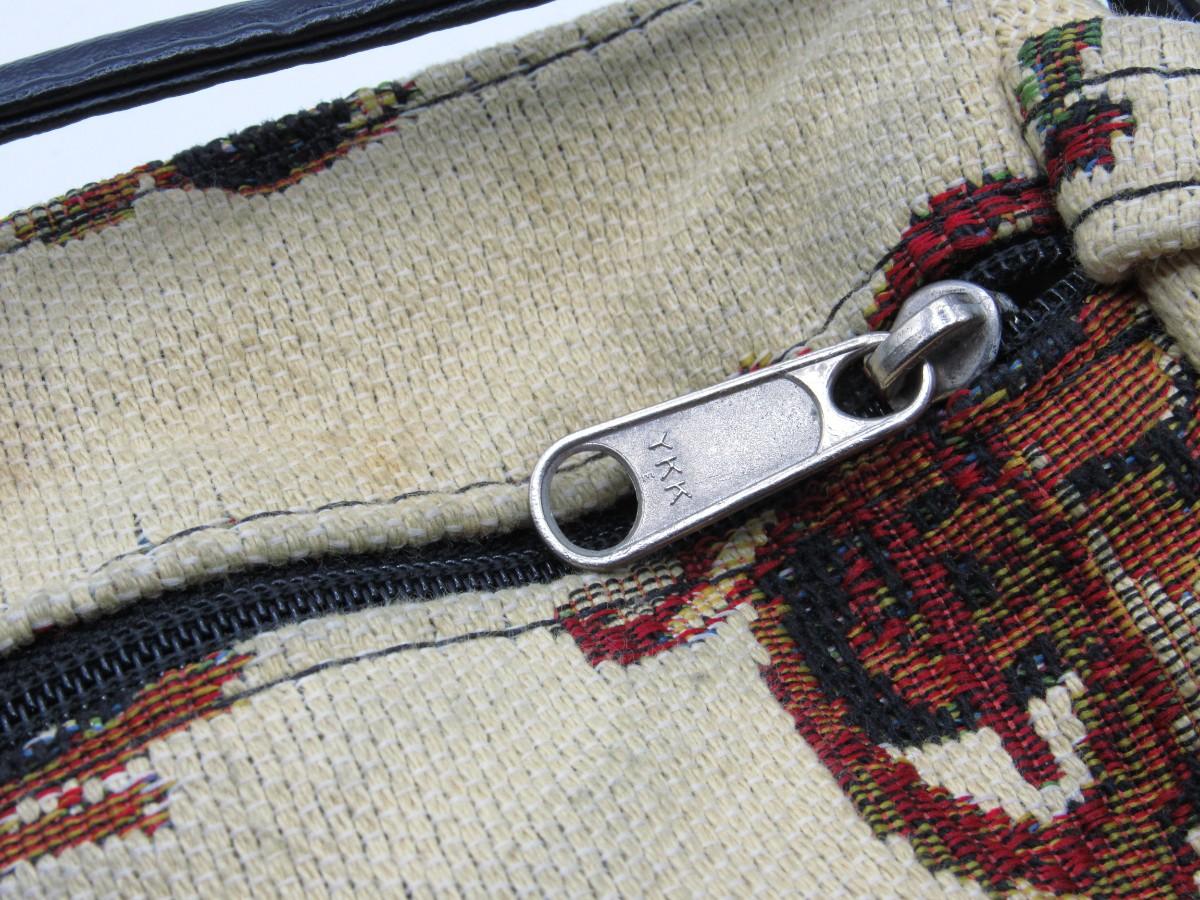 Bag has a fabric outer skin with western images (saddles, cowboy hats, boots, etc.). Attached black shoulder strap, zippered main area and outer compartment. Size approx. 11" long x 6" tall.