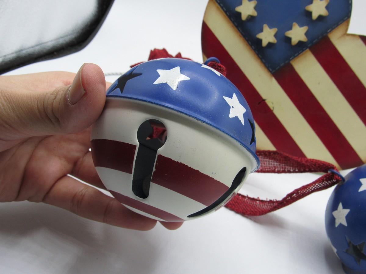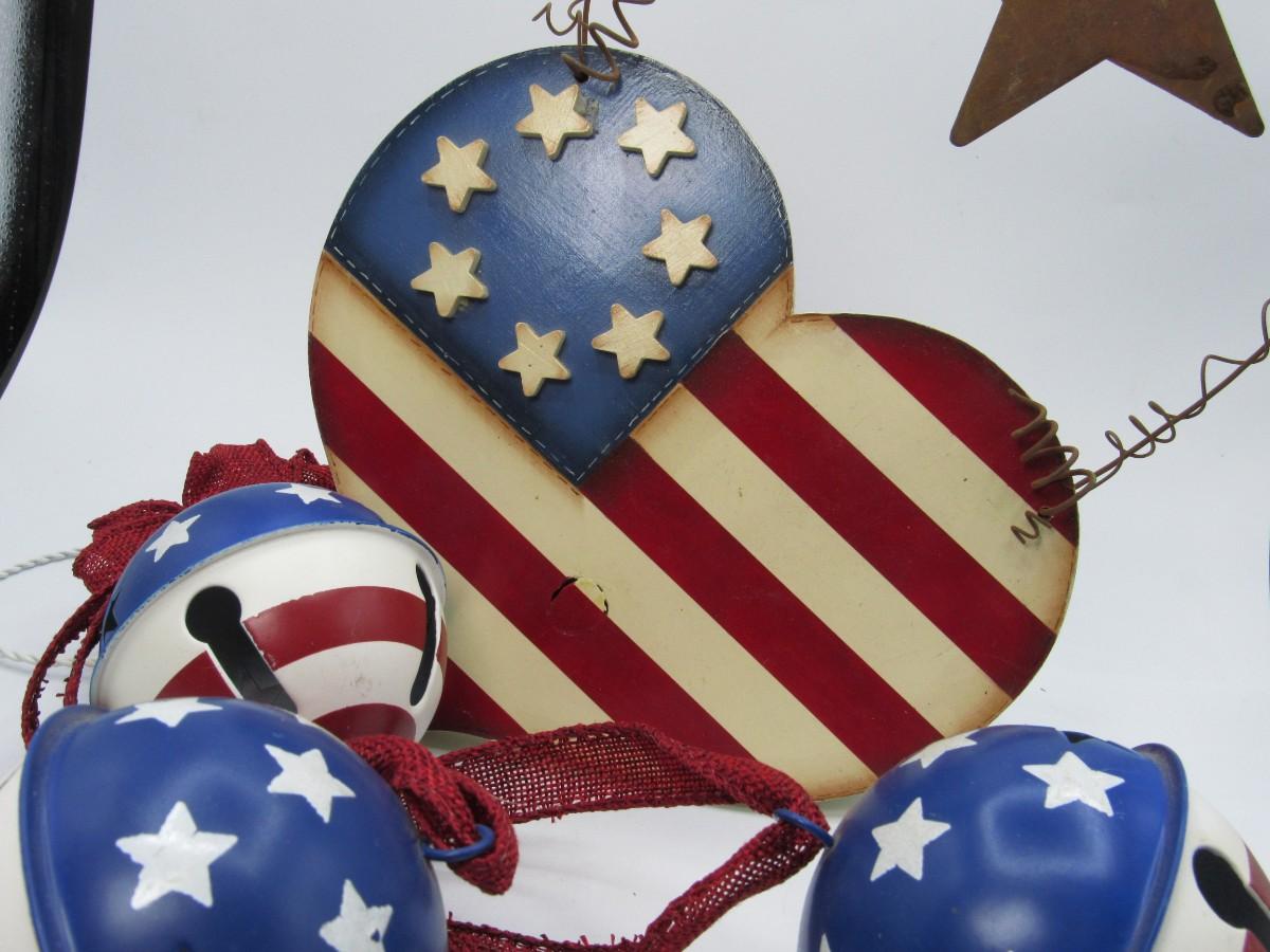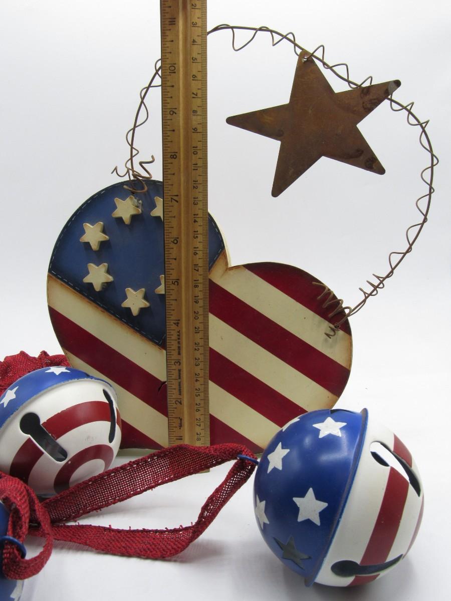 Fourth of July Decorations Lot Red White & Blue wall hanging and 3 painted bells