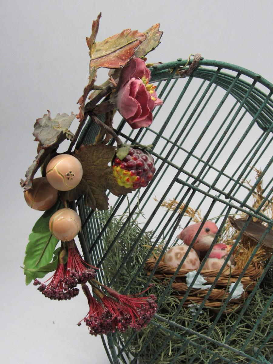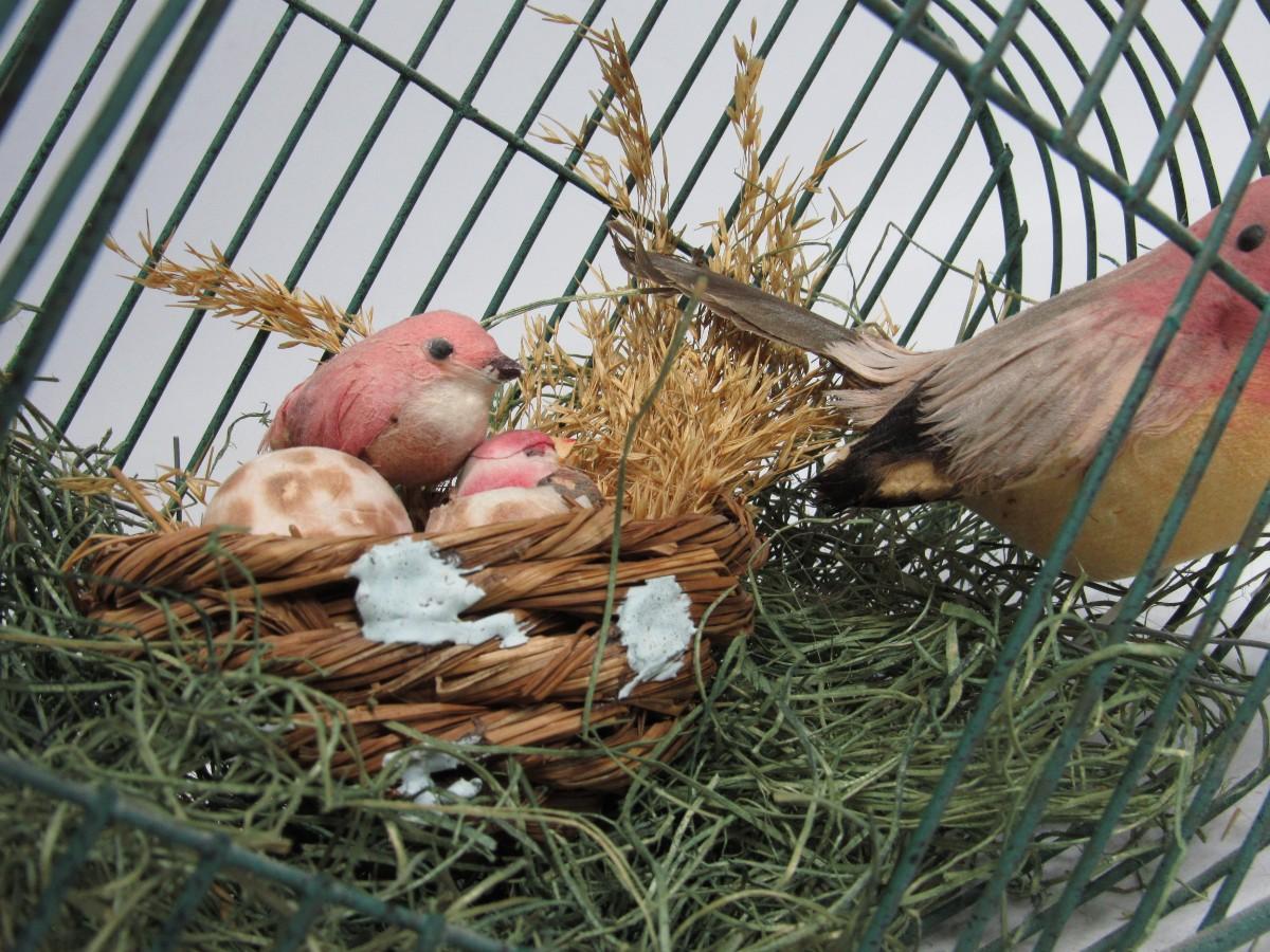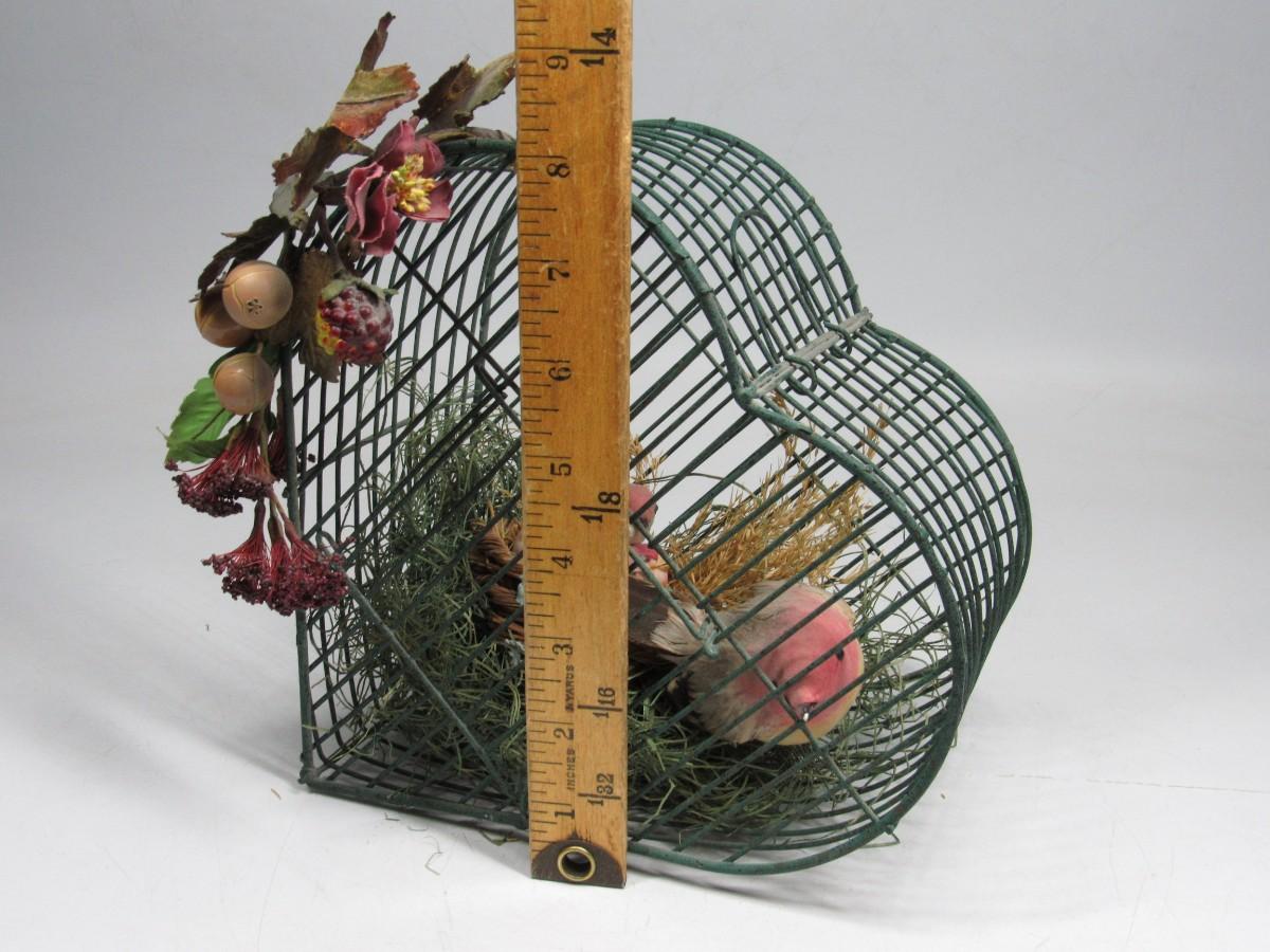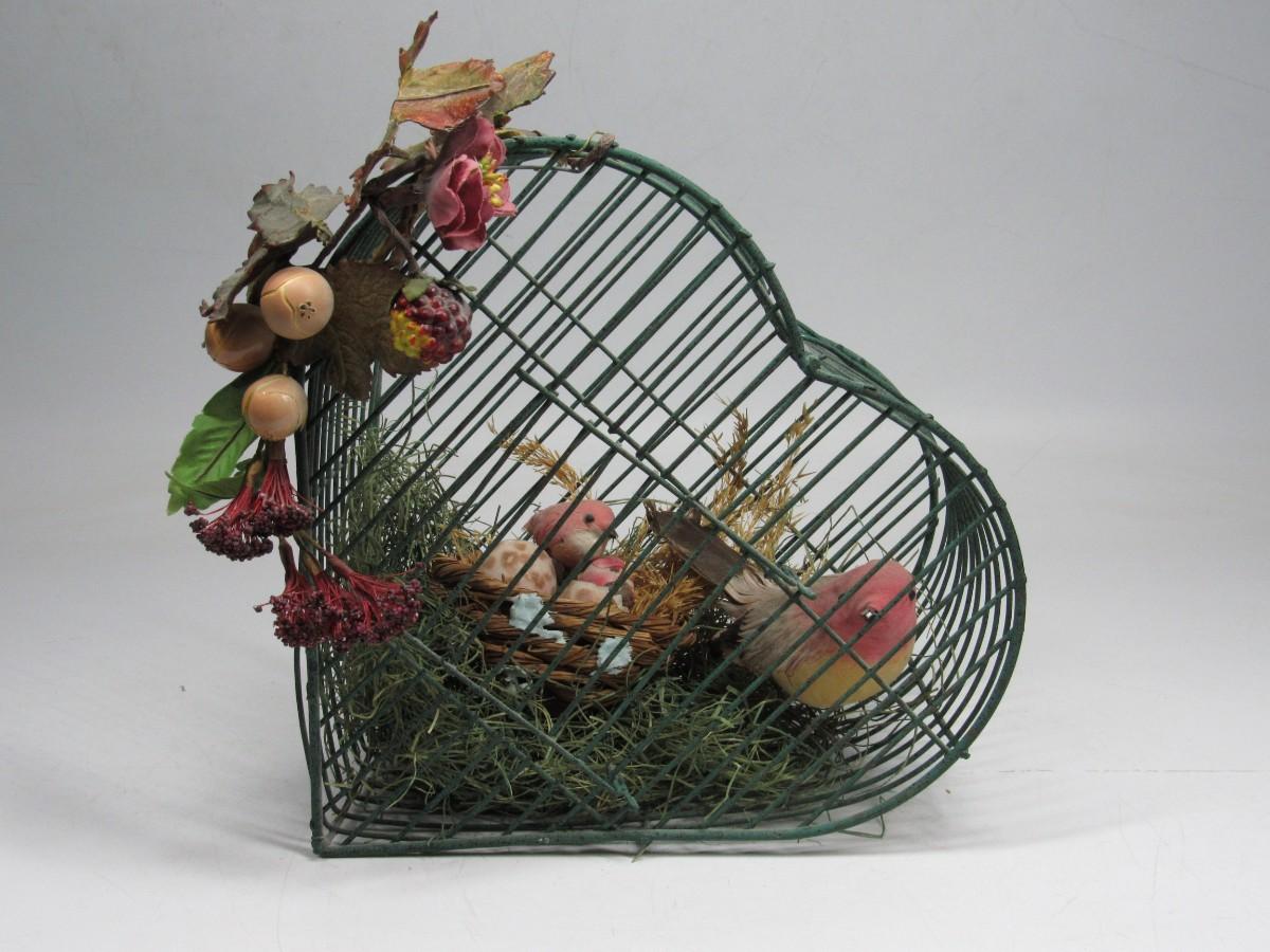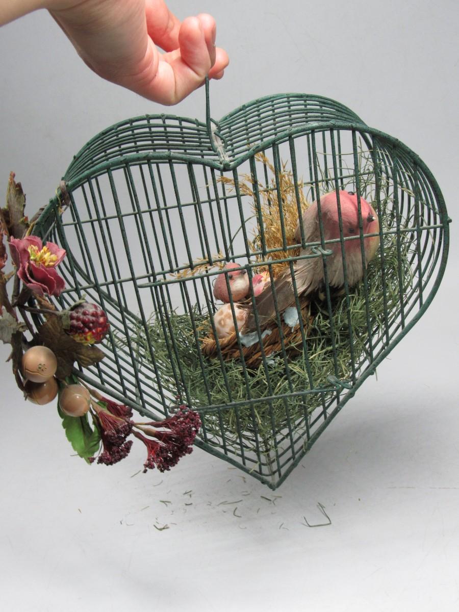 Hanging Decor Heart Shaped Metal Bird Cage with Faux Birds Nesting