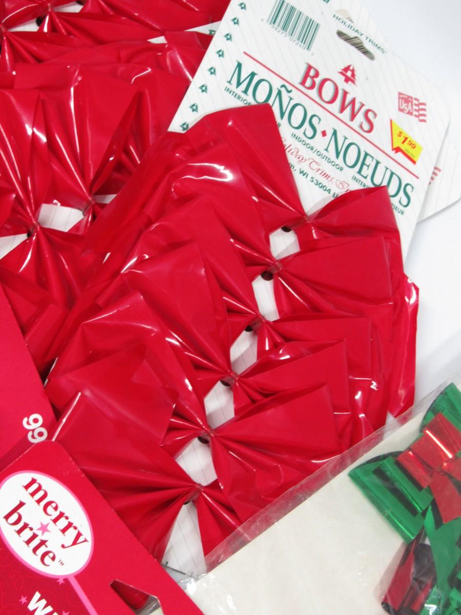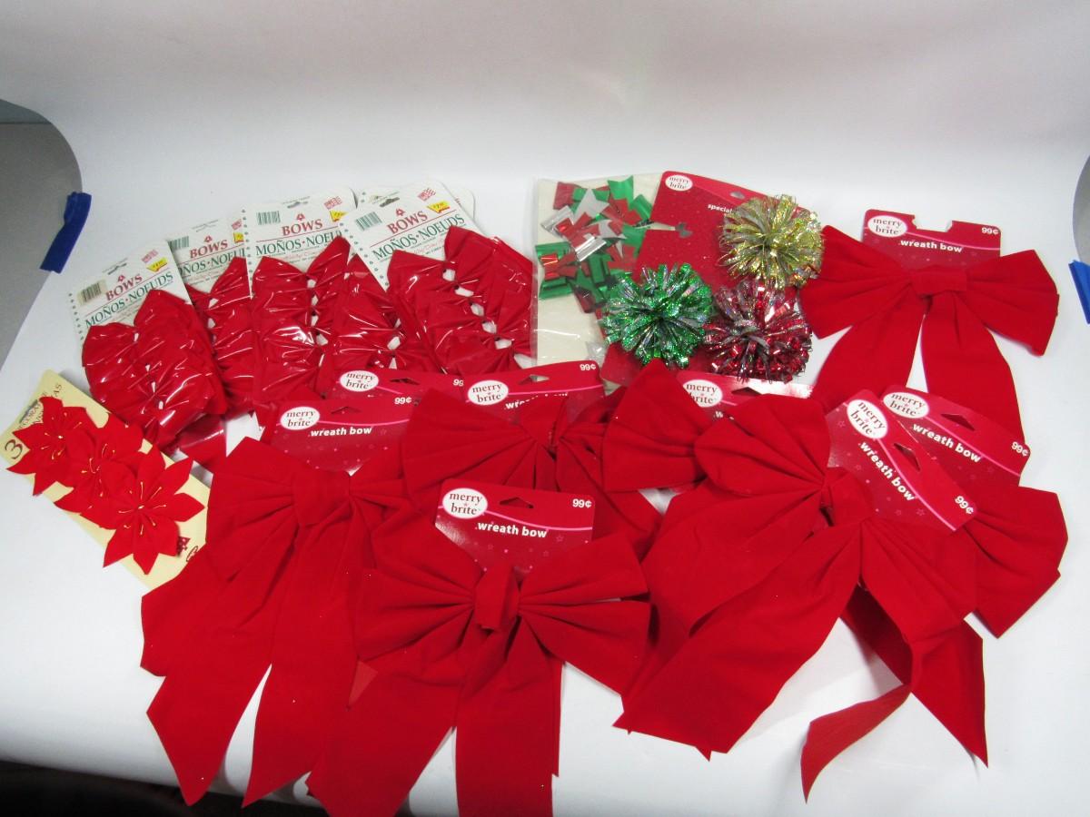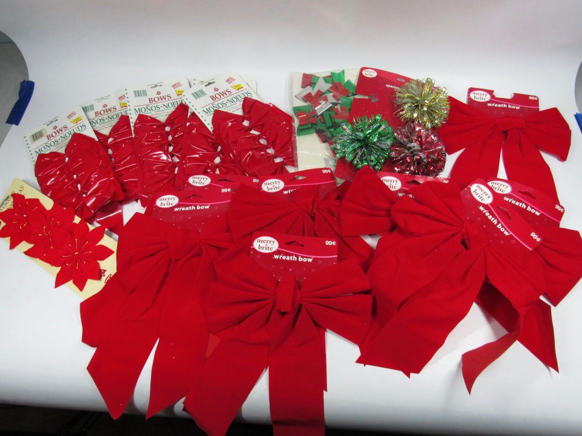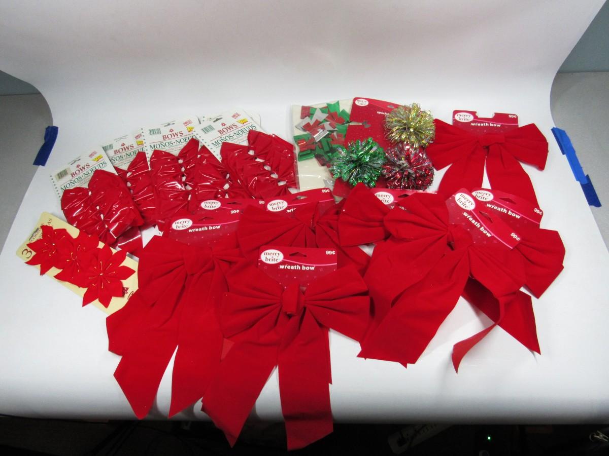 In mostly new condition. Many red wreath bows, along with other Christmas decorative items. See photos for what's included.