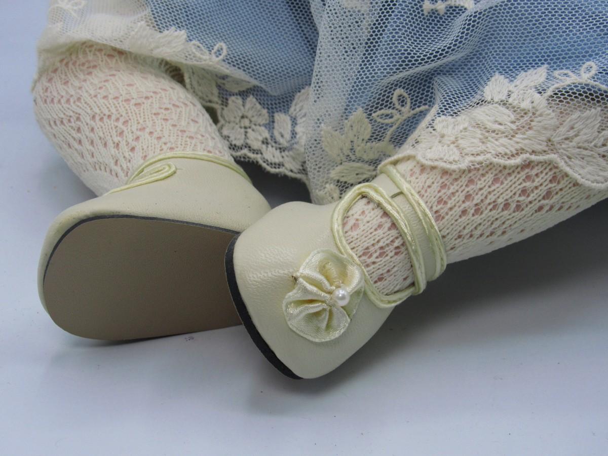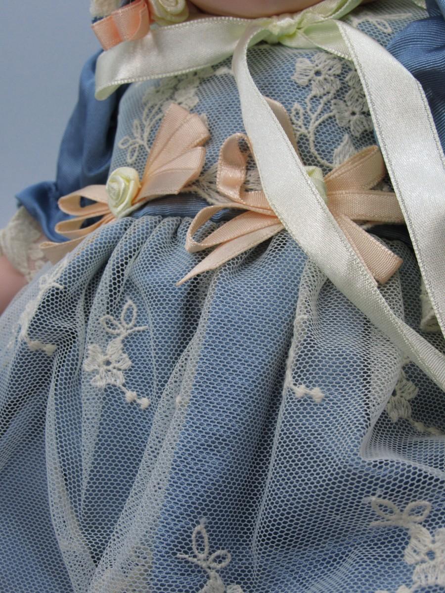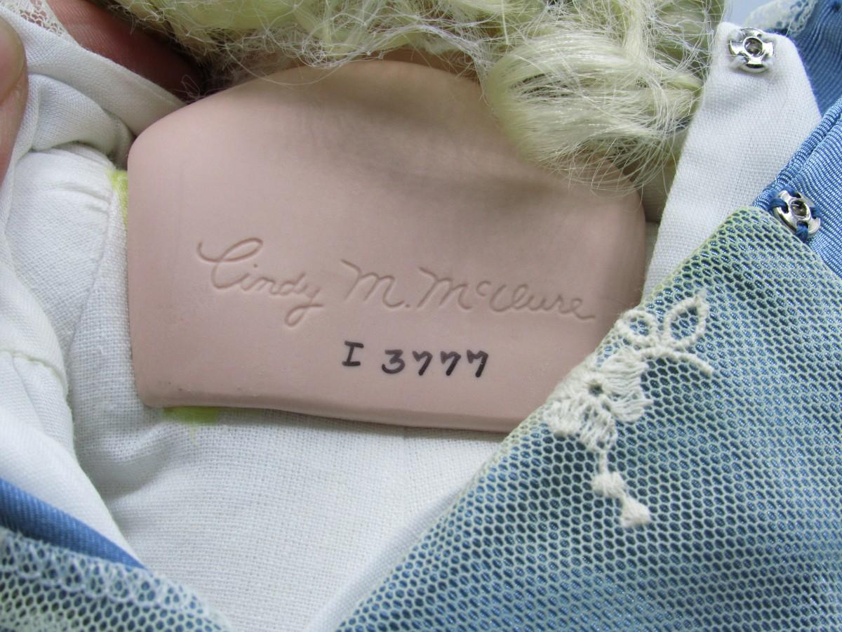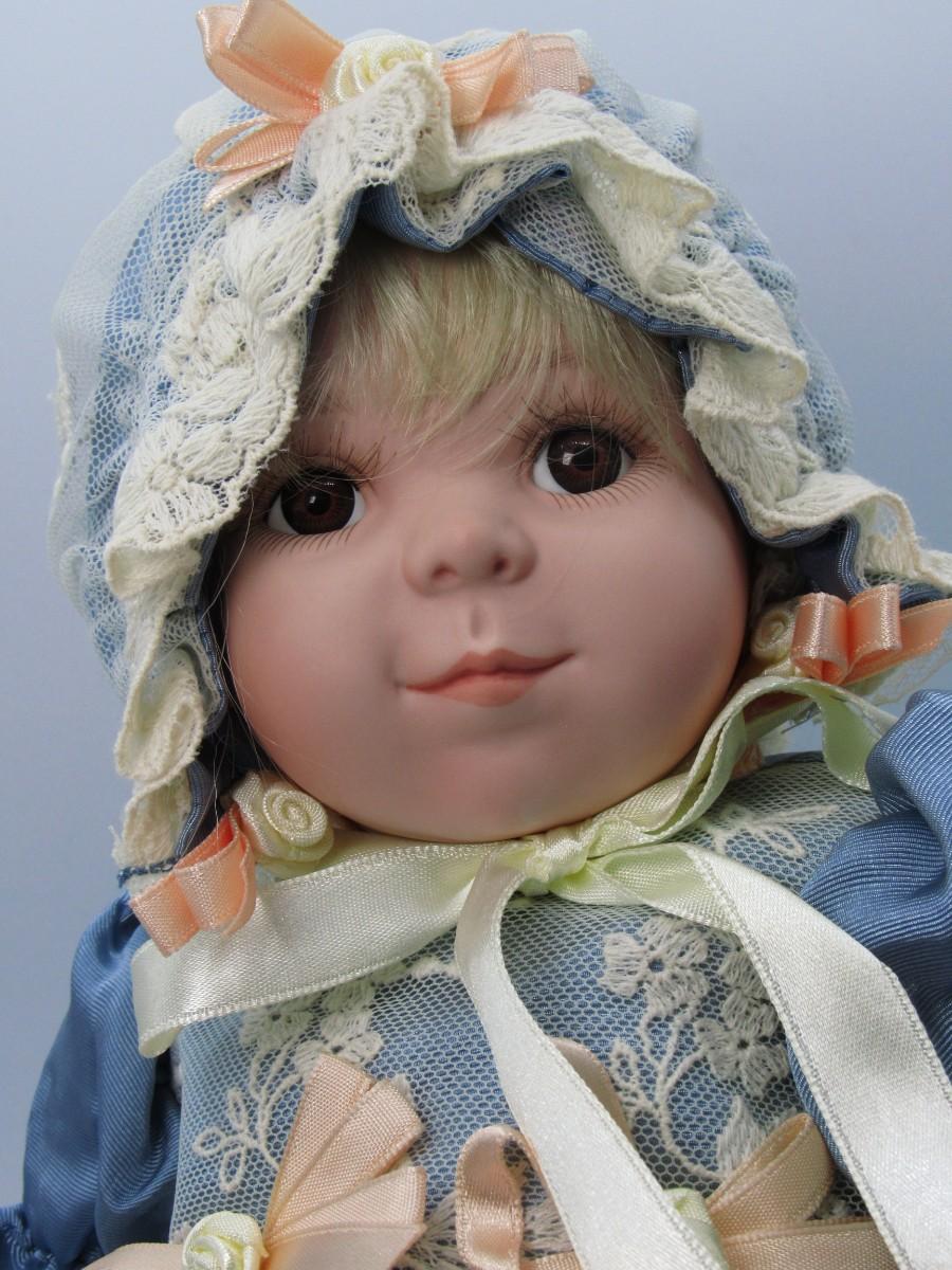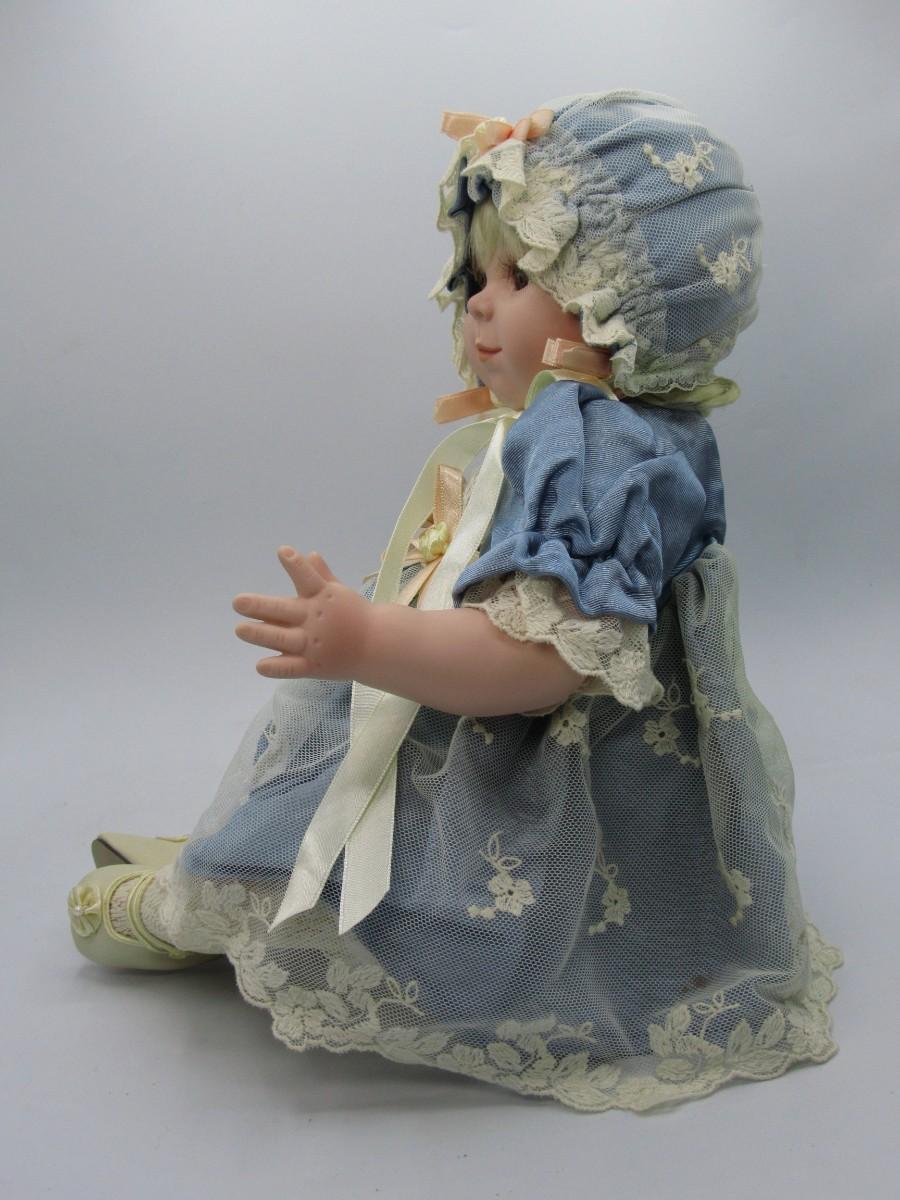Cindy M. McClure Sitting Porcelain Doll in Blue Dress with Bonnet