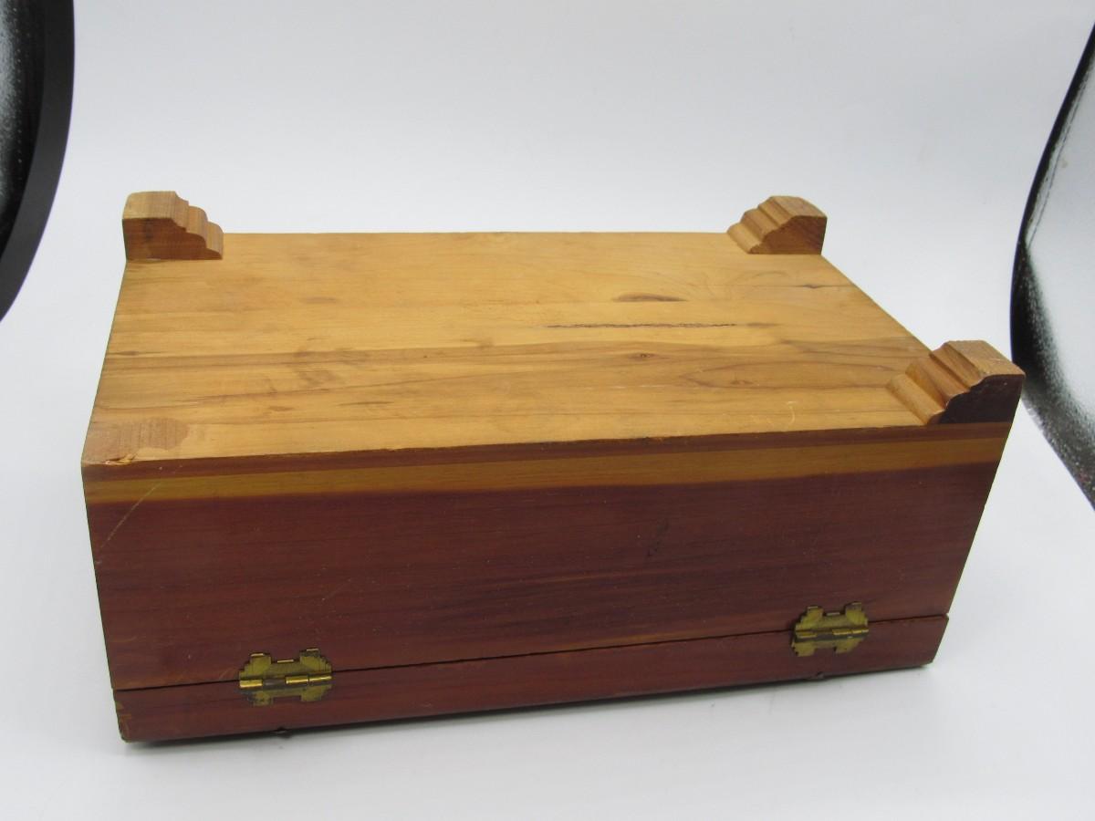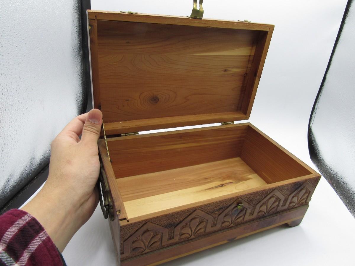 There is wear to the box, a missing leg, and the latch is damaged. Check pictures for more details and for general sizing.