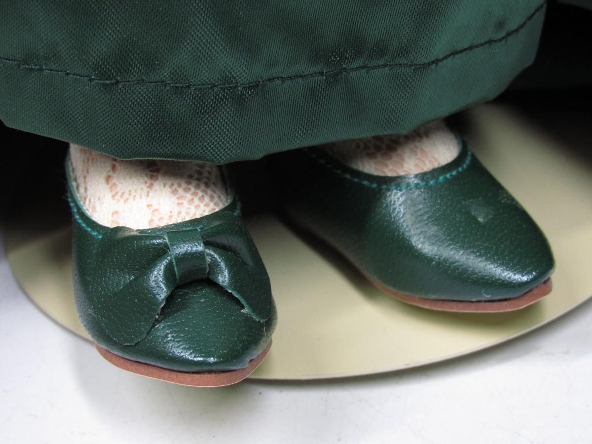 There is no damage to the doll or the costume and is in good collectible or displayable condition. Check pictures for more details and sizing, comes with the display stand. One of the bows on her shoes is missing.