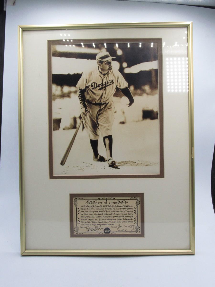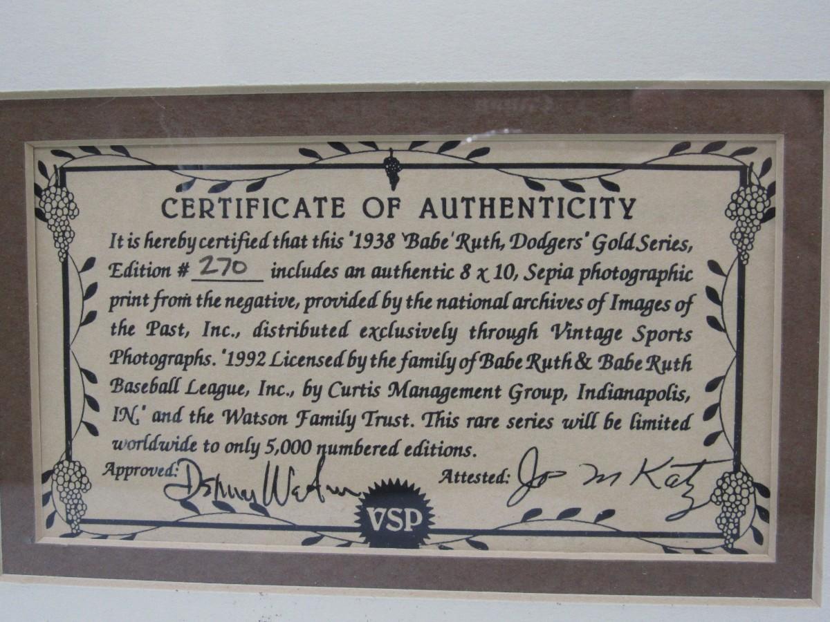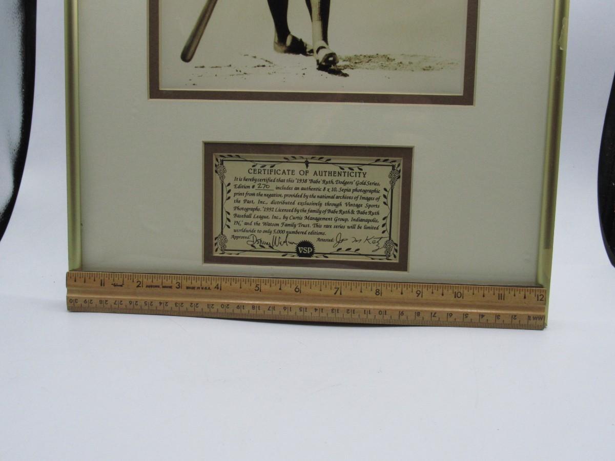 Rare 1938 Babe Ruth Dodgers Framed Sepia Photo Print Numbered & Signed by D. Watson Photographer with COA