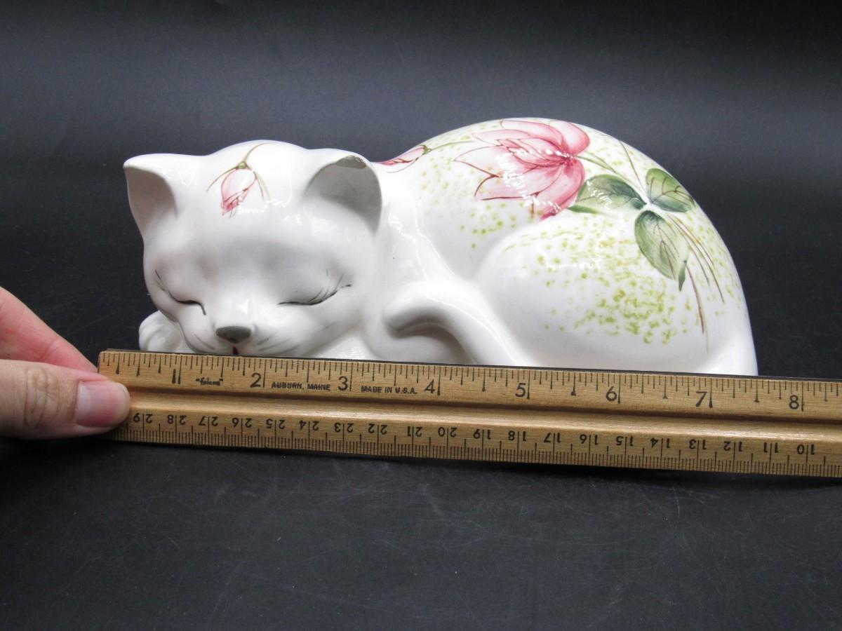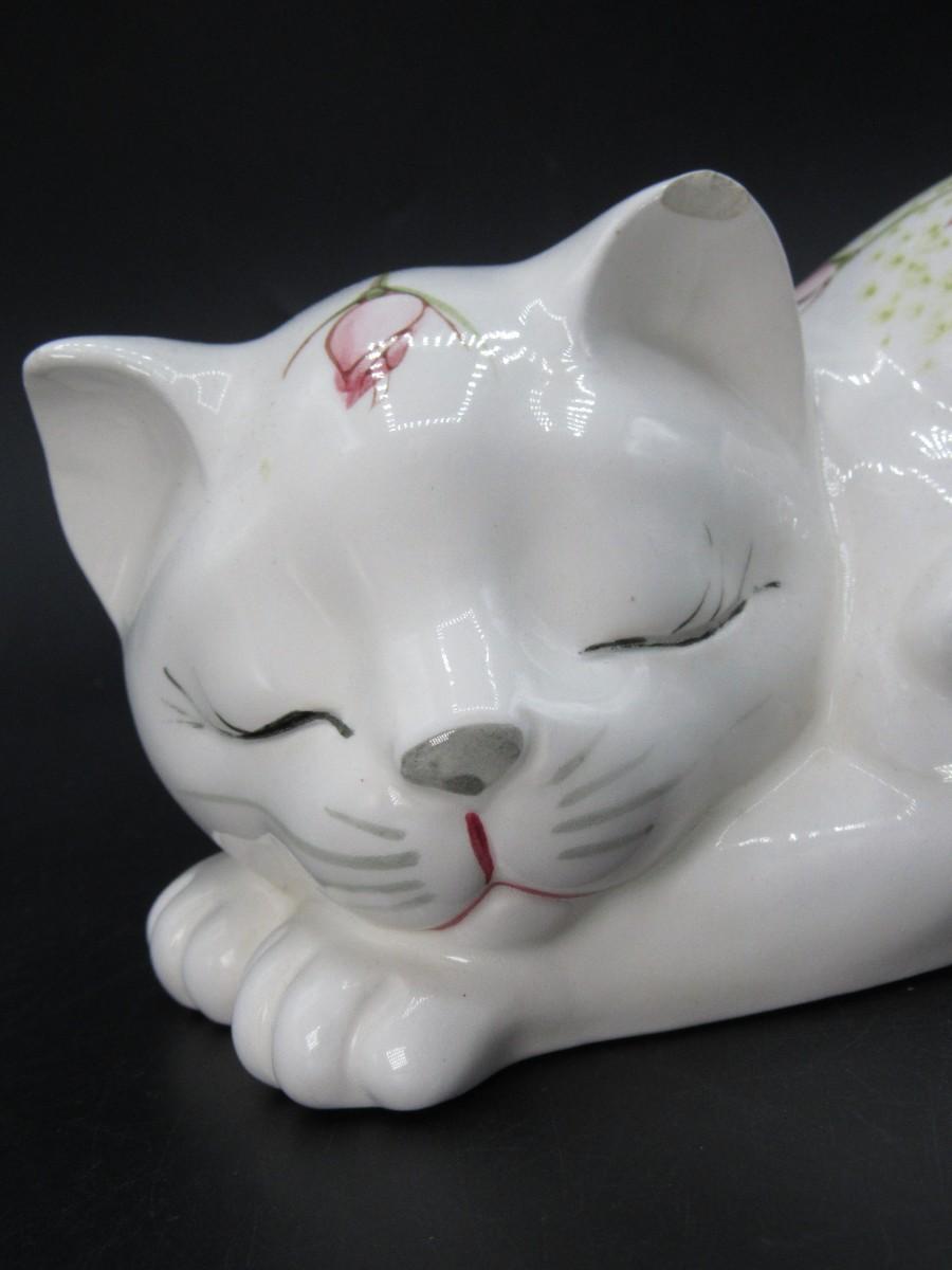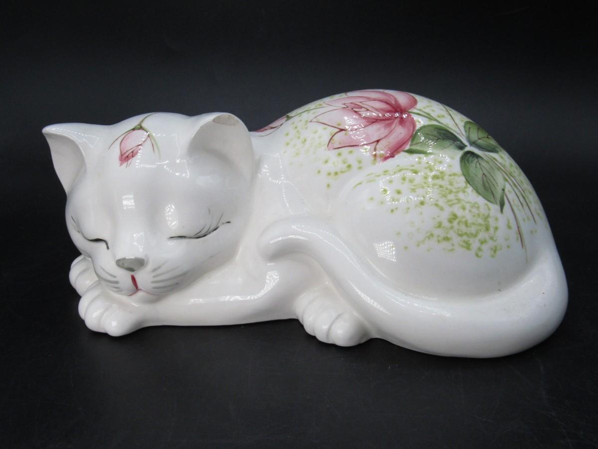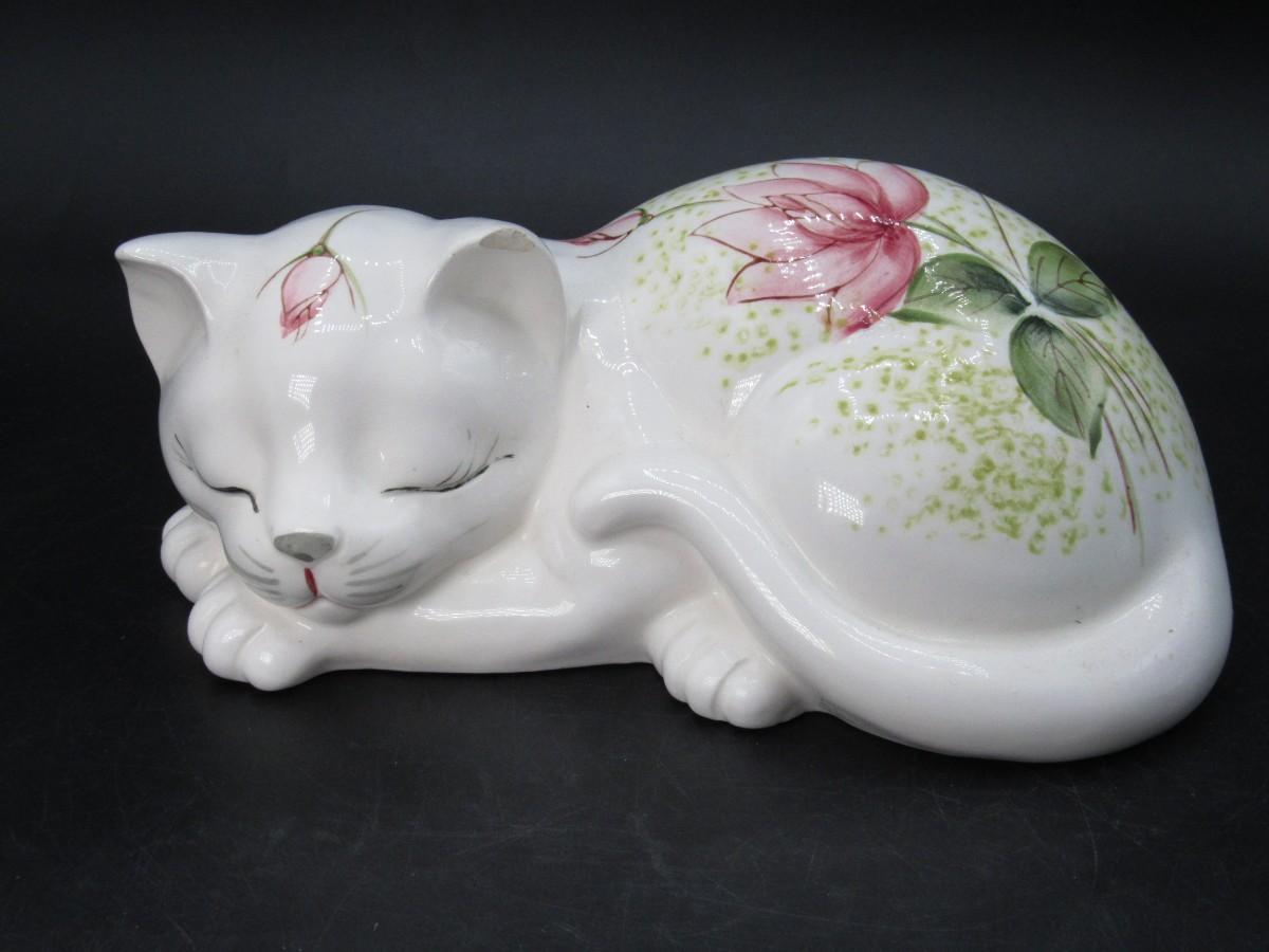 Ceramic Sleeping Cat Figurine with Flower made in Japan