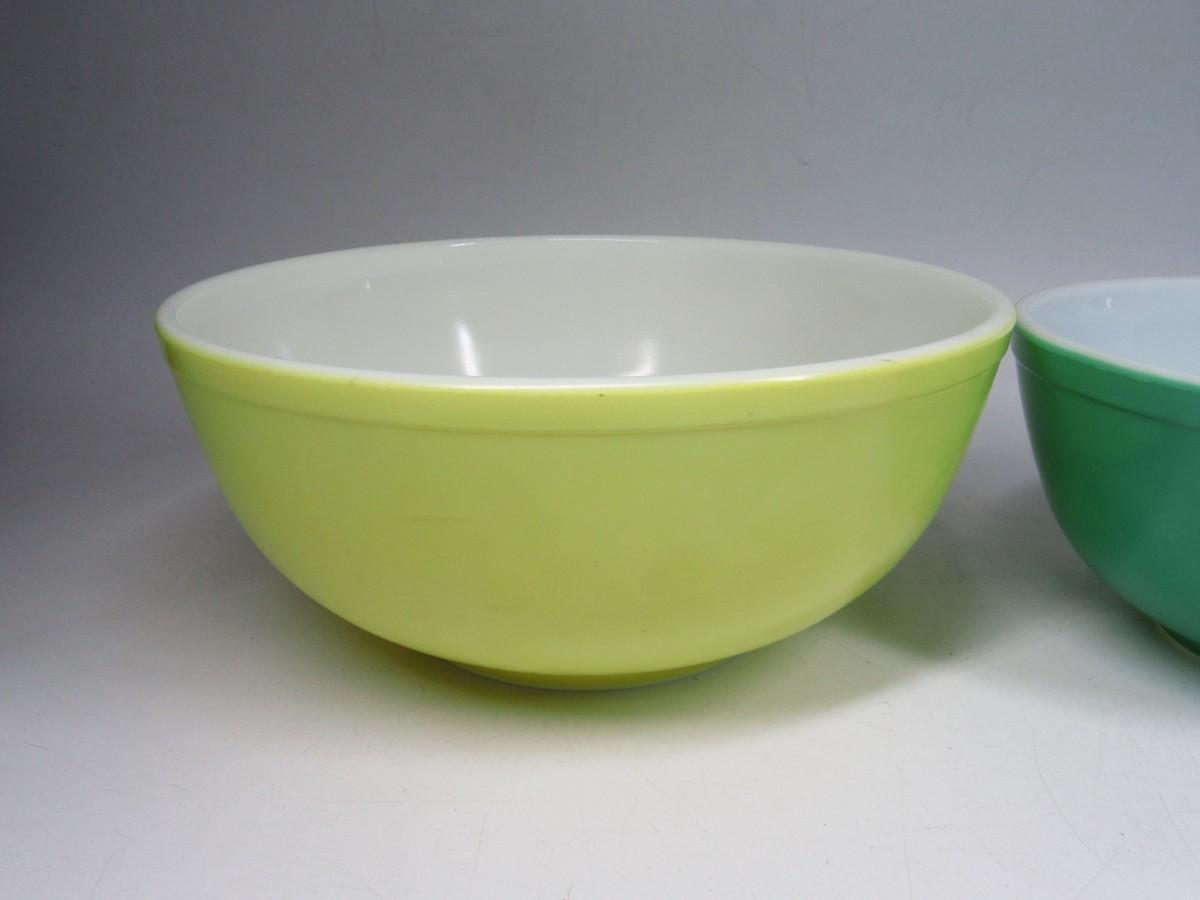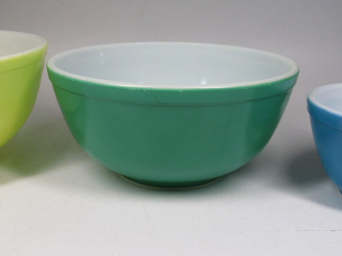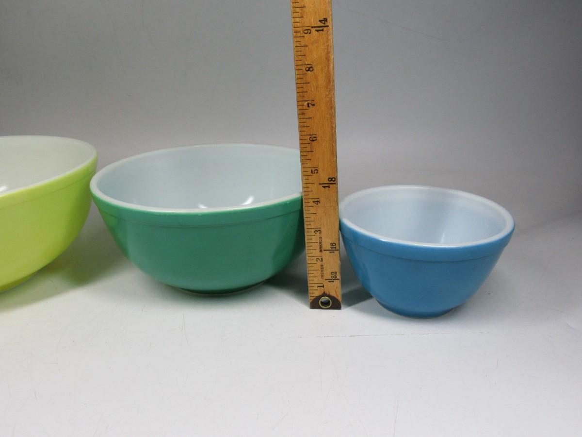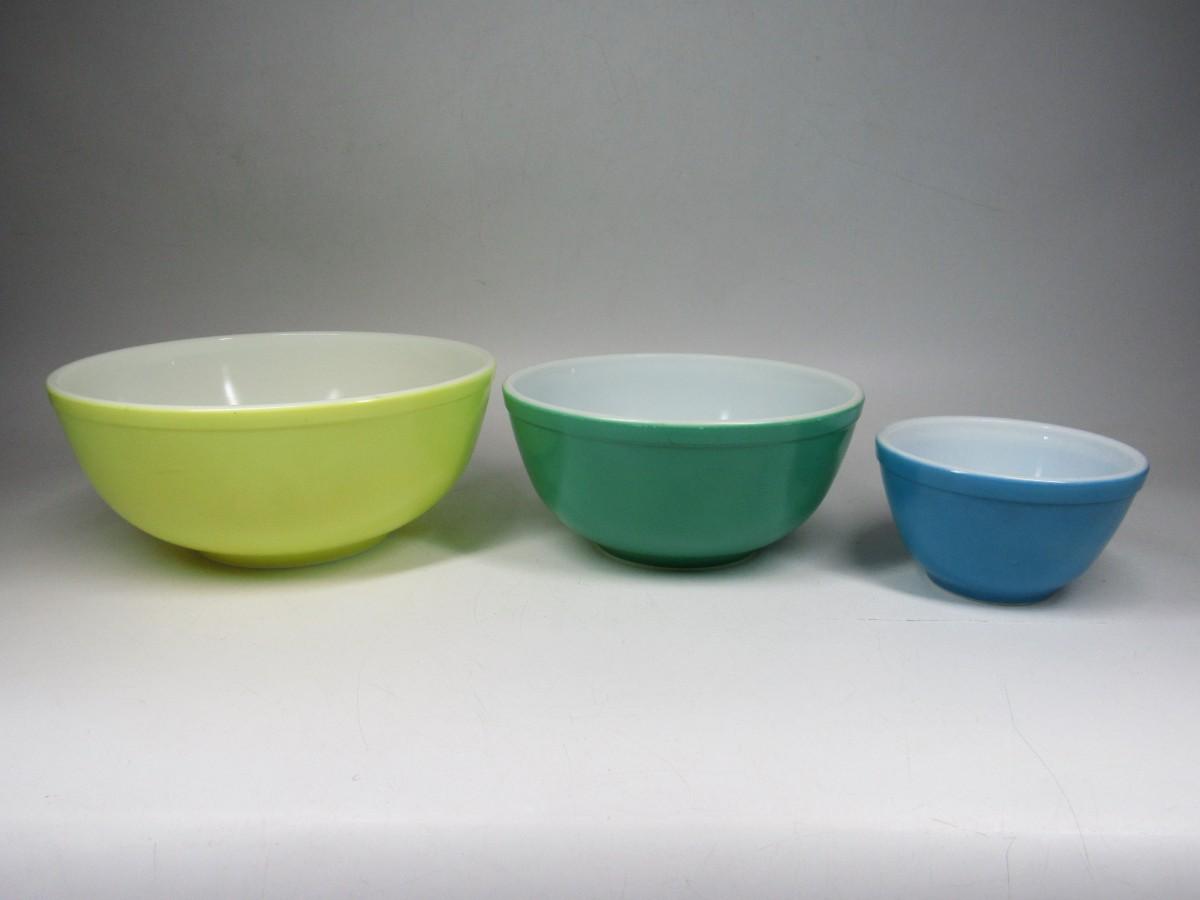 Three piece, Pyrex mixing bowl set ““ yellow bowl, green bowl and blue bowl