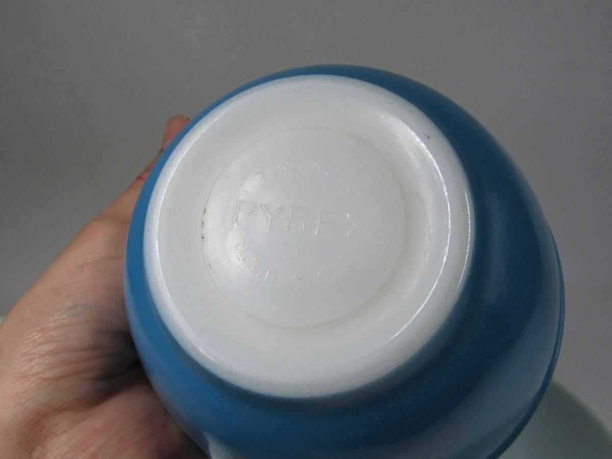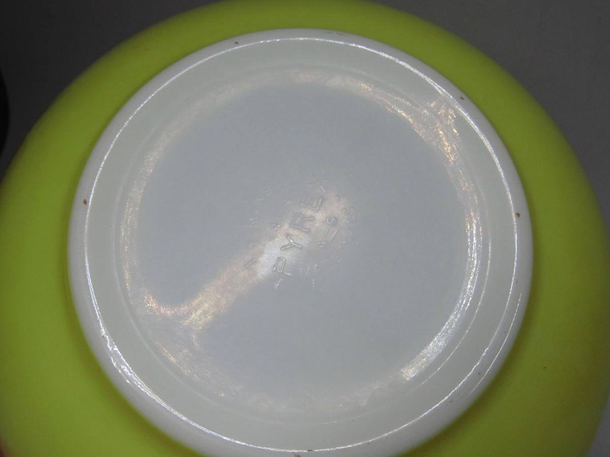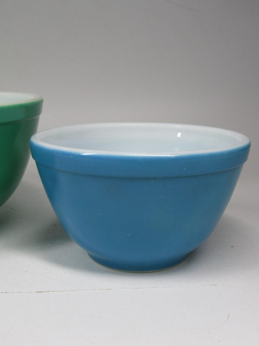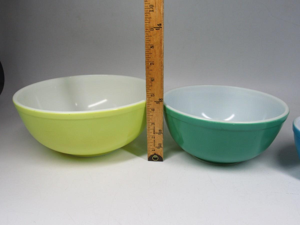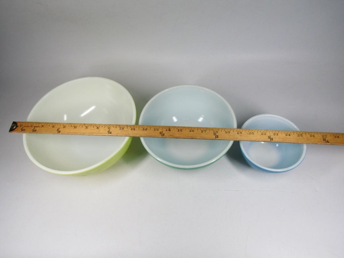 Three piece, Pyrex mixing bowl set ““ yellow bowl, green bowl and blue bowl