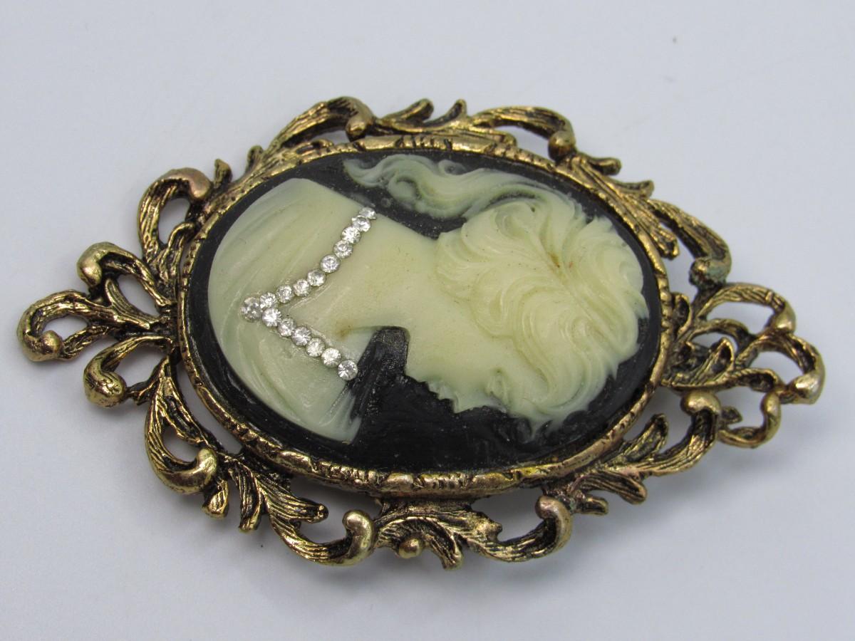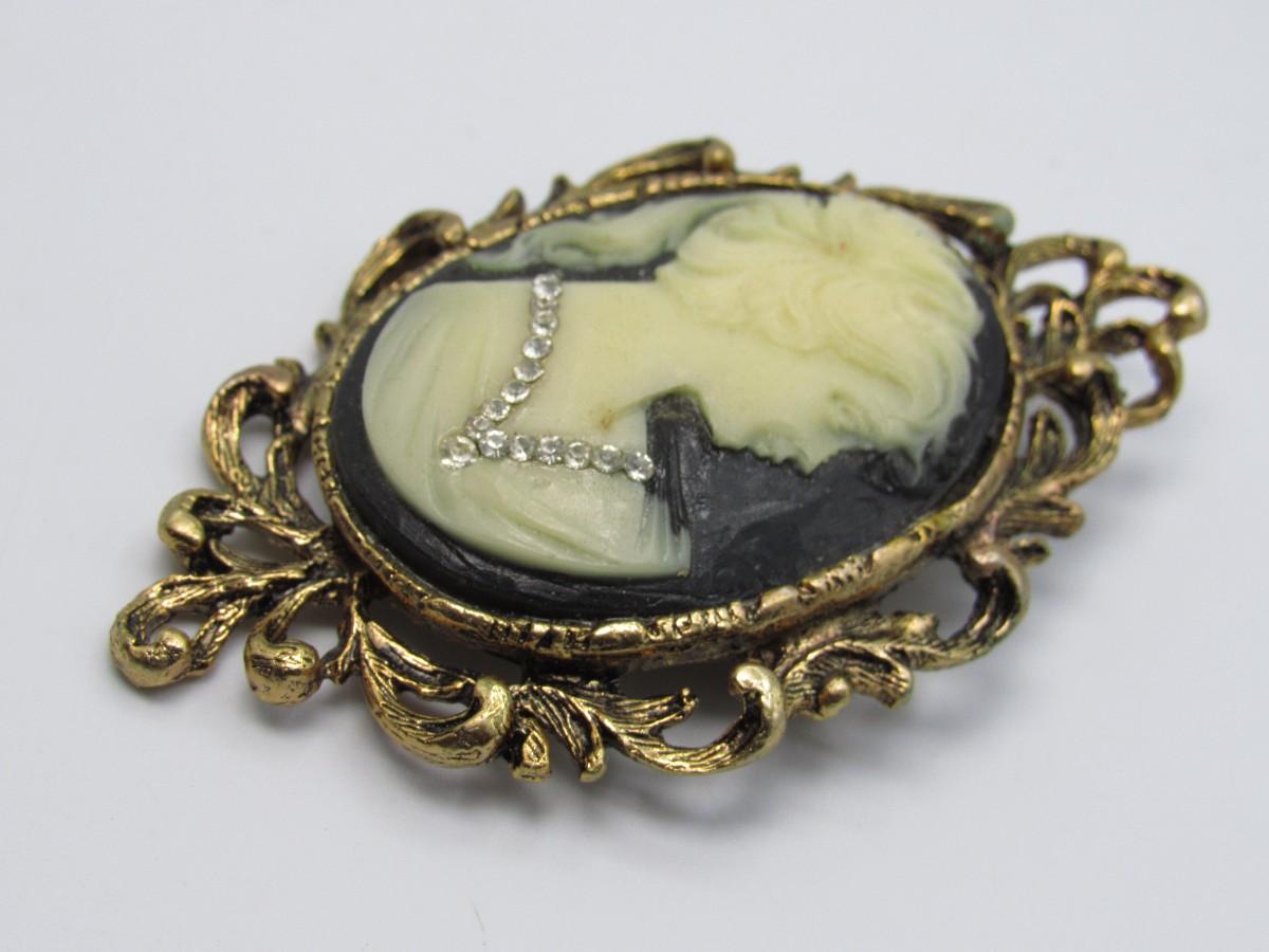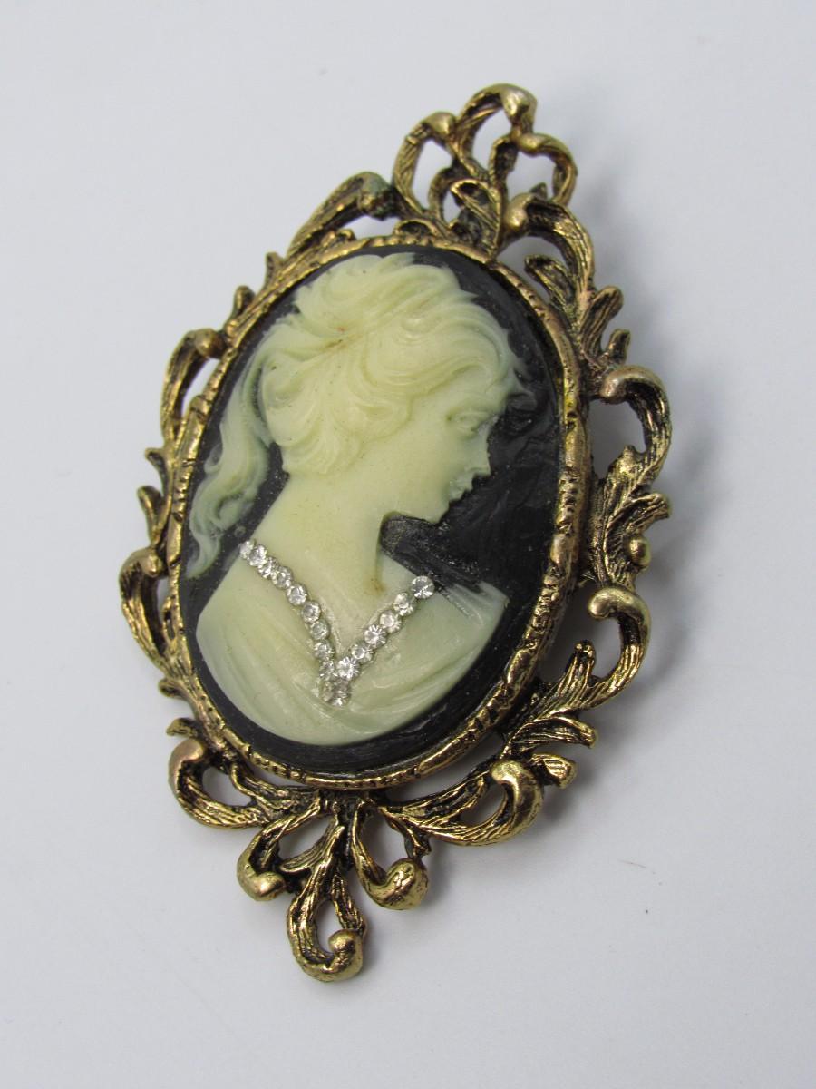 Cameo beautiful lady with ponytail brooch pin gold tone