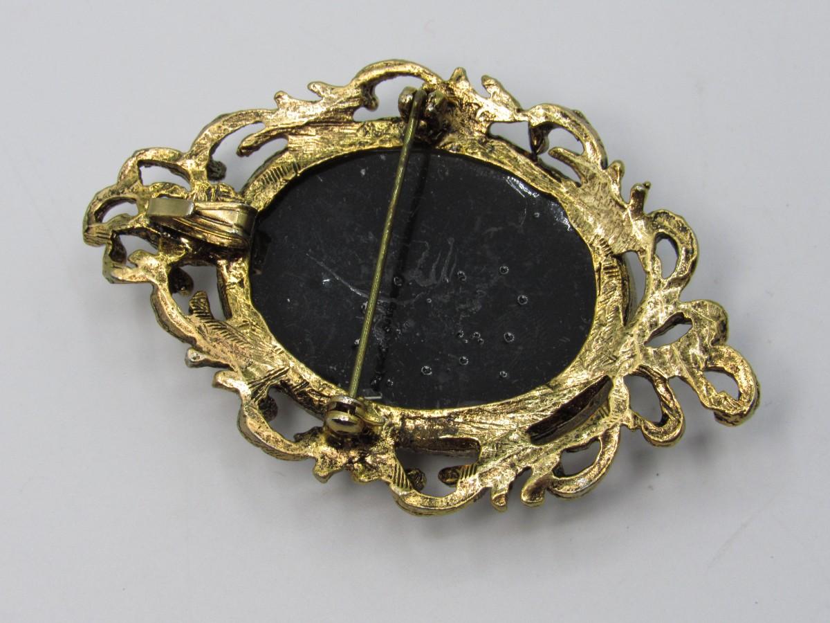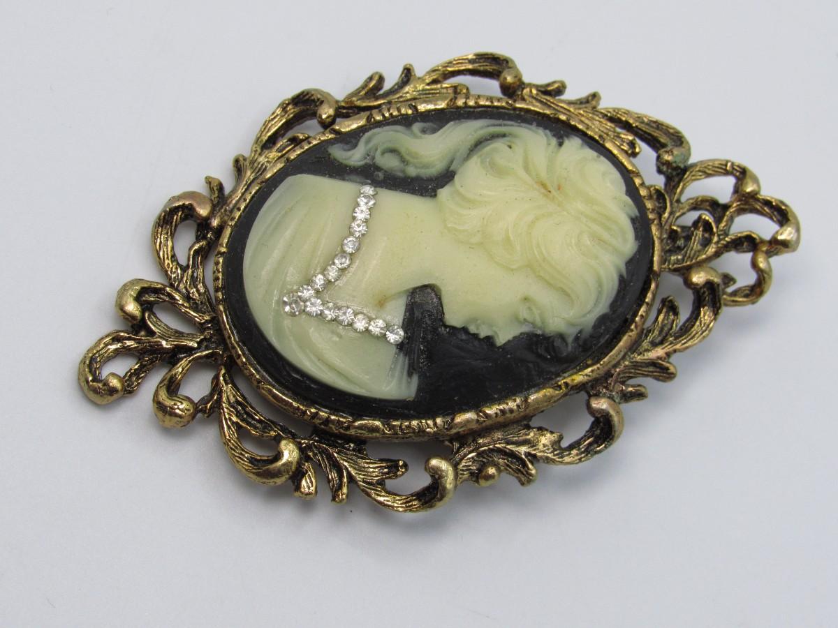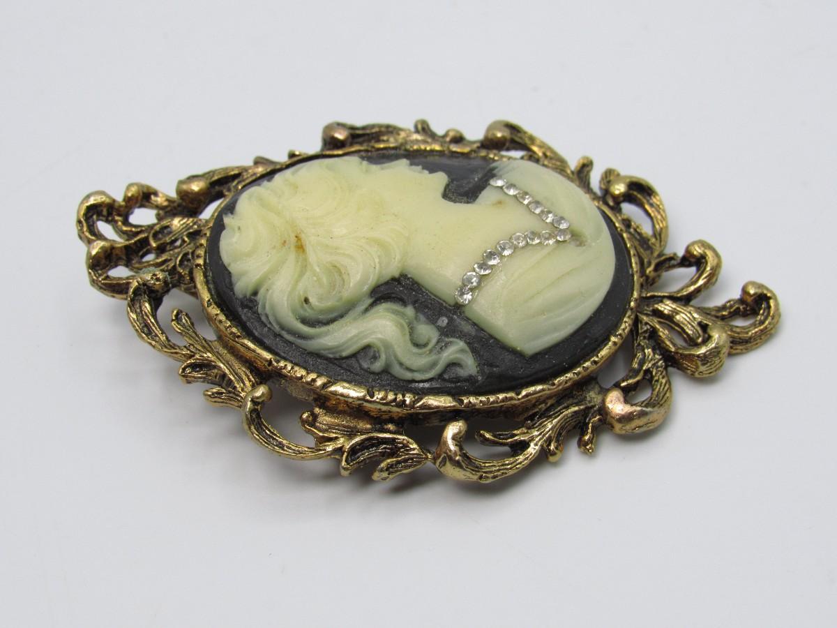 Cameo beautiful lady with ponytail brooch pin gold tone