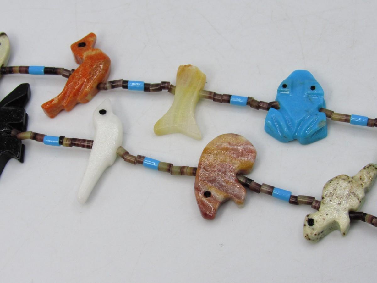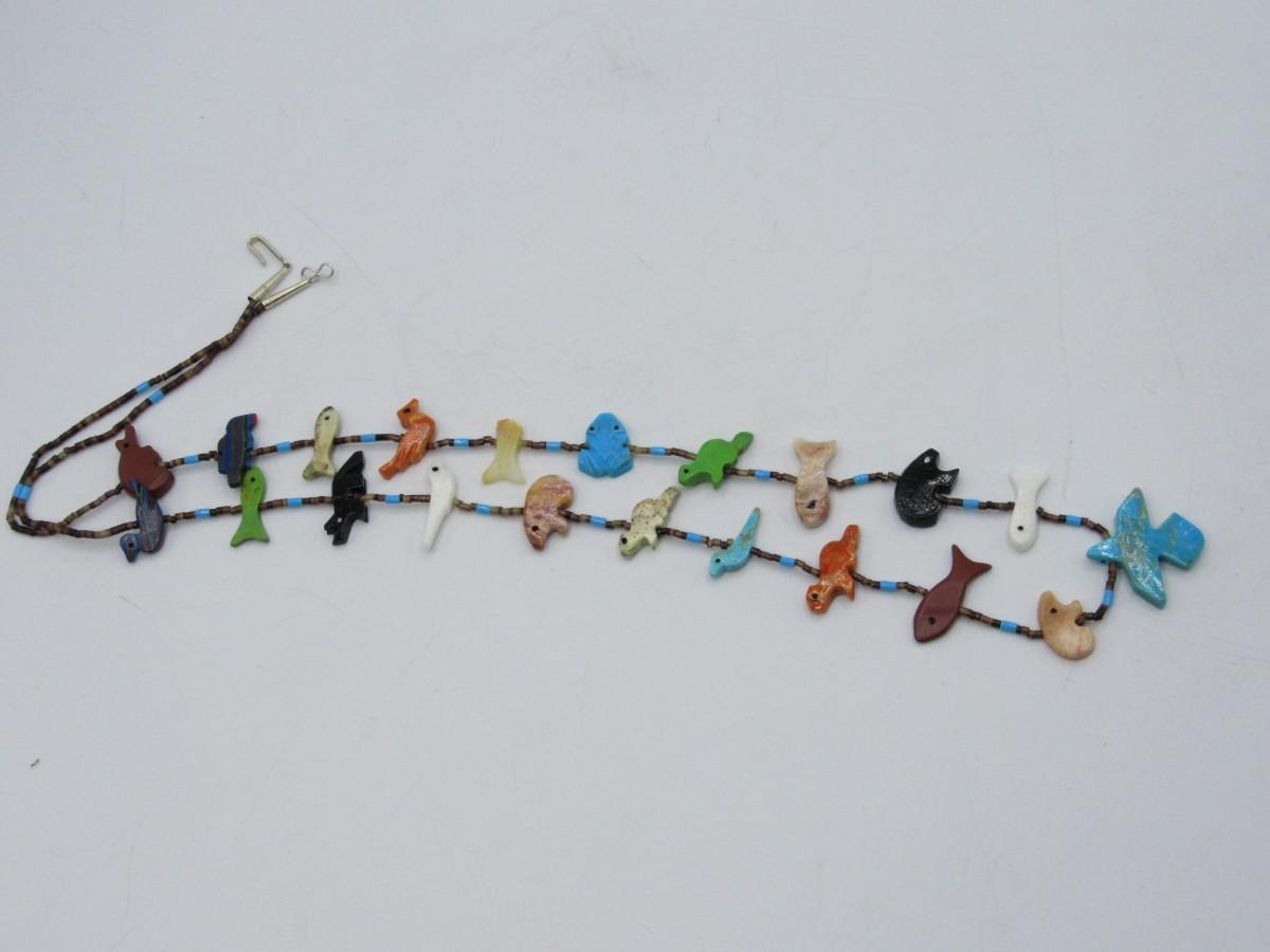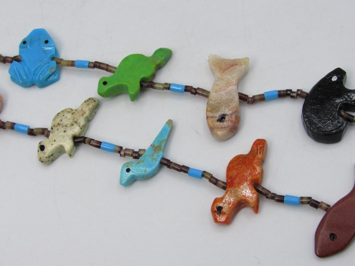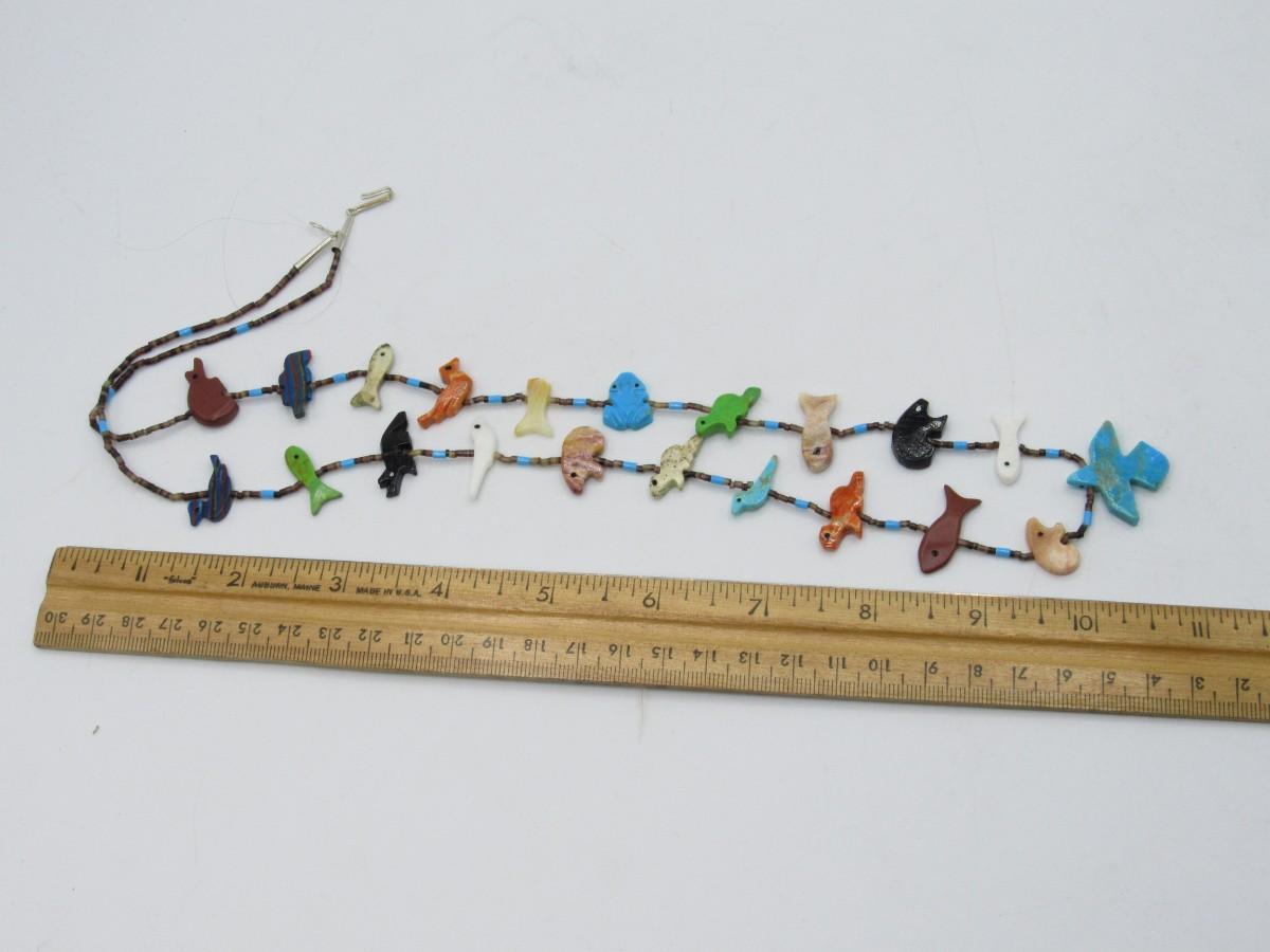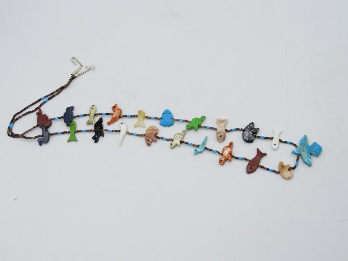 Assorted animal fetish necklace with turquoise thunderbird, bear, fish, turtle, etc