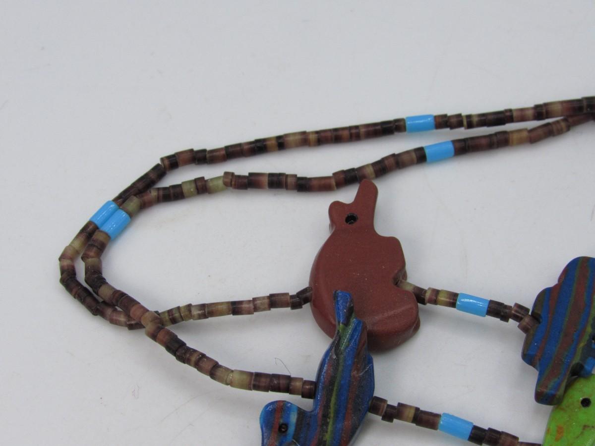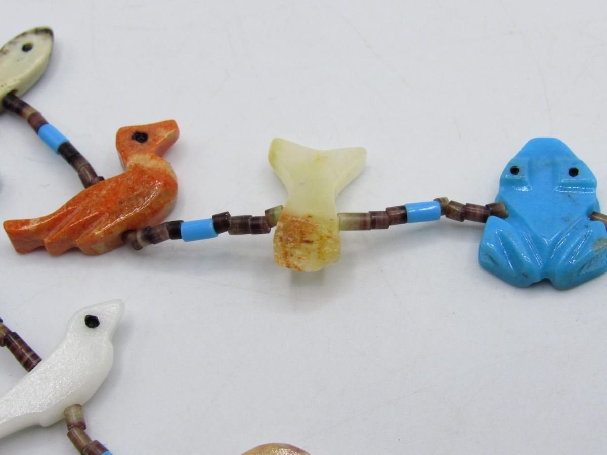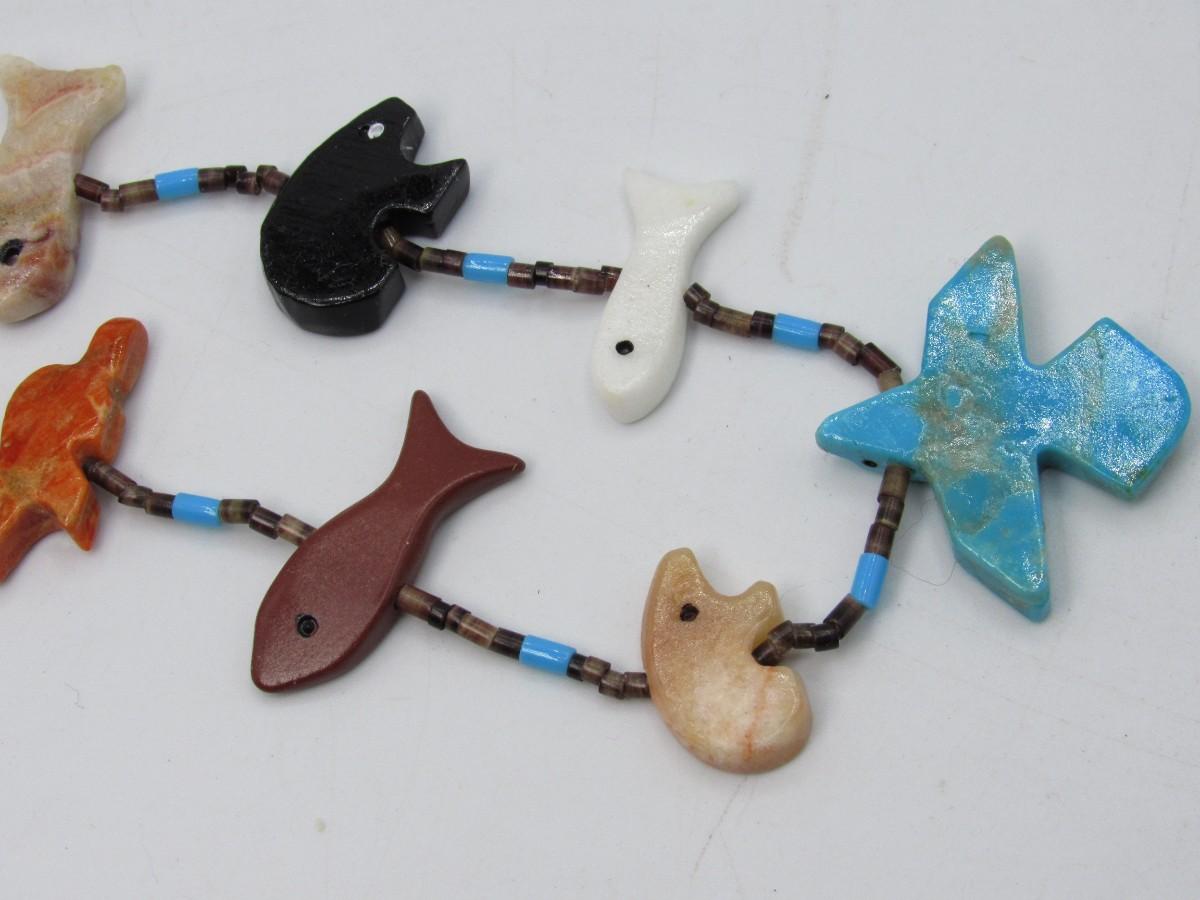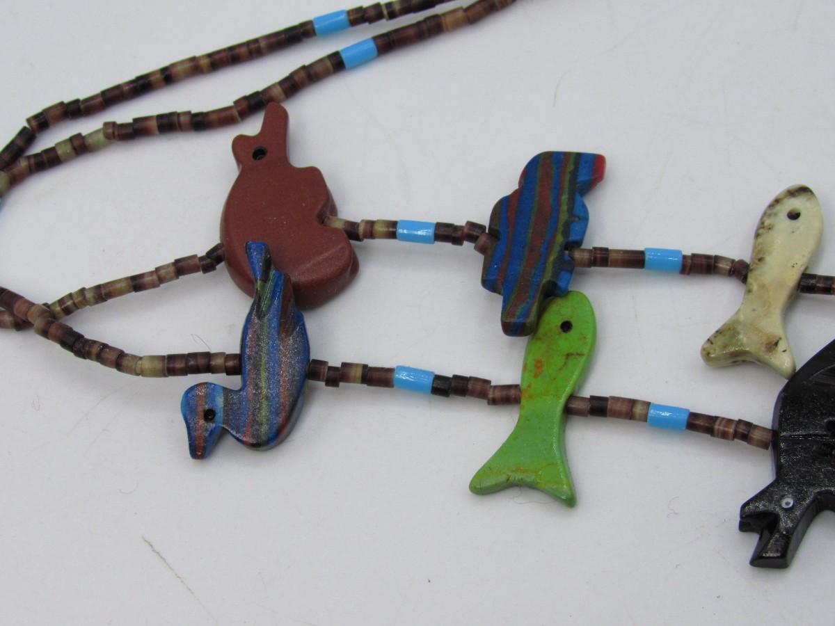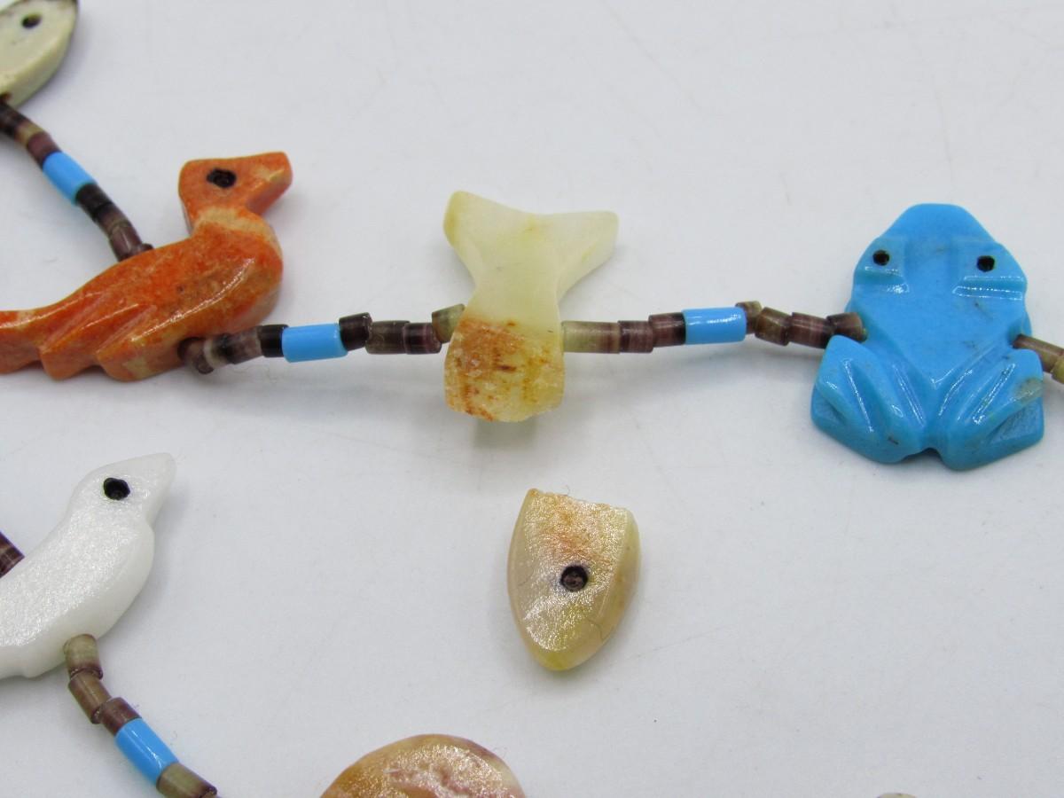 Assorted animal fetish necklace with turquoise thunderbird, bear, fish, turtle, etc