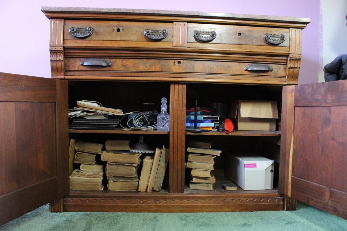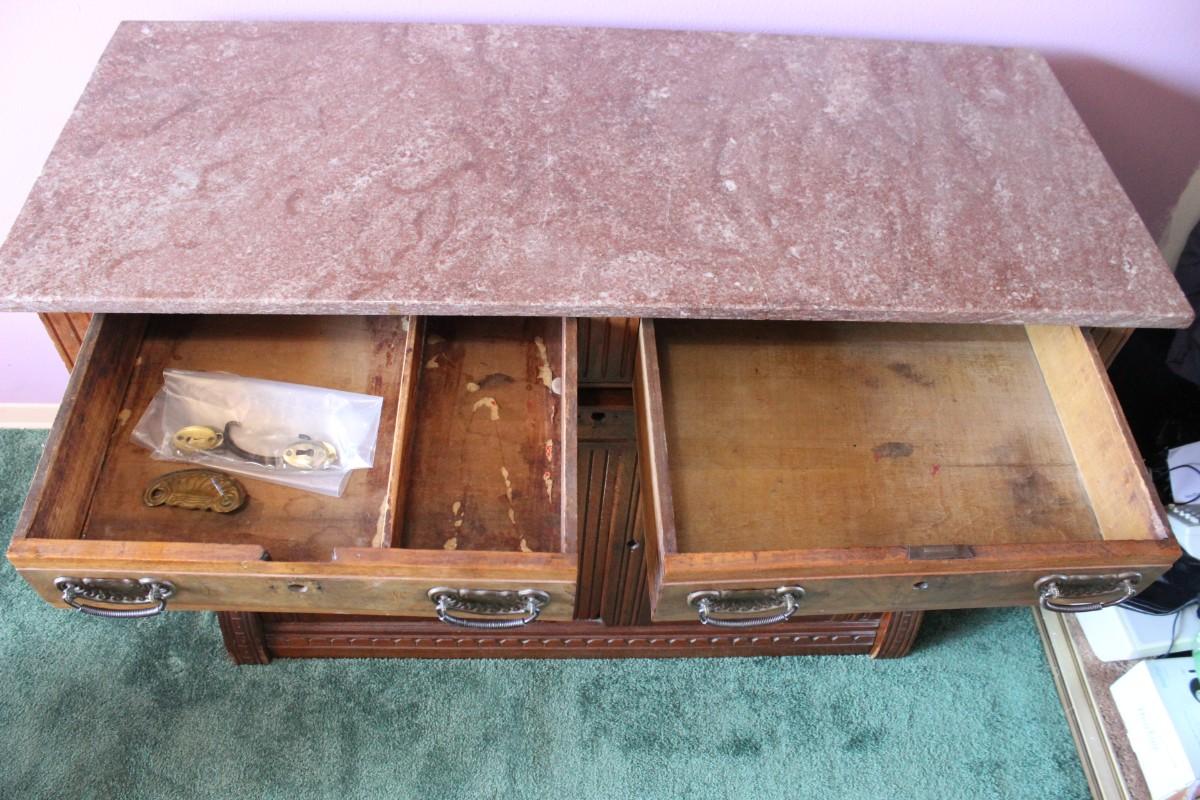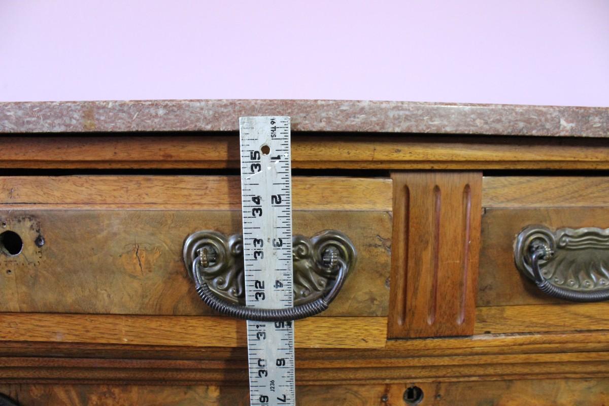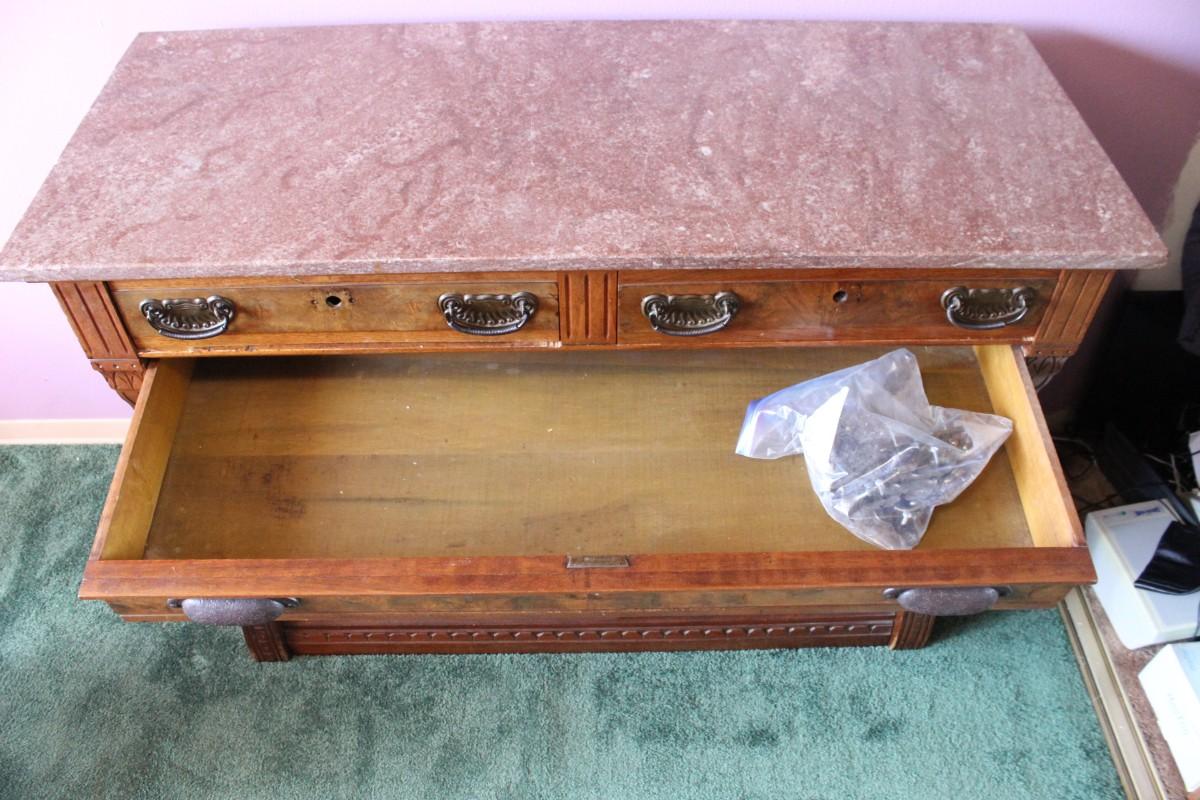 Antique marble top sideboard cabinet. Carved details to the cabinet doors and edges. Marble top is a mauve/ pink color. Locks have been removed. There's no significant cracks or chips to the piece and it is in good antique condition. Check pictures for more details. Check pictures for more details and for sizing. Two small drawers, one full size drawer, and lower cabinet. Items in pictures not included, cabinet only. LOCAL PICK UP IN FULLERTON.