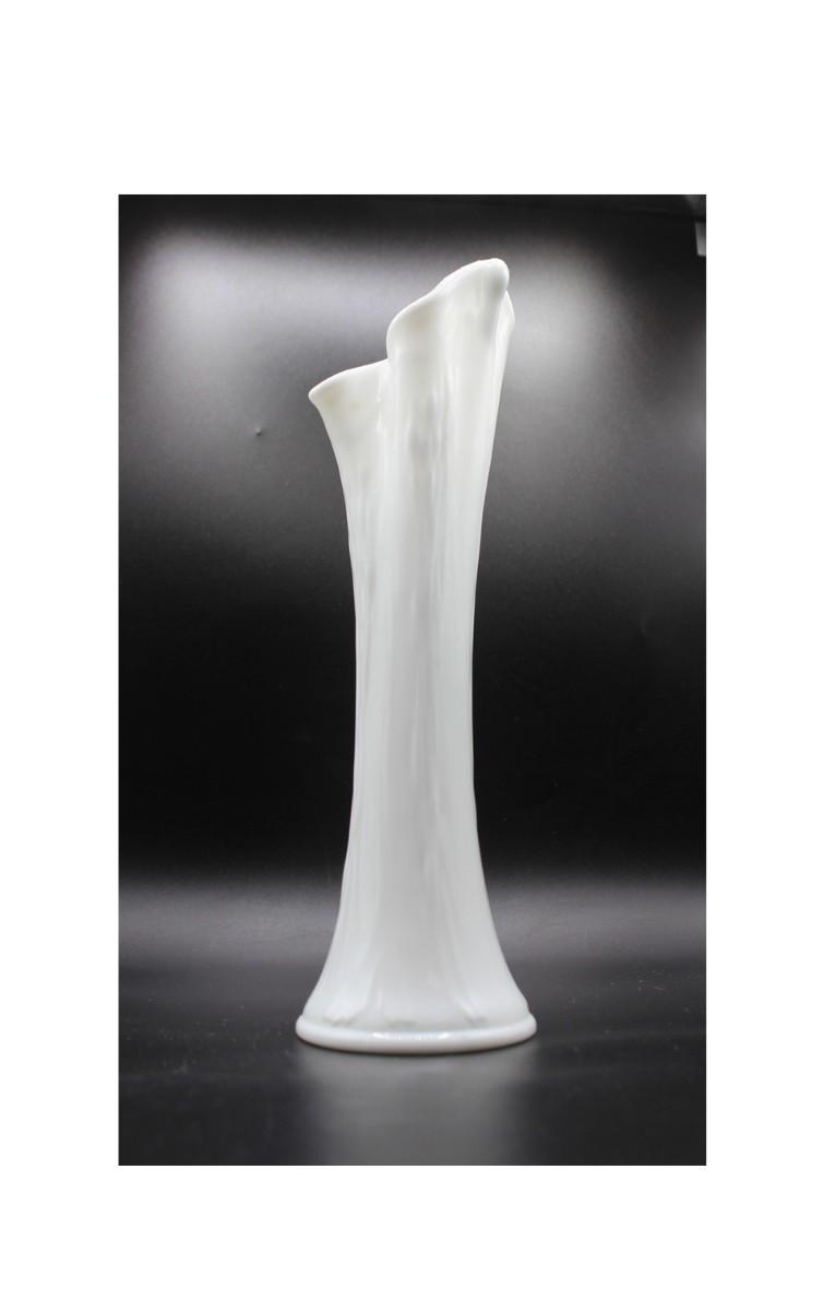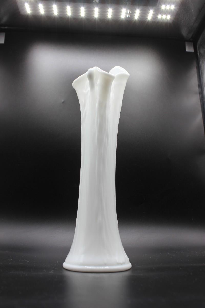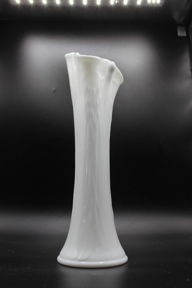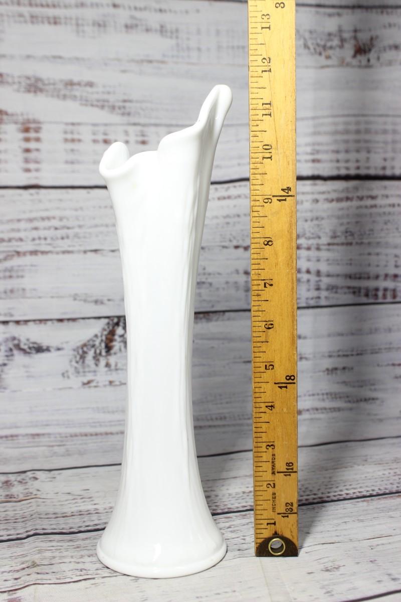 Imperial Glass Vintage Retro Textured Milk Glass Ruffled Rim Slim Swung Vase. Marked on the bottom. there's no cracks or chips to the piece and is in good vintage condition. Check pictures for more details and for sizing.