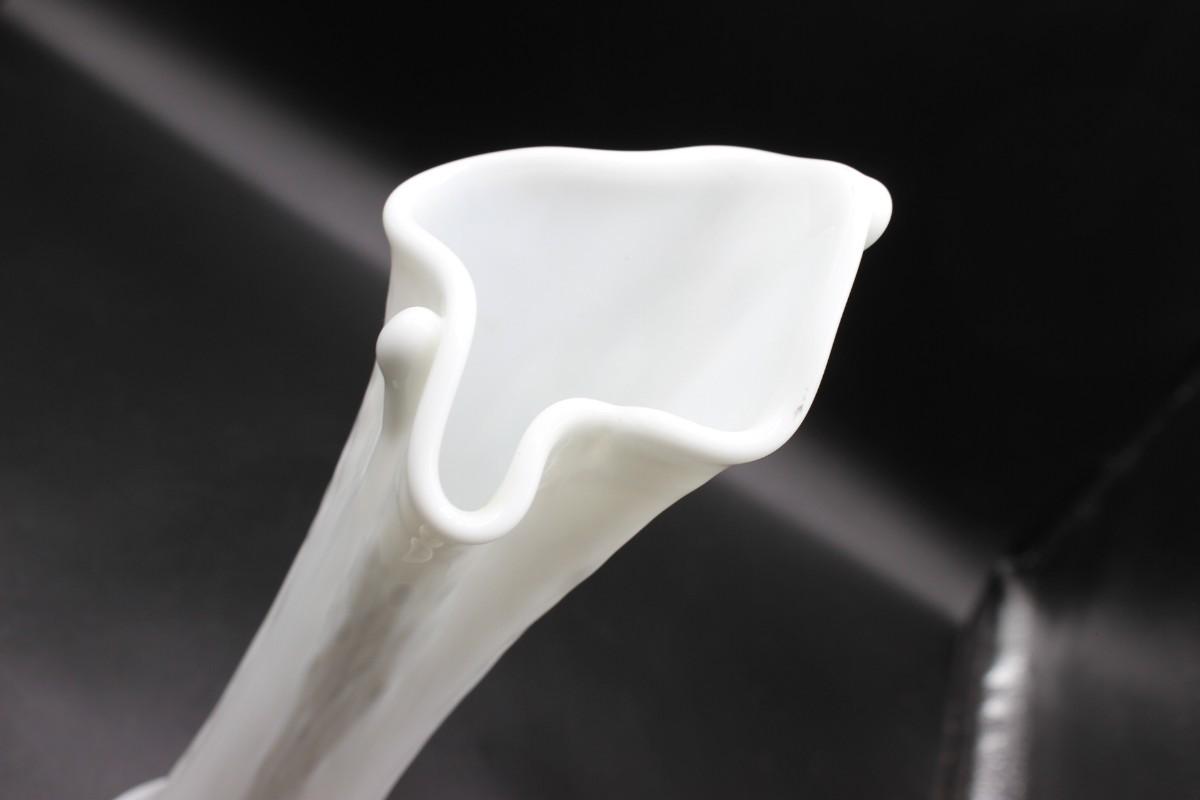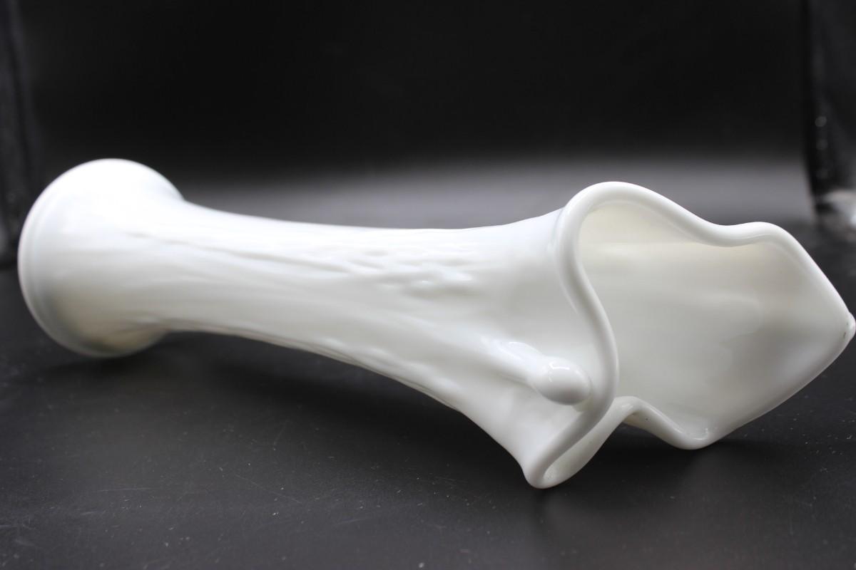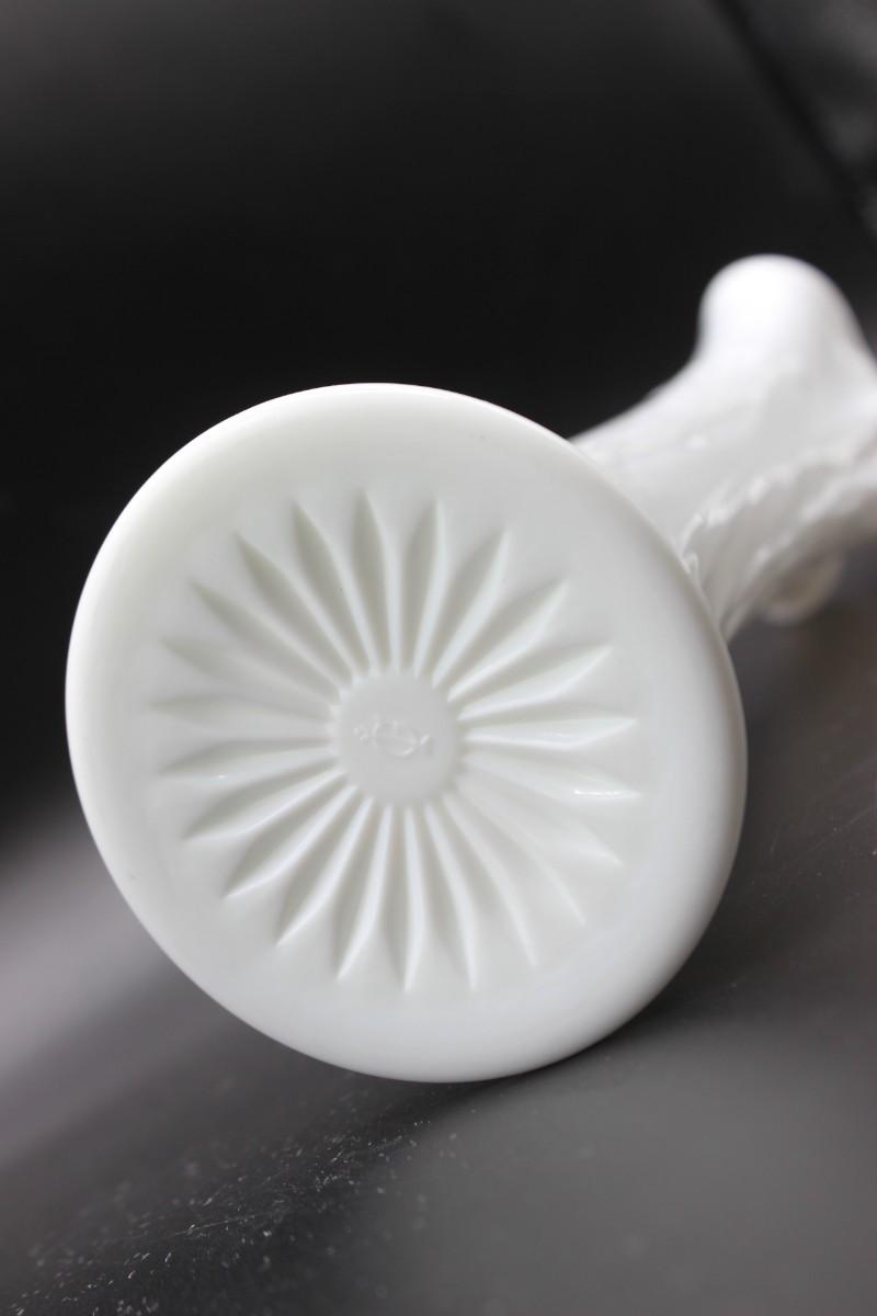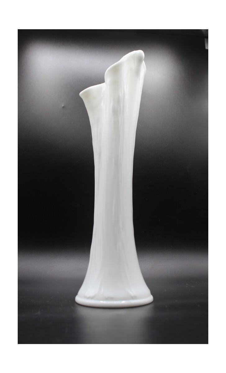 Imperial Glass Vintage Retro Textured Milk Glass Ruffled Rim Slim Swung Vase. Marked on the bottom. there's no cracks or chips to the piece and is in good vintage condition. Check pictures for more details and for sizing.