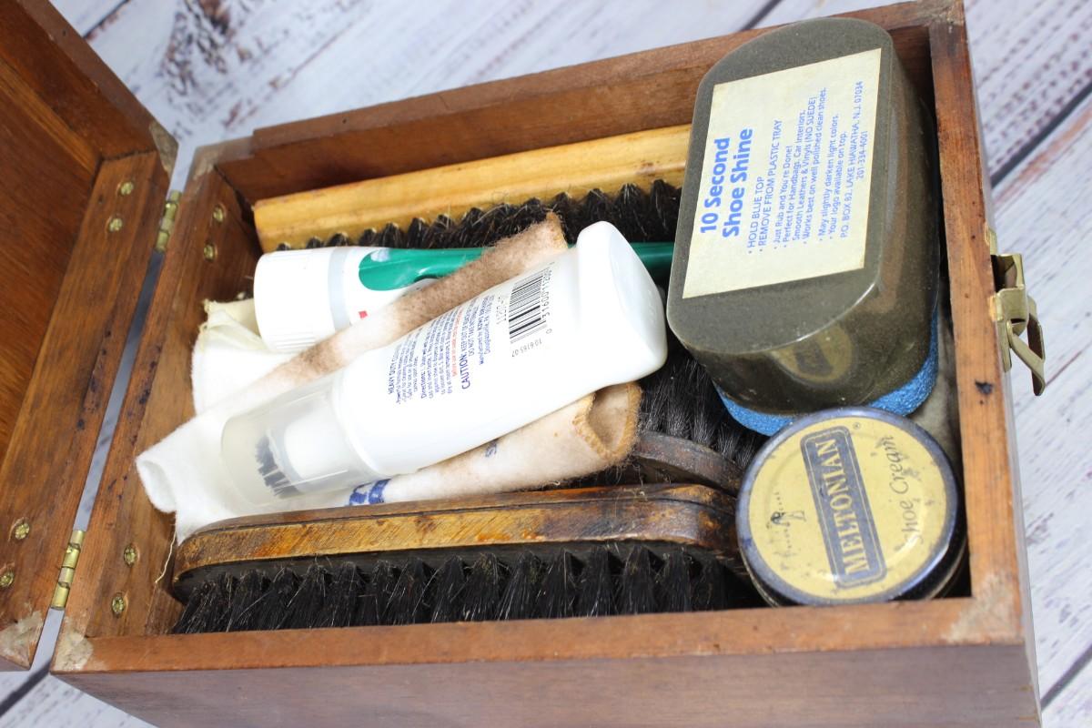 Vintage Wooden Shoe Shine Kit with Brushes, Polishes, Cloths & More