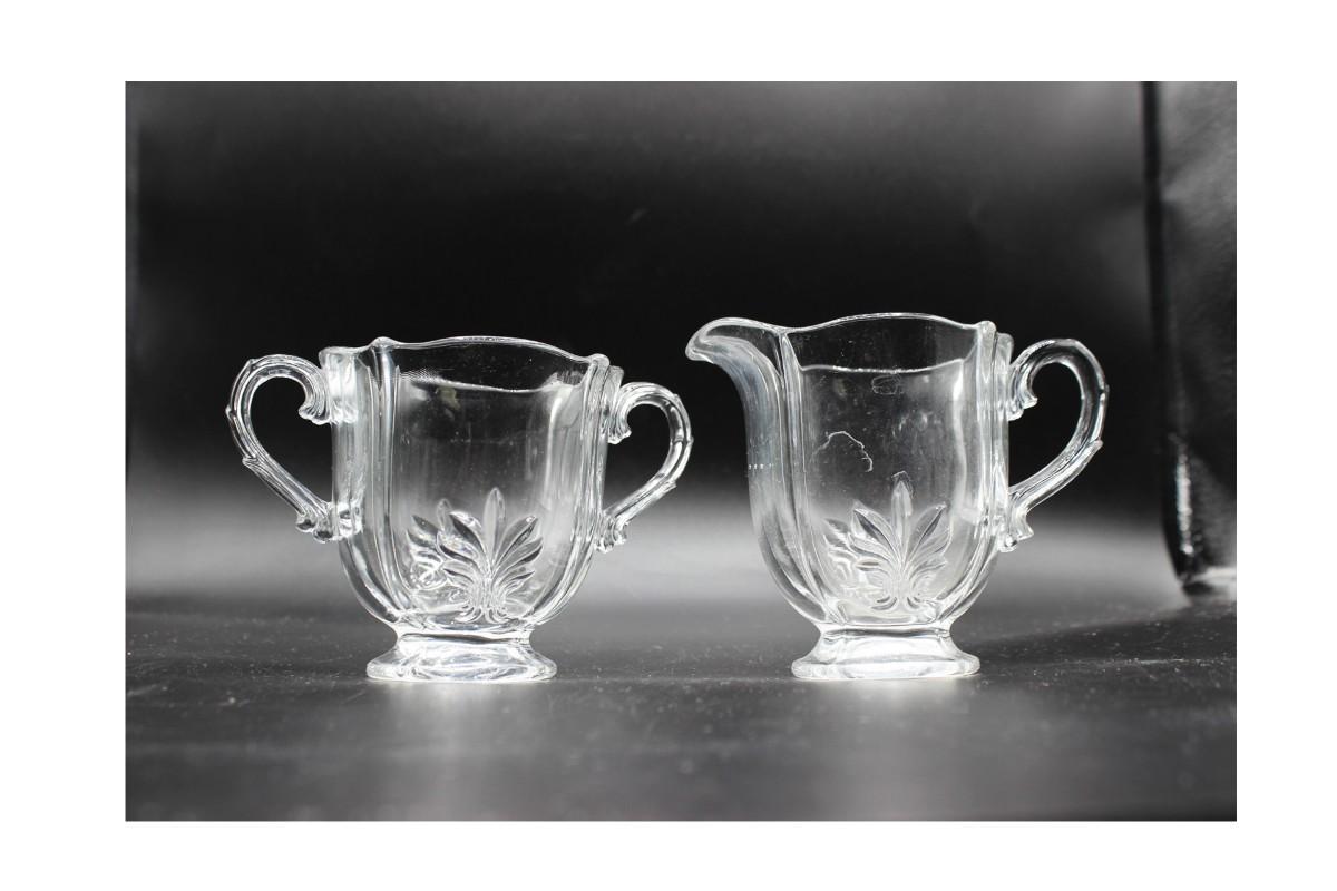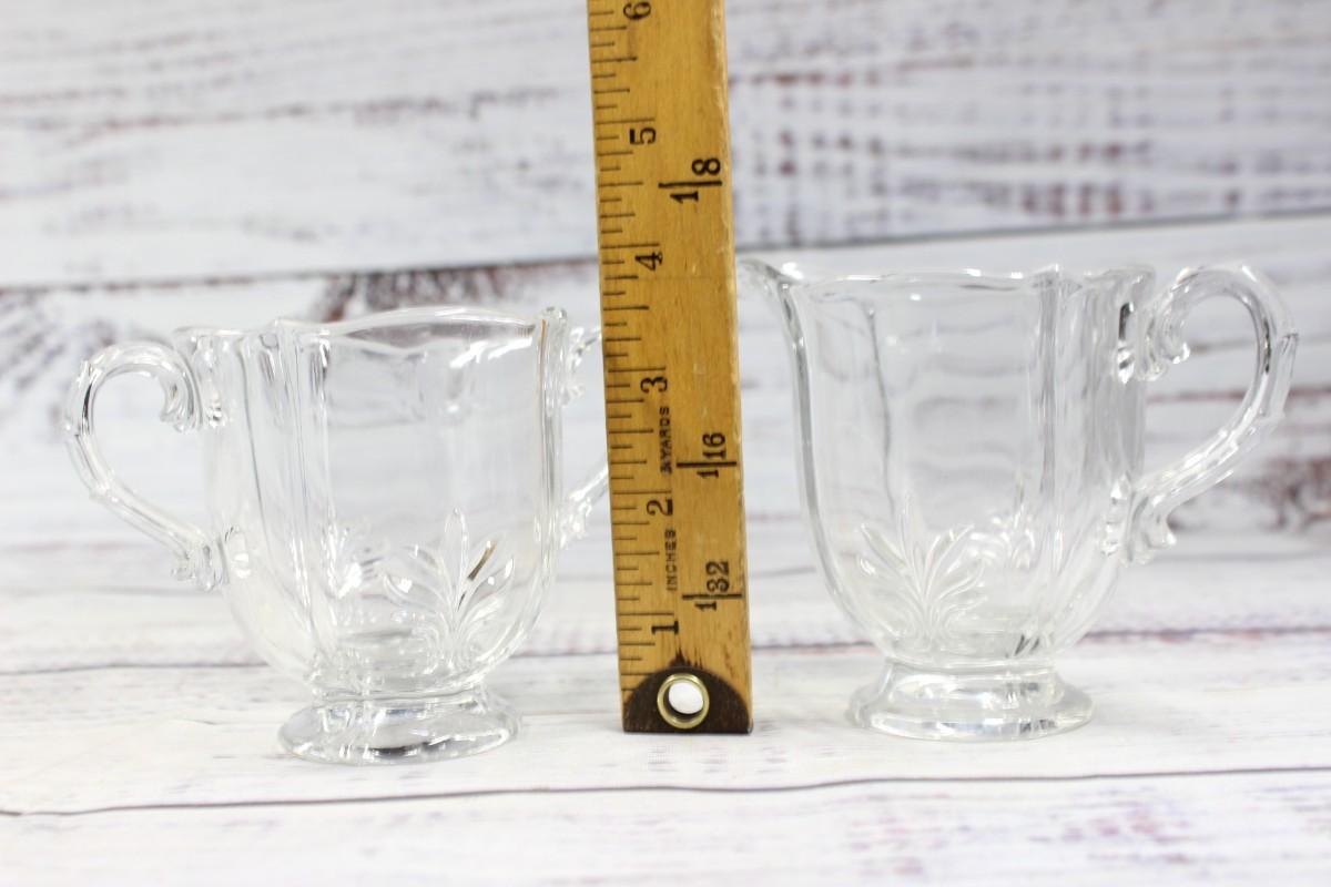 Pair of Vintage Clear Glass Cream & Sugar Teaware, there are no cracks or chips to the piece and is in good vintage condition. Check pictures for more details and for sizing.